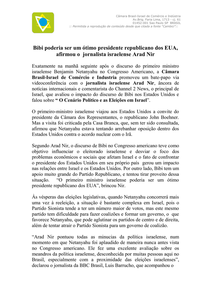 Câmara Brasil-Israel de Comércio e Indústria Av.Brig. Faria Lima, 1713 - cj. 61 01452-001 Sao Paulo SP BRASIL :: Permitida a reprodução de conteúdo desde que citada a fonte “Cambici”:: Bibi poderia ser um ótimo presidente republicano dos EUA, afirmou o jornalista israelense Arad Nir Exatamente na manhã seguinte após o discurso do primeiro ministro israelense Benjamin Netanyahu no Congresso Americano, a Câmara Brasil-Israel de Comércio e Industria promoveu um bate-papo via videoconferência com o jornalista israelense Arad Nir, âncora de notícias internacionais e comentarista do Channel 2 News, o principal de Israel, que avaliou o impacto do discurso de Bibi nos Estados Unidos e falou sobre “ O Cenário Político e as Eleições em Israel”. O primeiro-ministro israelense viajou aos Estados Unidos a convite do presidente da Câmara dos Representantes, o republicano John Boehner. Mas a visita foi criticada pela Casa Branca, que, sem ter sido consultada, afirmou que Netanyahu estava tentando arrebanhar oposição dentro dos Estados Unidos contra o acordo nuclear com o Irã. Segundo Arad Nir, o discurso de Bibi no Congresso americano teve como objetivo influenciar o eleitorado israelense e desviar o foco dos problemas econômicos e sociais que afetam Israel e o fato de confrontar o presidente dos Estados Unidos em seu próprio país gerou um impacto nas relações entre Israel e os Estados Unidos. Por outro lado, Bibi tem um apoio muito grande do Partido Republicano, e tentou tirar proveito dessa situação. “O primeiro ministro israelense poderia ser um ótimo presidente republicano dos EUA”, brincou Nir. Às vésperas das eleições legislativas, quando Netanyahu concorrerá mais uma vez à reeleição, a situação é bastante complexa em Israel, pois o Partido Sionista tende a ter um número maior de votos, mas este mesmo partido tem dificuldade para fazer coalizões e formar um governo, o que favorece Netanyahu, que pode aglutinar os partidos de centro e de direita, além de tentar atrair o Partido Sionista para um governo de coalizão. “Arad Nir pontuou todas as minucias da política israelense, num momento em que Netanyahu foi aplaudido de maneira nunca antes vista no Congresso americano. Ele fez uma excelente avaliação sobre os meandros da política israelense, desconhecida por muitas pessoas aqui no Brasil, especialmente com a proximidade das eleições israelenses”, declarou o jornalista da BBC Brasil, Luis Barrucho, que acompanhou o Câmara Brasil-Israel de Comércio e Indústria Av.Brig. Faria Lima, 1713 - cj. 61 01452-001 Sao Paulo SP BRASIL :: Permitida a reprodução de conteúdo desde que citada a fonte “Cambici”:: evento. “Arad Nir nos apresentou de maneira bastante clara o instável quadro político no Oriente Médio, foi um privilégio poder contar com as considerações deste renomado jornalista”, destacou o presidente da Câmara Brasil-Israel de Comércio e Industria, Jayme Blay. O evento aconteceu nesta quarta-feira, 04 de março, no Microsoft Technology Center . Mais informações para a imprensa Liane Gotlib Zaidler E-mail:[email protected] Tel: (11) 3862.8258 / (11) 9.8277.0606