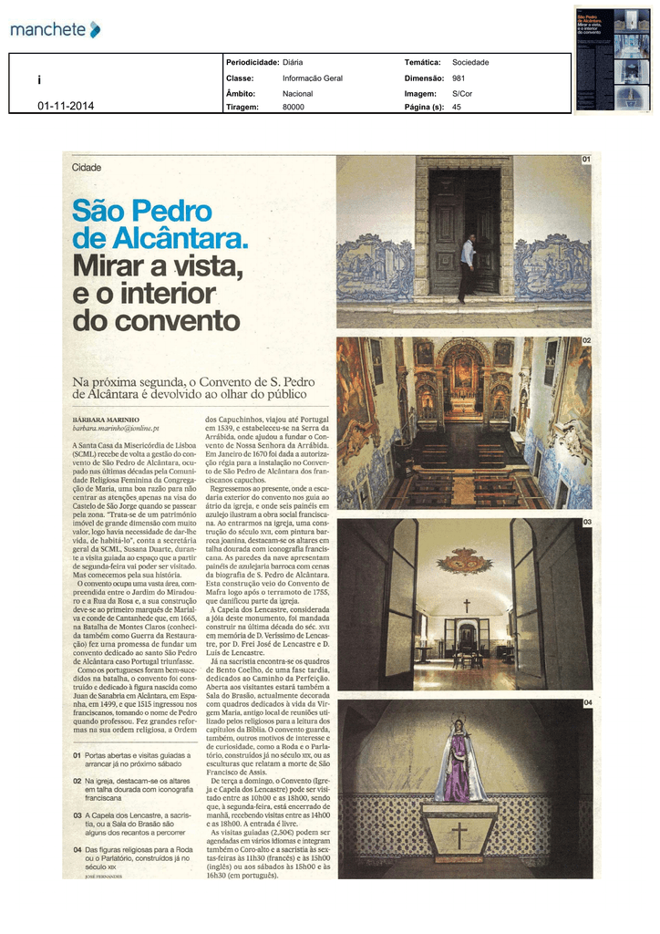 Periodicidade: Diária Temática: Sociedade i Classe: Informação Geral Dimensão: 981 01112014 Âmbito: Nacional Imagem: S/Cor Tiragem: 80000 Página (s): 45 São Pedro de Alcântara Mirar a vista e o interior do convento Na próxima segunda o Convento de S Pedro de Alcântara é devolvido ao olhar do público BARBARA MARINHO dos Capuchinhos viajou até Portugal em 1539 e estabeleceu se na Serra da Arrábida onde ajudou a fundar o Con A Santa Casa da Misericórdia de Lisboa SCML recebe de volta a gestão do con vento de Nossa Senhora da Arrábida Em Janeiro de 1670 foi dada a autoriza vento de São Pedro de Alcântara ocu ção régia para a instalação no Conven pado nas últimas décadas pela Comuni dade Religiosa Feminina da Congrega ção de Maria uma boa razão para não centrar as atenções apenas na visa do Castelo de São Jorge quando se passear pela zona Trata se de um património imóvel de grande dimensão com muito valor logo havia necessidade de dar lhe to de São Pedro de Alcântara dos fran vida de habitá lo conta a secretária geral da SCML Susana Duarte duran te a visita guiada ao espaço que a partir de segunda feira vai poder ser visitado Mas comecemos pela sua história O convento ocupa uma vasta área com preendida entre o Jardim do Miradou ro e a Rua da Rosa e a sua construção deve se ao primeiro marquês de Marial va e conde de Cantanhede que em 1665 na Batalha de Montes Claros conheci ciscanos capuchos Regressemos ao presente onde a esca daria exterior do convento nos guia ao átrio da igreja e onde seis painéis em azulejo ilustram a obra social francisca na Ao entrarmos na igreja uma cons trução do XVII com pintura bar roca joanina destacam se os altares em talha dourada com iconografia francis cana As paredes da nave apresentam painéis de azulejaria barroca com cenas da biografia de S Pedro de Alcântara Esta construção veio do Convento de Mafra logo após o terramoto de 1755 que danificou parte da igreja A Capela dos Lencastre considerada a jóia deste monumento foi mandada construir na última década do XVII da também como Guerra da Restaura em memória de D Veríssimo de Lencas ção fez uma promessa de fundar um tre por D Frei José de Lencastre e D convento dedicado ao santo São Pedro Luís de Lencastre de Alcântara caso Portugal triunfasse Como os portugueses foram bem suce Já na sacristia encontra se os quadros de Bento Coelho de uma fase tardia dedicados ao Caminho da Perfeição didos na batalha o convento foi cons truído e dedicado à figura nascida como Aberta aos visitantes estará também a Juan de Sanabria em Alcântara em Espa nha em 1499 e que 1515 ingressou nos franciscanos tomando o nome de Pedro Sala do Brasão actualmente decorada quando professou Fez grandes refor mas na sua ordem religiosa a Ordem com quadros dedicados à vida da Vir gem Maria antigo local de reuniões uti lizado pelos religiosos para a leitura dos capítulos da Bíblia O convento guarda também outros motivos de interesse e de curiosidade como a Roda e o Parla tório construídos já no século xix ou as esculturas que relatam a morte de São Francisco de Assis De terça a domingo o Convento Igre ja e Capela dos Lencastre pode ser visi tado entre as l0h00 e as 18h00 sendo que à segunda feira está encerrado de manhã recebendo visitas entre as 14h00 e as 18h00 A entrada é livre As visitas guiadas 2 50€ podem ser agendadas em vários idiomas e integram também s feirasa oàsCoro llh30 taltox francês e a sacristia ee s às às15h00 inglês ou aos sábados às 15h00 e às 16h30 em português século séc