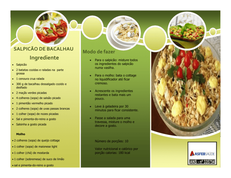 SALPICÃO DE BACALHAU Salpicão Ingrediente s 2 batatas cozidas e raladas na parte grossa 1 cenoura crua ralada 300 g de bacalhau dessalgado cozido e desfiado 2 maçãs verdes picadas Modo de fazer Para o salpicão: misture todos os ingredientes do salpicão numa vasilha. Para o molho: bata o cottage no liquidificador até ficar cremoso. Acrescente os ingredientes restantes e bata mais um pouco. Leve à geladeira por 30 minutos para ficar consistente. Passe a salada para uma travessa, misture o molho e decore a gosto. 4 colheres (sopa) de salsão picado 1 pimentão vermelho picado 2 colheres (sopa) de uvas passas brancas 1 colher (sopa) de nozes picadas Sal e pimenta-do-reino a gosto Salsinha a gosto picada Molho 2 colheres (sopa) de queijo cottage 1 colher (sopa) de maionese light 1 colher (chá) de mostarda 1 colher (sobremesa) de suco de limão sal e pimenta-do-reino a gosto Número de porções: 10 Valor nutricional e calórico por porção calorias: 180 kcal [Street Address] [City], [State] [Postal Code] Phone: [Your Phone] Web: [Web Address] Lorem Ipsum