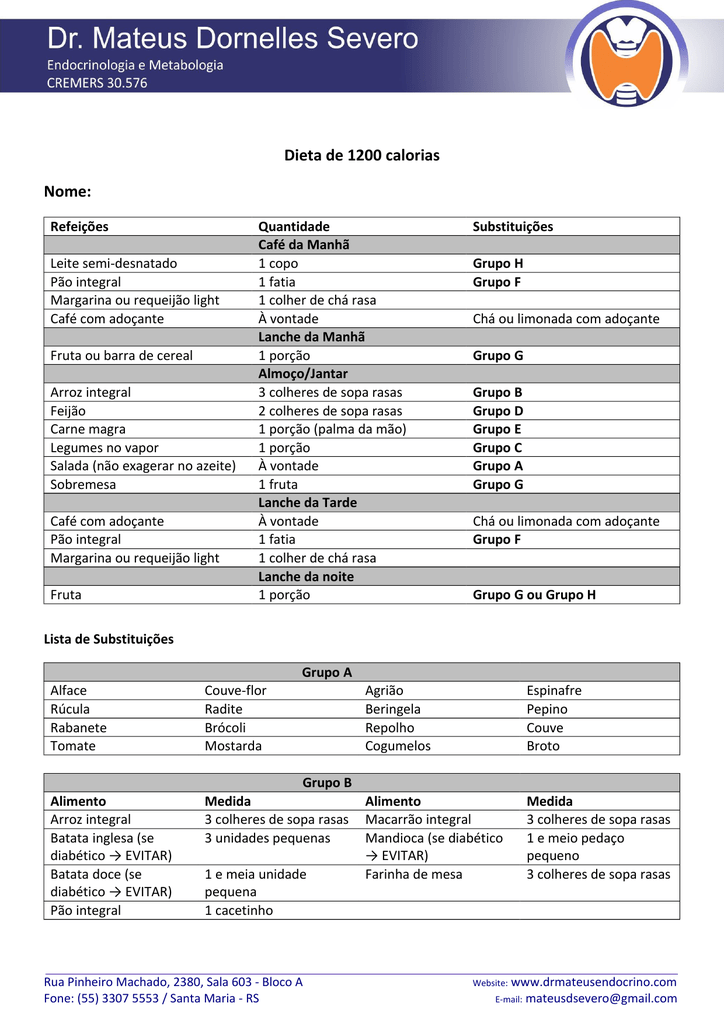 Dieta de 1200 calorias Nome: Refeições Leite semi-desnatado Pão integral Margarina ou requeijão light Café com adoçante Fruta ou barra de cereal Arroz integral Feijão Carne magra Legumes no vapor Salada (não exagerar no azeite) Sobremesa Café com adoçante Pão integral Margarina ou requeijão light Fruta Quantidade Café da Manhã 1 copo 1 fatia 1 colher de chá rasa À vontade Lanche da Manhã 1 porção Almoço/Jantar 3 colheres de sopa rasas 2 colheres de sopa rasas 1 porção (palma da mão) 1 porção À vontade 1 fruta Lanche da Tarde À vontade 1 fatia 1 colher de chá rasa Lanche da noite 1 porção Substituições Grupo H Grupo F Chá ou limonada com adoçante Grupo G Grupo B Grupo D Grupo E Grupo C Grupo A Grupo G Chá ou limonada com adoçante Grupo F Grupo G ou Grupo H Lista de Substituições Grupo A Alface Rúcula Rabanete Tomate Couve-flor Radite Brócoli Mostarda Agrião Beringela Repolho Cogumelos Espinafre Pepino Couve Broto Alimento Macarrão integral Mandioca (se diabético → EVITAR) Farinha de mesa Medida 3 colheres de sopa rasas 1 e meio pedaço pequeno 3 colheres de sopa rasas Grupo B Alimento Arroz integral Batata inglesa (se diabético → EVITAR) Batata doce (se diabético → EVITAR) Pão integral Medida 3 colheres de sopa rasas 3 unidades pequenas 1 e meia unidade pequena 1 cacetinho Rua Pinheiro Machado, 2380, Sala 603 - Bloco A Fone: (55) 3307 5553 / Santa Maria - RS www.drmateusendocrino.com E-mail: [email protected] Website: Dieta de 1200 calorias (continuação) Alimento Beterraba Ervilha enlatada Palmito em conserva Cenoura Vagem Grupo C Medida Meia unidade 3 colheres de sopa 1 prato de sobremesa 1 un. tamanho médio 1 pires de café Alimento Feijão Medida 2 colheres de sopa Alimento Abóbora Abobrinha Pimentão Chuchu Medida 1 pires de chá 1 prato de sobremesa 2 un. tamanho médio Meia un. tamanho médio Alimento Lentilha Medida 2 colheres de sopa Alimento Filé de frango Filé de peixe Hamburguer Músculo Ovo Sardinha Medida 1 porção (mão inteira) 1 porção (mão inteira) 1 unidade 1 porção (palma da mão) 1 unidade 1 unidade Grupo D Grupo E Alimento Carne de vaca Carne de porco Charque Coração de frango Coxa de frango Salsicha Medida 1 porção (palma da mão) 1 porção (palma da mão) Meia porção (meia palma) 5 unidades 1 unidade sem pele 1 unidade Alimento Pão integral Torradas Medida 1 fatia 2 fatias Alimento Bolacha salgada integral Cacetinho integral Medida 2 unidades Meia unidade Alimento Abacate Abacaxi Ameixa Banana Melão Pêra Figo Jaboticaba Laranja Grupo G Medida 1 colher sopa cheia 1 rodela 2 un. tamanho médio 1 un. tamanho médio 1 fatia grande Meia unidade 1 un. tamanho médio 2 pires de chá 1 un. tamanho médio Alimento Maçã Mamão Maracujá Melancia Morango Goiaba Pêssego Bergamota Uva Medida Meia unidade 1 fatia 1 un. Tamanho médio 1 fatia grande 8 unidades 1 un. tamanho pequeno 1 un. tamanho grande 1 un. tamanho médio 12 grãos Alimento Leite semi-desnatado Leite em pó Queijo mussarela/prato Iogurte natural light Medida 1 copo (200 mL) 1 colher de sopa 1 fatia 1 copo (200 mL) Alimento Leite desnatado Leite em pó desnatado Queijo ricota/minas Medida 1 copo e meio (300 mL) 2 colheres de sopa 1 fatia grande Grupo F Grupo H Rua Pinheiro Machado, 2380, Sala 603 - Bloco A Fone: (55) 3307 5553 / Santa Maria - RS www.drmateusendocrino.com E-mail: [email protected] Website: