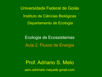 Universidade Federal de Goiás Instituto de Ciências Biológicas Departamento de Ecologia Ecologia de Ecossistemas Aula 2: Fluxos de Energia Prof. Adriano S. Melo asm.adrimelo naquele gmail.com Leis da termodinâmica 1a - conservação energia 2a - aumento da entropia Produto em pé (standing crop) (kg*m-2 ou Kcal*m-2) Produtividade (kg*m-2 *ano-1) primária secundária Produção primária bruta e líquida Produtividade Produto em pé Produtividade Produto em pé Esquema simplificado de fluxos de energia Energia luminosa Produtores Respiração Herbívoros 6CO2 + 6H2O C6H12O6 + 6O2 Cada 2g de C fixado gasta cerca de 1000g de água “transpirada” Da energia solar: 30% é refletida para o espaço 20% absorvida pela atmosfera 50% absorvida como calor pelo solo <1% é aproveitada na fotossíntese Decompositores Respiração Carnívoros Silver Springs, Florida valores em Kcal/m2/ano 460 adaptado de Pianka 1994, a partir de Teal e Odum 5 Decomposit. 20 Prod. bruta respiração 410 Prod. Liq. 3,4 0,4 Herbívoros 2 0,3 0,01 Calor 408 2,5 Carnívoros 0,01 Carnív. topo exportação 4,6 A energia sempre é totalmente degradada? Importância dos decompositores Uso de 100 Kcal para cada 100 Kcal de produção primária líquida O que não é consumido na primeira rodada fica disponível para a próxima Total de Kcal assimiladas por decompositores é de 157 Kcal por cada 100 Kcal de PPL, devido habilidade de “consumir” a matéria orgânica mais de uma vez Como em todas generalizações, existem exceções... Nem todos consumidores são encaixados perfeitamente em cada compartimento Herbívoros as vezes comem matéria orgânica morta Carnívoros as vezes comem herbívoros, detritívoros e eventualmente plantas Alguns animais mudam sua dieta conforme crescem Onde encaixar os onívoros? Respiração S.G. PPL Respiração Decomposit. MOM Floresta Respiração Respiração S.G. PPL Respiração Decomposit. MOM Campo Respiração Respiração Respiração S.G. Decomposit. S.G. Decomposit. PPL MOM PPL MOM Comunidade planctônica Riacho Material alóctone Elton (1927): Pirâmide de números e tamanhos Lindemann (1942) Pirâmide de energia Eficiência Ecológica (Pn/Pn-1)*100 Previsão de que apenas 10% da energia é passada para o nível seguinte Valores reais entre 2 e 24%, com media em 10,13%. Pirâmide de biomassa ou números (produto em pé) Pirâmide de energia (produtividade) Carnívoros Herbívoros Produtores Pirâmides invertidas (biomassa) (números) Carnívoros Herbívoros Produtores Eficiência de Consumo Alguns valores de Eficiência de Consumo: (In/Pn-1)*100, onde Planta Herbívoro EC (%) In = ingestão no nível n invertebrados 5-11 Pn-1 = produtividade no nível n-1 árvores = proporção da produtividade total disponível no nível n-1 (e.g. produtores) que é consumida pelo nível n (e.g. herbívoros) “gramíneas” invertebrados 0,5-15 macrófitas bivalve 11 macrófitas outros herbívoros 18,9 fitoplâncton zooplâncton 40 Eficiência de Assimilação = (An/In)*100, onde An=assimilado (absorvido pelo intestino) pelo nivel n do que foi ingerido. Alguns valores de Eficiência de Assimilação 20-50% para herbívoros, detritívoros e microbívoros 80% para carnívoros Qual a razão de carnívoros terem valores maiores de EA? Todas as partes da planta são igualmente “assimiláveis” ? 15% = 50% = 60-70% = Eficiência de Produção = (Pn/An)*100 = proporção da energia assimilada que é incorporada como biomassa. Alguns valores de Eficiência de Produção Secundária 30-40% invertebrados em geral 10% vertebrados ectotermos 1-2% vertebrados endotermos <1% vertebrados endotermos de pequeno porte Eficiência Ecológica (Lindemann 1942) = (Pn/Pn-1)*100 = eficiências de (consumo)*(assimilação)*(produção) Eficiência de Consumo = (In/Pn-1)*100 Eficiência de Assimilação = (An/In)*100 Eficiência de Produção = (Pn/An)*100 Vertebrado ectotérmico R P Carnívoro P Herbívoro R A/I 50% P/A 10% A A/I 80% P/A 10% A F I I Vertebrado endototérmico R P A R A/I 50% P/A 2% I F F P A A/I 80% P/A 2% I F Extendendo a idéia para níveis tróficos... Energia disponível para próximo nível trófico P R A F Entrada de energia I 3 caçadores 2 predadores frugívoros granívoros 0 1 pastadores -1 Área de vida (log10)(acres) Algumas consequências ecológicas... -2 -1 0 1 Peso (log10)(kg) 2 3 Algumas consequências ecológicas... Produção total terrestre = 224 bilhões toneladas por ano 41% em sistemas aquáticos 59% em sistemas terrestres cerca de 35-40% são consumidos por humanos Em 1980, captura de 75 milhões de toneladas de peixes Qual a produção de algas necessária para produzir 75 milhões de toneladas de peixes? Assumindo que -10% de Eficiência Ecológica -cadeias alimentares costeiras com 1,5 níveis tróficos Precisamos de 24-35% da produção total de ecossistema costeiros Populações humanas maiores se ingerirmos mais plantas... Apenas 1% chega no 3o nível trófico Comer carne é um luxo!