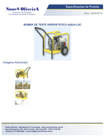 Data: 30/09/2016 BOMBA DE TESTE HIDROSTÁTICO AQUA-LOC Imagens Adicionais: Data: 30/09/2016 Especificações do Produtos: A Bomba de Teste Hidrostático Aqua-Loc foram projetadas para vias de água de teste de pressão e canos principais de força de esgoto, como prescrito pela Instalação C600 padrão AWWA de canos Principais de Água de Ferro Fundido Dúctil e Instalação C605 de Cano de Pressão PVC. Características: l l l l l l l l Motor 5.5HP; Bomba Diafragma Gêmea Hypro - 9.5gpm ( 34 lpm)/550PSI; Lida com até 10% de solução de cloro; Pode ser executada seca; Quatro ajustamentos de pressão de saída; Tubos de distribuição integrais - elimina pontos de vazamento; Redução de Engrenagem Incluso - excelente dissipação de calor; Amortecedor de vibração - sem necessidade de oscilar o tanque; Equipado com: l l l l l Estrutura pesada; Rompimento rápido hidráulico - Suporte giratório de bronze; Filtro interno fácil de limpar graças ao reservatório transparente; Mangueira transparente para verificação de fluxo; Indicador de teste preenchido com silicone com estojo de aço inoxidável; Tanque de água: l l l Tanque de polietileno com capacidade para 55 litros; Permite que a bomba seja sustentada por pressão; Estrutura articulada permite fácil acesso ao motor; *Este produto poderá sofrer alterações sem prévio aviso. Data: 30/09/2016