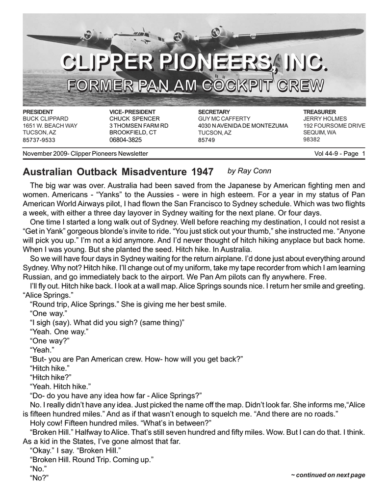 CLIPPER PIONEERS, INC. FORMER PAN AM COCKPIT CREW PRESIDENT BUCK CLIPPARD 1651 W. BEACH WAY TUCSON, AZ 85737-9533 VICE- PRESIDENT CHUCK SPENCER 3 THOMSEN FARM RD BROOKFIELD, CT 06804-3825 SECRETARY GUY MC CAFFERTY 4030 N AVENIDA DE MONTEZUMA TUCSON, AZ 85749 November 2009- Clipper Pioneers Newsletter Australian Outback Misadventure 1947 TREASURER JERRY HOLMES 192 FOURSOME DRIVE SEQUIM, WA 98382 Vol 44-9 - Page 1 by Ray Conn The big war was over. Australia had been saved from the Japanese by American fighting men and women. Americans - “Yanks” to the Aussies - were in high esteem. For a year in my status of Pan American World Airways pilot, I had flown the San Francisco to Sydney schedule. Which was two flights a week, with either a three day layover in Sydney waiting for the next plane. Or four days. One time I started a long walk out of Sydney. Well before reaching my destination, I could not resist a “Get in Yank” gorgeous blonde’s invite to ride. “You just stick out your thumb,” she instructed me. “Anyone will pick you up.” I’m not a kid anymore. And I’d never thought of hitch hiking anyplace but back home. When I was young. But she planted the seed. Hitch hike. In Australia. So we will have four days in Sydney waiting for the return airplane. I’d done just about everything around Sydney. Why not? Hitch hike. I’ll change out of my uniform, take my tape recorder from which I am learning Russian, and go immediately back to the airport. We Pan Am pilots can fly anywhere. Free. I’ll fly out. Hitch hike back. I look at a wall map. Alice Springs sounds nice. I return her smile and greeting. “Alice Springs.” “Round trip, Alice Springs.” She is giving me her best smile. “One way.” “I sigh (say). What did you sigh? (same thing)” “Yeah. One way.” “One way?” “Yeah.” “But- you are Pan American crew. How- how will you get back?” “Hitch hike.” “Hitch hike?” “Yeah. Hitch hike.” “Do- do you have any idea how far - Alice Springs?” No. I really didn’t have any idea. Just picked the name off the map. Didn’t look far. She informs me,“Alice is fifteen hundred miles.” And as if that wasn’t enough to squelch me. “And there are no roads.” Holy cow! Fifteen hundred miles. “What’s in between?” “Broken Hill.” Halfway to Alice. That’s still seven hundred and fifty miles. Wow. But I can do that. I think. As a kid in the States, I’ve gone almost that far. “Okay.” I say. “Broken Hill.” “Broken Hill. Round Trip. Coming up.” “No.” ~ continued on next page “No?” November 2009 - Clipper Pioneers Newsletter Australian Outback Misadventure 1947 Vol 44-9 - Page 2 ~ continued from previous page “No round trip. Just one way.” She is getting exasperated. “I’m telling you! There are no roads!” Every town has a road to the next town. Everyone knows that. I insist. She regards me as maybe someone who could jump over the counter and take her on any minute. Right here in front of everybody. Everybody including two Aussies in uniform. Taking this in. I get my one way ticket. She is not smiling. The Aussies in uniform are flying this twin engine high wing plane. That plane has really good visibility to the ground. “See! Yank. No roads!” They have me up in the cockpit. So I’ll be sure to see this. I’m amazed. Damned if they aren’t right. No roads! Just vague tracks and trails across the desolate outback. But I’ve made up my mind. At Broken Hill. “We are flying on to Alice. We’ll be back in the morning.” They advised,“You be out here at the airport. We’ll take you back to Sydney. No charge.” They don’t know me. “No way. I’ll be gone.” I began my “gone’ by a direct walk from the flying field to where I had seen tracks going my way. Now I wish that I could tell you about those next three days. I’ve got one day left to reach Sydney. And I’m only half way to Sydney. There have been no roads getting here. I know there will be no roads to Sydney. Somehow I’ve ended up in the only public habitation between Broken Hill and Sydney. A hotel. A few buildings. I’m out here. On an outback river. That has not seen water for seven years. Can you believe? Darling? That’s the name of this damn river. “Darling.” And the so-called “town?” That’s darling too. Darling. Halfway to Sydney. One day left. There is absolutely no way to get any transportation out of here. What a hell of a situation. But they do have beer here. Many places in Australia where you order a glass of beer, you get two. Why? I don’t know. Here, in Darling, beer comes in bottles. Big bottles. I’m a Yank. Seems most everybody here has never seen a Yank. Give the Yank beer. Two bottles. Listen to how funny he talks. The Yank talked. When two big bottles of beer disappear. Here are two more. Other than that, I don’t remember much until I went into “my” hotel room. Four rundown bunks. One light bulb. Hanging from the ceiling. Three guys. Grinning. And beside my bed two more big bottles of beer. A present from them. To hear me talk. Next morning I wasn’t thinking too clearly. I’ve got to get to Sydney. That was clear. But how wasn’t. Early. Before any breakfast, I started walking toward Sydney. Why? Back in the States when I hitch hiked I never walked. Stayed put until someone picked me up. But here? Where’s that someone? Back there? Nobody. What else can I do? Let’s see. Broken Hill was halfway between Sydney and Alice Springs. Seven hundred and fifty miles. This place, Darling, is halfway between Broken Hill and Sydney. I guess that’s still halfway ah about, ah, let’s see. Maybe over three hundred miles? A long way. And I am walking? ~ continued on next page You can now access the mailing and phone list of your fellow Clipper Pioneers. Go to the Clipper Pioneer website - www.clipperpioneers.com - and scroll down to the bottom of the home page. Click on “Members Only” - when