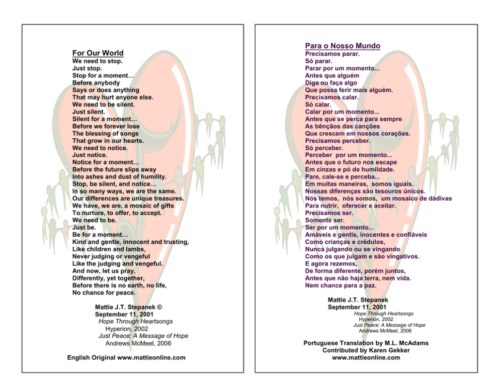 Para o Nosso Mundo For Our World We need to stop. Just stop. Stop for a moment… Before anybody Says or does anything That may hurt anyone else. We need to be silent. Just silent. Silent for a moment… Before we forever lose The blessing of songs That grow in our hearts. We need to notice. Just notice. Notice for a moment… Before the future slips away Into ashes and dust of humility. Stop, be silent, and notice… In so many ways, we are the same. Our differences are unique treasures. We have, we are, a mosaic of gifts To nurture, to offer, to accept. We need to be. Just be. Be for a moment… Kind and gentle, innocent and trusting, Like children and lambs, Never judging or vengeful Like the judging and vengeful. And now, let us pray, Differently, yet together, Before there is no earth, no life, No chance for peace. Mattie J.T. Stepanek © September 11, 2001 Hope Through Heartsongs Hyperion, 2002 Just Peace: A Message of Hope Andrews McMeel, 2006 English Original www.mattieonline.com Precisamos parar. Só parar. Parar por um momento... Antes que alguém Diga ou faça algo Que possa ferir mais alguém. Precisamos calar. Só calar. Calar por um momento... Antes que se perca para sempre As bênçãos das canções Que crescem em nossos corações. Precisamos perceber. Só perceber. Perceber por um momento... Antes que o futuro nos escape Em cinzas e pó de humildade. Pare, cale-se e perceba... Em muitas maneiras, somos iguais. Nossas diferenças são tesouros únicos. Nós temos, nós somos, um mosaico de dádivas Para nutrir, oferecer e aceitar. Precisamos ser. Somente ser. Ser por um momento... Amáveis e gentis, inocentes e confiáveis Como crianças e crédulos, Nunca julgando ou se vingando Como os que julgam e são vingativos. E agora rezemos, De forma diferente, porém juntos, Antes que não haja terra, nem vida. Nem chance para a paz. Mattie J.T. Stepanek September 11, 2001 Hope Through Heartsongs Hyperion, 2002 Just Peace: A Message of Hope Andrews McMeel, 2006 Portuguese Translation by M.L. McAdams Contributed by Karen Gekker www.mattieonline.com