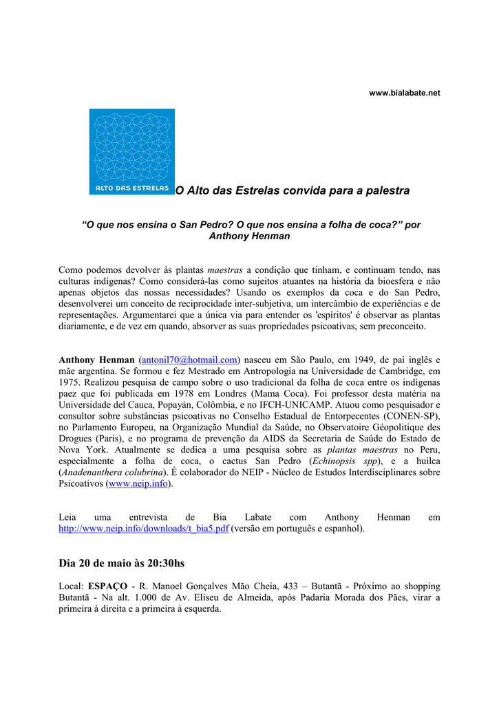 www.bialabate.net O Alto das Estrelas convida para a palestra “O que nos ensina o San Pedro? O que nos ensina a folha de coca?” por Anthony Henman Como podemos devolver às plantas maestras a condição que tinham, e continuam tendo, nas culturas indígenas? Como considerá-las como sujeitos atuantes na história da bioesfera e não apenas objetos das nossas necessidades? Usando os exemplos da coca e do San Pedro, desenvolverei um conceito de reciprocidade inter-subjetiva, um intercâmbio de experiências e de representações. Argumentarei que a única via para entender os 'espíritos' é observar as plantas diariamente, e de vez em quando, absorver as suas propriedades psicoativas, sem preconceito. Anthony Henman ([email protected]) nasceu em São Paulo, em 1949, de pai inglês e mãe argentina. Se formou e fez Mestrado em Antropologia na Universidade de Cambridge, em 1975. Realizou pesquisa de campo sobre o uso tradicional da folha de coca entre os indígenas paez que foi publicada em 1978 em Londres (Mama Coca). Foi professor desta matéria na Universidade del Cauca, Popayán, Colômbia, e no IFCH-UNICAMP. Atuou como pesquisador e consultor sobre substâncias psicoativas no Conselho Estadual de Entorpecentes (CONEN-SP), no Parlamento Europeu, na Organização Mundial da Saúde, no Observatoire Géopolitique des Drogues (Paris), e no programa de prevenção da AIDS da Secretaria de Saúde do Estado de Nova York. Atualmente se dedica a uma pesquisa sobre as plantas maestras no Peru, especialmente a folha de coca, o cactus San Pedro (Echinopsis spp), e a huilca (Anadenanthera colubrina). É colaborador do NEIP - Núcleo de Estudos Interdisciplinares sobre Psicoativos (www.neip.info). Leia uma entrevista de Bia Labate com Anthony http://www.neip.info/downloads/t_bia5.pdf (versão em português e espanhol). Henman em Dia 20 de maio às 20:30hs Local: ESPAÇO - R. Manoel Gonçalves Mão Cheia, 433 – Butantã - Próximo ao shopping Butantã - Na alt. 1.000 de Av. Eliseu de Almeida, após Padaria Morada dos Pães, virar a primeira à direita e a primeira à esquerda. www.bialabate.net Entrada: R$ 5,00 Informações complementares: [email protected]. Organização: Alto das Estrelas – Bia Labate - http://alto-das-estrelas.blogspot.com Apoio: ESPAÇO – Léo Artése - www.xamanismo.com.br