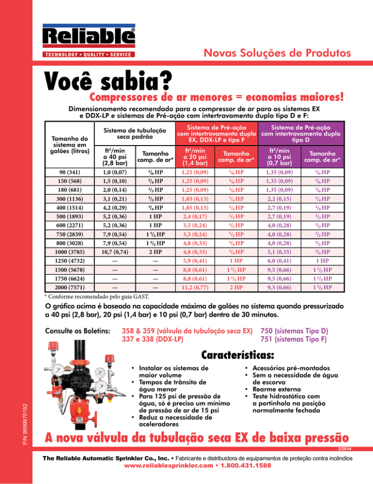 Novas Soluções de Produtos VocêCompressores sabia?de ar menores = economias maiores! Dimensionamento recomendado para o compressor de ar para os sistemas EX e DDX‑LP e sistemas de Pré-ação com intertravamento duplo tipo D e F: Tamanho do sistema em galões (litros) Sistema de tubulação seca padrão ft3/min a 40 psi (2,8 bar) Tamanho comp. de ar* 1/ HP 90 (341) 1,0 (0,07) 6 1/ HP 150 (568) 1,5 (0,10) 4 1/ HP 180 (681) 2,0 (0,14) 3 1 300 (1136) 3,1 (0,21) /2 HP 3/ HP 400 (1514) 4,2 (0,29) 4 500 (1893) 5,2 (0,36) 1 HP 600 (2271) 5,2 (0,36) 1 HP 750 (2839) 7,9 (0,54) 1 1/2 HP 800 (3028) 7,9 (0,54) 1 1/2 HP 1000 (3785) 10,7 (0,74) 2 HP 1250 (4732) — — 1500 (5678) — — 1750 (6624) — — 2000 (7571) — — * Conforme recomendado pelo guia GAST. Sistema de Pré-ação Sistema de Pré-ação com intertravamento duplo com intertravamento duplo EX, DDX‑LP e tipo F tipo D ft3/min a 20 psi (1,4 bar) Tamanho comp. de ar* ft3/min a 10 psi (0,7 bar) Tamanho comp. de ar* 1,25 (0,09) 1,25 (0,09) 1,25 (0,09) 1,85 (0,13) 1,85 (0,13) 2,4 (0,17) 3,5 (0,24) 3,5 (0,24) 4,8 (0,33) 4,8 (0,33) 5,9 (0,41) 8,8 (0,61) 8,8 (0,61) 11,2 (0,77) /6 HP 1/ HP 6 1/ HP 6 1/ HP 4 1/ HP 4 1/ HP 3 1/ HP 2 1/ HP 2 3/ HP 4 3/ HP 4 1 HP 1 1/2 HP 1 1/2 HP 2 HP 1,35 (0,09) 1,35 (0,09) 1,35 (0,09) 2,2 (0,15) 2,7 (0,19) 2,7 (0,19) 4,0 (0,28) 4,0 (0,28) 4,0 (0,28) 5,1 (0,35) 6,0 (0,41) 9,5 (0,66) 9,5 (0,66) 9,5 (0,66) /6 HP /6 HP 1/ HP 6 1/ HP 4 1/ HP 4 1/ HP 3 1/ HP 2 1/ HP 2 1/ HP 2 3/ HP 4 1 HP 1 1/2 HP 1 1/2 HP 1 1/2 HP 1 1 1 O gráfico acima é baseado na capacidade máxima de galões no sistema quando pressurizado a 40 psi (2,8 bar), 20 psi (1,4 bar) e 10 psi (0,7 bar) dentro de 30 minutos. Consulte os Boletins: 358 & 359 (válvula da tubulação seca EX) 337 e 338 (DDX‑LP) 750 (sistemas Tipo D) 751 (sistemas Tipo F) P/N 9999970192 Características: • Instalar os sistemas de maior volume • Tempos de trânsito de água menor • Para 125 psi de pressão de água, só é preciso um mínimo de pressão de ar de 15 psi • Reduz a necessidade de aceleradores • Acessórios pré-montados • Sem a necessidade de água de escorva • Rearme externo • Teste hidrostático com a portinhola na posição normalmente fechada A nova válvula da tubulação seca EX de baixa pressão 2/2014 The Reliable Automatic Sprinkler Co., Inc. • Fabricante e distribuidora de equipamentos de proteção contra incêndios www.reliablesprinkler.com • 1.800.431.1588