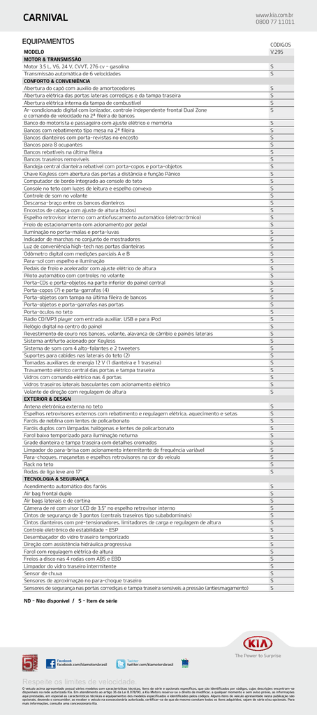 CARNIVAL www.kia.com.br 0800 77 11011 Equipamentos MODELO MOTOR & TRANSMISSÃO Motor 3.5 L, V6, 24 V, CVVT, 276 cv - gasolina Transmissão automática de 6 velocidades CONFORTO & CONVENIÊNCIA Abertura do capô com auxílio de amortecedores Abertura elétrica das portas laterais corrediças e da tampa traseira Abertura elétrica interna da tampa de combustível Ar-condicionado digital com ionizador, controle independente frontal Dual Zone e comando de velocidade na 2ª fileira de bancos Banco do motorista e passageiro com ajuste elétrico e memória Bancos com rebatimento tipo mesa na 2ª fileira Bancos dianteiros com porta-revistas no encosto Bancos para 8 ocupantes Bancos rebatíveis na última fileira Bancos traseiros removíveis Bandeja central dianteira rebatível com porta-copos e porta-objetos Chave Keyless com abertura das portas a distância e função Pânico Computador de bordo integrado ao console do teto Console no teto com luzes de leitura e espelho convexo Controle de som no volante Descansa-braço entre os bancos dianteiros Encostos de cabeça com ajuste de altura (todos) Espelho retrovisor interno com antiofuscamento automático (eletrocrômico) Freio de estacionamento com acionamento por pedal Iluminação no porta-malas e porta-luvas Indicador de marchas no conjunto de mostradores Luz de conveniência high-tech nas portas dianteiras Odômetro digital com medições parciais A e B Para-sol com espelho e iluminação Pedais de freio e acelerador com ajuste elétrico de altura Piloto automático com controles no volante Porta-CDs e porta-objetos na parte inferior do painel central Porta-copos (7) e porta-garrafas (4) Porta-objetos com tampa na última fileira de bancos Porta-objetos e porta-garrafas nas portas Porta-óculos no teto Rádio CD/MP3 player com entrada auxiliar, USB e para iPod Relógio digital no centro do painel Revestimento de couro nos bancos, volante, alavanca de câmbio e painéis laterais Sistema antifurto acionado por Keyless Sistema de som com 4 alto-falantes e 2 tweeters Suportes para cabides nas laterais do teto (2) Tomadas auxiliares de energia 12 V (1 dianteira e 1 traseira) Travamento elétrico central das portas e tampa traseira Vidros com comando elétrico nas 4 portas Vidros traseiros laterais basculantes com acionamento elétrico Volante de direção com regulagem de altura EXTERIOR & DESIGN Antena eletrônica externa no teto Espelhos retrovisores externos com rebatimento e regulagem elétrica, aquecimento e setas Faróis de neblina com lentes de policarbonato Faróis duplos com lâmpadas halógenas e lentes de policarbonato Farol baixo temporizado para iluminação noturna Grade dianteira e tampa traseira com detalhes cromados Limpador do para-brisa com acionamento intermitente de frequência variável Para-choques, maçanetas e espelhos retrovisores na cor do veículo Rack no teto Rodas de liga leve aro 17” TECNOLOGIA & SEGURANÇA Acendimento automático dos faróis Air bag frontal duplo Air bags laterais e de cortina Câmera de ré com visor LCD de 3,5” no espelho retrovisor interno Cintos de segurança de 3 pontos (centrais traseiros tipo subabdominais) Cintos dianteiros com pré-tensionadores, limitadores de carga e regulagem de altura Controle eletrônico de estabilidade – ESP Desembaçador do vidro traseiro temporizado Direção com assistência hidráulica progressiva Farol com regulagem elétrica de altura Freios a disco nas 4 rodas com ABS e EBD Limpador do vidro traseiro intermitente Sensor de chuva Sensores de aproximação no para-choque traseiro Sensores de segurança nas portas corrediças e tampa traseira sensíveis a pressão (antiesmagamento) CÓDIGOS V.295 S S S S S S S S S S S S S S S S S S S S S S S S S S S S S S S S S S S S S S S S S S S S S S S S S S S S S S S S S S S S S S S S S S S S S ND - Não disponível / S - Item de série facebook.com/kiamotorsbrasil twitter.com/kiamotorsbrasil Respeite os limites de velocidade. O veículo acima apresentado possui vários modelos com características técnicas, itens de série e opcionais específicos, que são identificados por códigos, cujas descrições encontram-se disponíveis na rede autorizada Kia. Em atendimento ao artigo 36 da Lei 8.078/90, a Kia Motors reserva-se o direito de modificar, a qualquer momento e sem aviso prévio, as informações aqui prestadas, em especial as características técnicas e equipamentos dos modelos especificados e identificados pelos códigos. Alguns itens do veículo apresentado nesta publicação são opcionais, devendo o consumidor, ao receber o veículo na concessionária autorizada, certificar-se de que do mesmo constam todos os itens adquiridos, sejam de série e/ou opcionais. Para mais informações, consulte uma concessionária Kia.