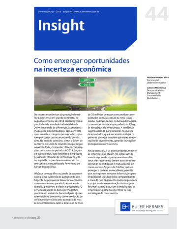 Fevereiro/Março - 2015 Edição 44 www.eulerhermes.com.br Insight 44 www.eulerhermes.com.br Como enxergar oportunidades na incerteza econômica Adriana Mendes Silva Commercial Underwriter Analyst Luciano Mendonça Director of Market Management, Commercial & Distribution Os setores econômicos da produção brasileira apresentaram grande contraste, no segundo semestre de 2014, abalados com o pior índice de atividade industrial desde 2010. Ilustrando as diferenças, acompanhamos a crise das montadoras, que, com estoques em alta e margens pressionadas, optaram por cortar custos anunciando demissões. No sentido contrário, vimos o boom de consumo no setor de cosméticos, que segue em ritmo forte, crescendo 12% em comparação com o mesmo período de 2013. Segundo especialistas, este fenômeno é explicado pelas taxas elevadas de demanda em setores específicos que devem manter ritmo crescente alavancados pelo fenômeno do bônus demográfico. O bônus demográfico ou janela de oportunidade é uma evidência do aumento do contingente de pessoas na faixa etária economicamente ativa comparada à dependência exercida por jovens e idosos na economia. O período da janela do bônus demográfico propicia um ambiente favorável para ajustes estruturais na economia, como a redução de déficit previdenciário pelo aumento da massa de contribuintes. Após a aquisição de mais de 35 milhões de novos consumidores conquistados com a ascensão da nova classe média, no Brasil, temos no bônus demográfico uma oportunidade que poderá dar fôlego às estratégias de longo prazo. A tendência sugere, olhando para paralelos nos países desenvolvidos, que é necessário instigar os gestores para que acessem garantias às operações de investimento, gerando inovação e protegendo o core business. Para potencializar as oportunidades, mesmo as empresas que atuam em setores de demanda reprimida e que apresentam altas taxas de crescimento devem acessar os mecanismos de mitigação e mutualização de riscos, como o Seguro de Crédito, que, ao proteger a carteira de recebíveis, permite que as empresas acessem informações para impulsionar seus negócios compartilhando o risco do não pagamento com a seguradora e propiciando a manutenção das margens financeiras para que, com tranquilidade, os empresários possam concentrar-se nas estratégias de crescimento. Acontece Gustavo Ferreira Senior Industry Sector Credit Analyst Lava-jato: impacto na cadeia de fornecimento da Petrobras Em março de 2014, a Polícia Federal deflagrou a operação Lava-jato, uma ação nacional para investigar um grande esquema de desvio e lavagem de dinheiro envolvendo a Petrobras, empreiteiras e políticos, estimado, inicialmente, em R$ 10 bilhões. Com as investigações criminais ainda longe de um desfecho conclusivo, uma coisa é certa: os desdobramentos na cadeia de suprimentos da Petrobras trarão sérias consequências financeiras para as empresas envolvidas, direta e indiretamente, porém serão devastadores para algumas. Desde 2012, percebemos, por meio do monitoramento de nossa carteira de compradores, um aumento de eventos de não pagamento na cadeia da Petrobras. À época, as primeiras justificativas davam conta de que a estatal estava represando pagamentos em função de revisão de contratos. Com seus recebíveis em atraso, fornecedores interrompiam o pagamento Destaques da Euler Hermes Brasil em 2014: para seus contratados e, assim, toda o supply chain da companhia ficava vulnerável. Com o avanço das investigações, as maiores empreiteiras do país passaram a ser acusadas de pagar propina para fecharem contratos com a estatal. Assim, o que antes estava restrito aos elos mais sensíveis da cadeia, formado principalmente por construtoras e empresas de engenharia de pequeno e médio portes, subcontratadas pelas grandes empreiteiras e consórcios, passou também a atingir os grandes fornecedores diretos da estatal. Com efeito, 28 pessoas, entre elas executivos das maiores construtoras do país, já haviam sido presas, o que levou a Petrobras a determinar que 27 empresas dos grupos citados nas denúncias fossem temporariamente impedidas de participar de licitações. O efeito das prisões foi imediatamente sentido pelas grandes empreiteiras brasileiras, que tiveram suas notas de crédito rebaixadas pelas agências de risco internacionais, aumentando sobremaneira seus respectivos riscos de refinanciamento. A título de exemplos, a construtora OAS teve sua nota de risco rebaixada para “calote seletivo” ao não honrar o pagamento de juros, e a empresa de engenharia Alumni (ex-Alusa) foi a primeira empreiteira citada na Lavajato a entrar em recuperação judicial. A apreensão também coloca em xeque o futuro da indústria naval brasiliera, uma vez que alguns estaleiros são controlados por empresas envolvidas na investigação. Apesar das dificuldades, aquelas que apresentarem melhores indicadores-chave – entre os quais, perfil do endividamento e de liquidez, geração de caixa, diversificação de receitas e acesso ao mercado financeiro – terão maiores chances de sobreviver, pelo menos no curto prazo, até que as investigações sejam concluídas. 1 Crescimento de 13% do prêmio emitido em 2014 em comparação a 2013 e crescimento acumulado de 135% nos últimos 5 anos; 2 Loss ratio (sinistralidade), em 2014, reduzida em 7,5% em relação a 2013; 3 Aumento de 21% da quantidade de apólices; 4 Nomeação, em maio de 2014, do novo CEO: Rodrigo Rincon Jimenez; 5 Prêmio "Melhor Desempenho – Crédito à Exportação", oferecido pela revista Segurador Brasil; 6 Conclusão do processo de reorganização societária interna com a incorporação da Euler Hermes Seguros de Crédito à Exportação S.A. pela Euler Hermes Seguros de Crédito S.A., que trouxe ganhos significativos na gestão operacional e na redução de custos. 2 Venda à ordem ou operação triangular A operação triangular ou venda à ordem é mar