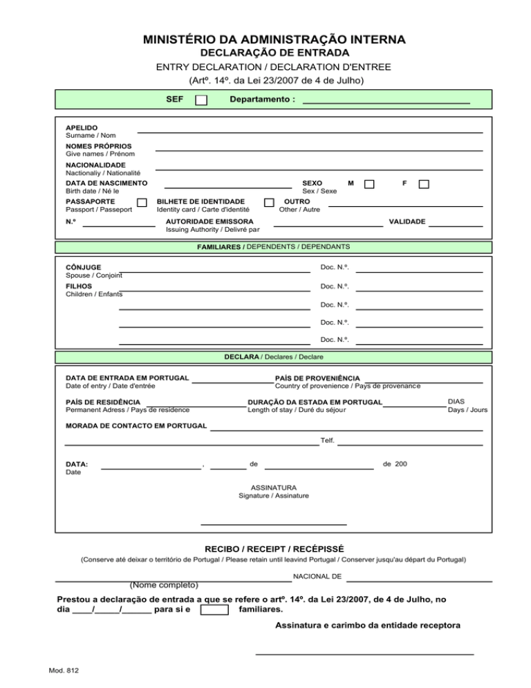 MINISTÉRIO DA ADMINISTRAÇÃO INTERNA DECLARAÇÃO DE ENTRADA ENTRY DECLARATION / DECLARATION D'ENTREE (Artº. 14º. da Lei 23/2007 de 4 de Julho) SEF Departamento : APELIDO Surname / Nom NOMES PRÓPRIOS Give names / Prénom NACIONALIDADE Nactionaliy / Nationalité DATA DE NASCIMENTO Birth date / Né le PASSAPORTE Passport / Passeport N.º SEXO Sex / Sexe BILHETE DE IDENTIDADE Identity card / Carte d'identité M F OUTRO Other / Autre VALIDADE AUTORIDADE EMISSORA Issuing Authority / Delivré par FAMILIARES / DEPENDENTS / DEPENDANTS CÔNJUGE Spouse / Conjoint Doc. N.º. FILHOS Children / Enfants Doc. N.º. Doc. N.º. Doc. N.º. Doc. N.º. DECLARA / Declares / Declare DATA DE ENTRADA EM PORTUGAL Date of entry / Date d'entrée PAÍS DE PROVENIÊNCIA Country of provenience / Pays de provenanc e DIAS Days / Jours DURAÇÃO DA ESTADA EM PORTUGAL Length of stay / Duré du séjour PAÍS DE RESIDÊNCIA Permanent Adress / Pays de residence MORADA DE CONTACTO EM PORTUGAL Telf. , DATA: Date de de 200 ASSINATURA Signature / Assinature RECIBO / RECEIPT / RECÉPISSÉ (Conserve até deixar o território de Portugal / Please retain until leavind Portugal / Conserver jusqu'au départ du Portugal) (Nome completo) NACIONAL DE Prestou a declaração de entrada a que se refere o artº. 14º. da Lei 23/2007, de 4 de Julho, no dia ____/_____/______ para si e familiares. Assinatura e carimbo da entidade receptora Mod. 812