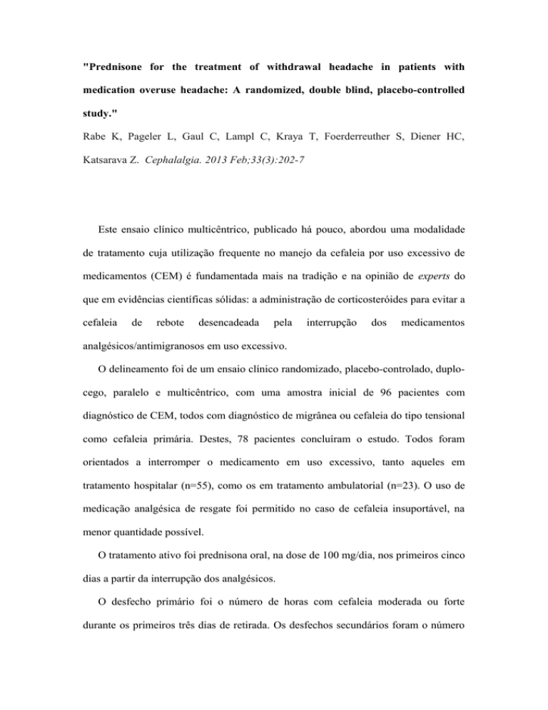 "Prednisone for the treatment of withdrawal headache in patients with medication overuse headache: A randomized, double blind, placebo-controlled study." Rabe K, Pageler L, Gaul C, Lampl C, Kraya T, Foerderreuther S, Diener HC, Katsarava Z. Cephalalgia. 2013 Feb;33(3):202-7 Este ensaio clínico multicêntrico, publicado há pouco, abordou uma modalidade de tratamento cuja utilização frequente no manejo da cefaleia por uso excessivo de medicamentos (CEM) é fundamentada mais na tradição e na opinião de experts do que em evidências científicas sólidas: a administração de corticosteróides para evitar a cefaleia de rebote desencadeada pela interrupção dos medicamentos analgésicos/antimigranosos em uso excessivo. O delineamento foi de um ensaio clínico randomizado, placebo-controlado, duplocego, paralelo e multicêntrico, com uma amostra inicial de 96 pacientes com diagnóstico de CEM, todos com diagnóstico de migrânea ou cefaleia do tipo tensional como cefaleia primária. Destes, 78 pacientes concluíram o estudo. Todos foram orientados a interromper o medicamento em uso excessivo, tanto aqueles em tratamento hospitalar (n=55), como os em tratamento ambulatorial (n=23). O uso de medicação analgésica de resgate foi permitido no caso de cefaleia insuportável, na menor quantidade possível. O tratamento ativo foi prednisona oral, na dose de 100 mg/dia, nos primeiros cinco dias a partir da interrupção dos analgésicos. O desfecho primário foi o número de horas com cefaleia moderada ou forte durante os primeiros três dias de retirada. Os desfechos secundários foram o número de horas com cefaleia moderada ou severa durante os primeiros cinco e 14 dias de retirada e o uso de medicação de resgate. O tratamento foi bem tolerado por ambos os grupos, e a cefaleia de rebote diminuiu significativamente ao longo dos 14 dias de observação. No entanto, a magnitude desta redução não foi diferente quando o grupo de pacientes que receberam prednisona foi comparado ao grupo placebo. Por outro lado, o uso de medicação de resgate - um dos desfechos secundários - foi significativamente menor no grupo de tratamento ativo. É importante lembrar que os poucos estudos realizados previamente sobre este tema, incluindo aqueles feitos no Brasil, por Krymchantowski e colaboradores, apresentaram resultados variados. Este fato, aliado à positividade de um dos desfechos secundários do estudo atual, à ausência de ensaios empregando corticosteróides administrados por via parenteral, além da falta, no nosso meio, de opções com eficácia comprovada e ausência de risco de perpetuação da cefaleia, faz com que, na nossa opinião, não devamos considerar este assunto definitivamente resolvido. Fernando Kowacs Universidade Federal de Ciências da Saúde de Porto Alegre - UFCSPA Hospital Moinhos de Vento Secretário do DC de Cefaleia da ABN