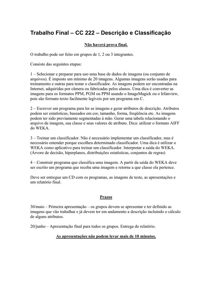Trabalho Final – CC 222 – Descrição e Classificação Não haverá prova final. O trabalho pode ser feito em grupos de 1, 2 ou 3 integrantes. Consiste das seguintes etapas: 1 – Selecionar e preparar para uso uma base de dados de imagens (ou conjunto de arquivos). É imposto um mínimo de 20 imagens. Algumas imagens serão usadas para treinamento e outras para testar o classificador. As imagens podem ser encontradas na Internet, adquiridas por câmera ou fabricadas pelos alunos. Uma dica é converter as imagens para os formatos PPM, PGM ou PPM usando o ImageMagick ou o Irfanview, pois são formato texto facilmente legíveis por um programa em C. 2 – Escrever um programa para ler as imagens e gerar atributos de descrição. Atributos podem ser estatísticas, baseados em cor, tamanho, forma, freqüência etc. As imagens podem ter sido previamente segmentadas à mão. Gerar uma tabela relacionando o arquivo de imagem, sua classe e seus valores de atributo. Dica: utilizar o formato AIFF do WEKA. 3 – Treinar um classificador. Não é necessário implementar um classificador, mas é necessário entender porque escolheu determinado classificador. Uma dica é utilizar o WEKA como aplicativo para treinar um classificador. Interpretar a saída do WEKA. (Árvore de decisão, hiperplanos, distribuições estatísticas, conjuntos de regras) 4 – Construir programa que classifica uma imagem. A partir da saída do WEKA deve ser escrito um programa que receba uma imagem e retorne a que classe ela pertence. Deve ser entregue um CD com os programas, as imagens de teste, as apresentações e um relatório final. Prazos 30/maio – Primeira apresentação – os grupos devem se apresentar e ter definido as imagens que vão trabalhar e já devem ter em andamento a descrição incluindo o cálculo de alguns atributos. 20/junho – Apresentação final para todos os grupos. Entrega do relatório. As apresentações não podem levar mais de 10 minutos.