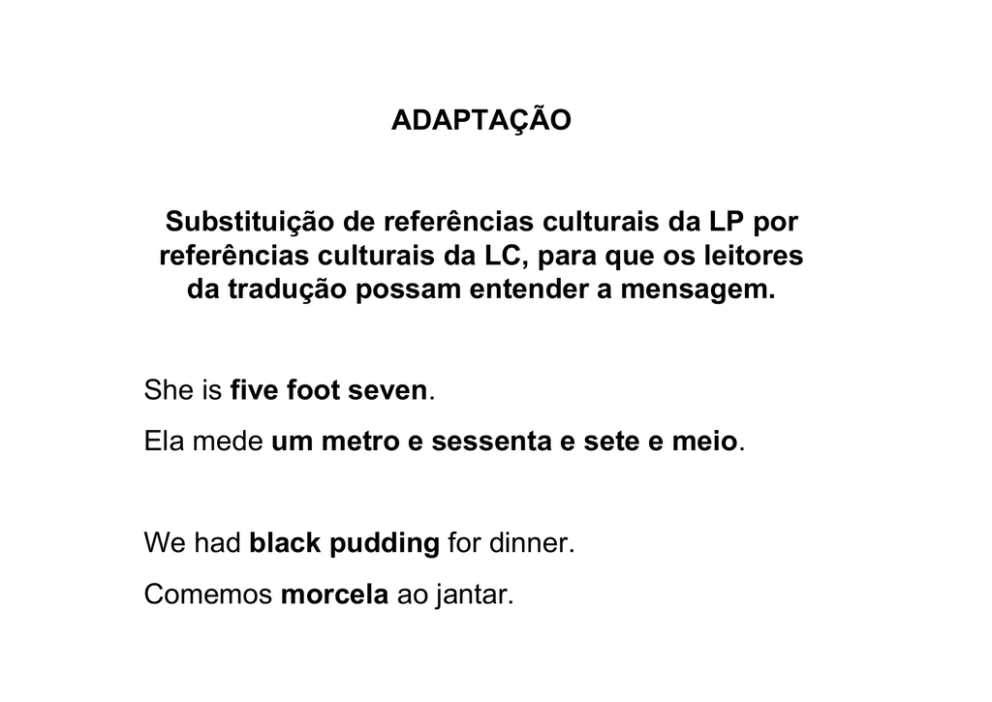ADAPTAÇÃO Substituição de referências culturais da LP por referências culturais da LC, para que os leitores da tradução possam entender a mensagem. She is five foot seven. Ela mede um metro e sessenta e sete e meio. We had black pudding for dinner. Comemos morcela ao jantar. APAGAMENTO Eliminação de um elemento lexical do TP não pertinente ou redundante no TC. Faz lembrar as piores atrocidades da Inquisição. It sounds like the worst excesses of the Spanish Inquisition. DENOTAÇÃO/CONOTAÇÃO presença/ausência de carga afectiva em LP e LC. Populace = População (sentido denotativo em ingl) [Populaça (sentido conotativo pejorativo em port) = Mob] Did the gentry really seek to control the populace territorially? Procuraria a pequena nobreza dominar territorialmente a população? DECALQUE Transcodificação com adaptação aos sistemas fonético e ortográfico da LC. We had roast beef for dinner. Comemos rosbife ao jantar. We went skiing last weekend. No fim de semana passado fomos esquiar. Baseball / football / handball / volleyball Beisebol / futebol / andebol / voleibol EMPRÉSTIMO Utilização no TC de elementos lexicais da LP (ou outra língua estrangeira) Os empréstimos devem figurar sempre em itálico. Let’s go to the nearest pub. Vamos ao pub mais próximo. She’s doing playback. Ela está a fazer playback. EQUIVALÊNCIA Recodificação de uma mesma realidade por processos estilísticos e/ou culturais diversos, tendo em conta a totalidade da mensagem. To batten down the hatches. Preparar-se para o pior. Once a thief, always a thief. Quem rouba um cesto rouba um cento. Cesteiro que faz um cesto faz um cento. EXPANSÃO Adição de um segmento ao TC, por razões de estética textual. (…) putting on airs as if he was too good to wipe his shoes on me, when he's nothing but a drunken bum who never done a tap of work in his life (…) (...) sempre a pavonear-se como se fosse bom de mais para me cuspir em cima, quando ele afinal não passa de um bêbedo e de um vadio que nunca mexeu uma palha na vida (...) EXPLICITAÇÃO Adição da explicação de uma referência do TP opaca para os leitores do TC (para evitar a nota de rodapé). Like a Polaris emerging from a submarine Como um míssil Polaris a sair dum submarino. They had a bowl of furmity at the fair. Na feira comeram uma tigela de furmity, as tradicionais papas de cereais com mel. MODULAÇÃO Mudança de ponto de vista (nível linguístico) seat belt cinto de segurança instant coffee café solúvel VGogh painted several still lives I missed my family I don’t think he’ll come. VGogh pintou naturezas mortas Senti a falta / tive saudades da minha família Acho que ele não vem. The Expo98 opened in May A Expo98 foi inaugurada em Maio. TRADUÇÃO LITERAL Transcodificação directa do TP para o TC He gave her a lovely flower. Ele deu-lhe uma linda flor. [A tradução literal é muitas vezes geradora de erro: He painted still lives – Ele pintava vidas paradas] TRANSPOSIÇÃO Tradução com mudança de categoria gramatical Is this your first visit to London É a primeira vez que vem a Londres? The hall was crowded with medical students. O átrio estava cheio de estudantes de medicina. People were suspicious of his sudden generosity. She would type an occasional letter for him. As pessoas começaram a desconfiar de tão súbita generosidade. De vez em quando ela dactilografava-lhe uma carta. I still think that he should have accepted the offer. Continuo a pensar que ele devia ter aceitado a oferta. He merely nodded. / He just nodded. Limitou-se a acenar em concordância. I said it as a joke. Eu disse aquilo a brincar /na brincadeira. Come and look! It’s snowing. Anda ver! Está a nevar. As timber becomes more valuable... Com a valorização da madeira... In the early 20’s. No início dos anos vinte. “CHASSÉ-CROISÉ” Dupla transposição, com mudança de cat. gram. e permuta sintáctica dos elementos com carga semântica 1 2 3 [Agente] [V - descr. acção] The girl swam 1 [Agente] A rapariga 4 [Prep – dir. acção] across 3 [V + dir. acção] atravessou [Locus] the river. 4 [Locus] o rio 2 [Loc. Prep. - descr. da acção] a nado. “CHASSÉ-CROISÉ” Exemplos: The girl swam across the river. A rapariga atravessou o rio a nado. He flung the door open. Ele abriu a porta de rompante. He starved to death. Ele morreu de fome. She was steaming up the Hudson. A bird flew into the room. O barco a vapor subia o Hudson. Um pássaro entrou na sala. (incompleto) - They had lovely cases at Marks’ last week, his mother sighed. I expect they’ve all gone by now. - A semana passada tinham umas malas bem bonitas no Marks & Spencer – disse a mãe com um suspiro. – Mas certamente agora já as venderam todas. UNIDADE DE SENTIDO Ideia ou unidade semântica que numa língua é codificada por um conjunto de palavras e na outra língua é codificada por uma só palavra. Our new biologist could put in the shade many experienced scientist. A nova bióloga conseguia eclipsar muitos cientistas consagrados.