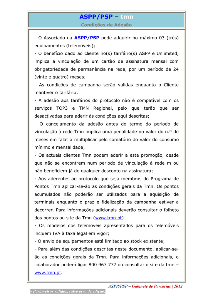 ASPP/PSP – tmn Condições de Adesão - O Associado da ASPP/PSP pode adquirir no máximo 03 (três) equipamentos (telemóveis); - O benefício dado ao cliente no(s) tarifário(s) ASPP e Unlimited, implica a vinculação de um cartão de assinatura mensal com obrigatoriedade de permanência na rede, por um período de 24 (vinte e quatro) meses; - As condições de campanha serão válidas enquanto o Cliente mantiver o tarifário; - A adesão aos tarifários do protocolo não é compatível com os serviços TOP3 e TMN Regional, pelo que terão que ser desactivadas para aderir às condições aqui descritas; - O cancelamento da adesão antes do termo do período de vinculação à rede Tmn implica uma penalidade no valor do n.º de meses em falat a multiplicar pelo somatório do valor do consumo mínimo e mensalidade; - Os actuais clientes Tmn podem aderir a esta promoção, desde que não se encontrem num período de vinculação à rede m ou não beneficiem já de qualquer desconto na assinatura; - Aos aderentes ao protocolo que seja membros do Programa de Pontos Tmn aplicar-se-ão as condições gerais da Tmn. Os pontos acumulados não poderão ser utilizados para a aquisição de terminais enquanto o praz e fidelização da campanha estiver a decorrer. Para informações adicionais deverão consultar o folheto dos pontos ou site da Tmn (www.tmn.pt) - Os modelos dos telemóveis apresentados para os telemóveis incluem IVA à taxa legal em vigor; - O envio de equipamentos está limitado ao stock existente; - Para além das condições descritas neste documento, aplicar-seão as condições gerais da Tmn. Para informações adicionais, o colaborador poderá ligar 800 967 777 ou consultar o site da tmn – www.tmn.pt. ASPP/PSP – Gabinete de Parcerias | 2012 - Parâmetros válidos, salvo erro de edição. Documentos: - Cópia do Bilhete de Identidade (BI); - Cópia do Bilhete de Identidade Policial (BI/PSP); - Cópia do Número de Identificação Fiscal (NIF); - Comprovativo de morada (cópia de factura de água, luz ou telefone); - Número de Identificação Bancária (NIB), (cópia de cheque ou talão MB); - Cópia da referência Multibanco (para manter o mesmo número de telemóvel e este seja recarregável através de MB); - Documento de cedência de cartão (só para cartões tmn de assinatura); - Formulários tmn (Contrato); - Formulários ASPP/PSP. ASPP/PSP – Gabinete de Parcerias | 2012 - Parâmetros válidos, salvo erro de edição.