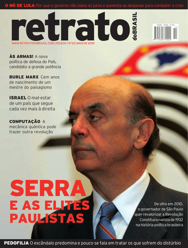 retrato doBRASIL O NÓ DE LULA Por que o governo não baixa os juros e aumenta as despesas para combater a crise WWW.RETRATODOBRASIL.COM | R$ 8,00 | NO 22 | MAIO DE 2009 ÀS ARMAS! A nova política de defesa do País, candidato a grande potência BURLE MARX Cem anos de nascimento de um mestre do paisagismo ISRAEL O mal-estar de um país que segue cada vez mais à direita COMPUTAÇÃO A mecânica quântica pode trazer outra revolução SERRA E AS ELITES PAULISTAS De olho em 2010, o governador de São Paulo quer revalorizar a Revolução Constitucionalista de 1932 na história política brasileira PEDOFILIA O escândalo predomina e pouco se fala em tratar os que sofrem do distúrbio fale conosco: WWW.RETRATODOBRASIL.COM ASSINATURAS [email protected] tel. 11 | 3813 1527 de segunda a sexta-feira, das 9h30 às 17h ATENDIMENTO AO ASSINANTE [email protected] tel. 31 | 3281 4431 de segunda a sexta-feira, das 9h às 17h PARA ANUNCIAR [email protected] tel. 11 | 3813 1527 de segunda a sexta-feira, das 9h30 às 17h CIRCULAÇÃO EM BANCAS [email protected] EDIÇÕES ANTERIORES [email protected] REDAÇÃO [email protected] tel. 11 | 3814 9030 CARTAS À REDAÇÃO www.retratodobrasil.com [email protected] rua fidalga, 146 conj.42 - vila madalena cep 05432-000 são paulo - sp Entre em contato com a redação de Retrato do Brasil. Dê sua sugestão, critique, opine. Reservamo-nos o direito de editar as mensagens recebidas para adequá-las ao espaço disponível ou para facilitar a compreensão. doBRASIL retrato WWW.RETRATODOBRASIL.COM | R$ 8,00 | N O 22 | MAIO DE 2009 Ponto de vista O GOVERNADOR E SUA HISTÓRIA À PAULISTA A Imprensa Oficial de São Paulo lançou livros que revalorizam a elite paulista. Uma manobra de Serra, de olho na sucessão 6 Clima OS MALES DO AQUECIMENTO LOCAL O inverno se aproxima e com ele agravam-se os problemas de saúde. Mas não apenas a natureza é responsável por isso Rafael Hernandes 9 Crise O NÓ DO ORÇAMENTO O governo está reduzindo as previsões de gasto. É porque está amarrado a um modelo que não está voltado para o crescimento do País Lia Imanishi Rodrigues 12 Sociedade UM DRAMA EM BUSCA DE EXPIAÇÃO A mídia e políticos conservadores confundem a opinião pública ao dizerem que a pedofilia é coisa de “monstros” Léo Arcoverde 22 Defesa O PAÍS VAI ÀS ARMAS O governo faz grandes planos para modernizar as Forças Armadas e se prepara para defender a Amazônia da ambição de “uma grande potência” Carlos Azevedo 30 Israel UM ACORDO. E MUITO MAL-ESTAR O governo liderado pelo Likud confirma o rumo que o país tomou há anos Armando Sartori e Yuri Martins Fontes 36 Ciência A PRÓXIMA REVOLUÇÃO Os computadores pessoais promoveram mudanças em escala planetária. A computação quântica pode ser ainda mais avassaladora Flavio de Carvalho Serpa 41 Paisagismo O MARX DOS CACTOS E DAS CURVAS Um dos principais paisagistas do século XX, Burle Marx completaria cem anos se fosse vivo Ana Castro 45 Política CASO DANTAS: UM DEBATE O presidente da Previ, Sérgio Rosa, e o repórter Raimundo Rodrigues Pereira discutem as conclusões do artigo publicado na última edição de Retrato do Brasil 48 EXPEDIENTE SUPERVISÃO EDITORIAL Raimundo Rodrigues Pereira EDIÇÃO Armando Sartori REDAÇÃO Carlos Azevedo • Lia Imanishi • Rafael Hernandes • Sônia Mesquita • Tânia Caliari • Verônica Bercht EDIÇÃO DE ARTE Ana Castro • Pedro Ivo Sartori REVISÃO Silvio Lourenço • Gabriela Ghetti [OK Linguística] COLABORARAM NESTA EDIÇÃO Alex Silva • Carlinhos Mueller • Flavio de Carvalho Serpa • Giuseppe Bizarri • Léo Arcoverde • Yuri Martins Fontes CARTAS AS FORMAS DE DITADURA O artigo “As formas de ditadura”, publicado na edição 21, foi muito elucidativo e didático. Ao usar o termo “presidente” e “regime militar”, quando se referem à ditadura brasileira, entretanto, o texto corrobora a afirmação da imprensa burguesa de que houve realmente uma “ditabranda”, já que não houve ditadores e ditadura e sim uma variante da democracia, chamada de “regime miltar” por oposição ao “regime civil”, que é o que estamos vivendo agora. Miguel Boeira Vianna [por e-mail] 45 ANOS DO GOLPE Em 31 de março último, o Clube Militar, em sessão solene realizada no Rio de Janeiro, convidou mais de 2,5 mil membros das Forças Armadas para a comemoração do quadragésimo quinto aniversário do golpe militar de 1964. Dada a manifesta ilicitude da solenidade e o nefasto silêncio da mídia, inúmeros intelectuais firmaram um manifesto de repúdio, reproduzido abaixo. Entre outros, subscreveram o texto Dalmo de Abreu Dallari, Fábio Konder Comparato, Ivan Valente , Margarida Genevois, Maria Luiza Marcilio, Maria Victoria Benevides e Roberto Romano da Silva. Miguel Chibani Bakr Filho, presidente da “Associação E vamos à luta” [por e-mail] Retrato do BRASIL é uma publicação mensal da Editora Manifesto S.A. EDITORA MANIFESTO S.A. PRESIDENTE Roberto Davis DIRETOR ADMINISTRATIVO E FINANCEIRO Marcos Montenegro DIRETOR EDITORIAL Raimundo Rodrigues Pereira COMERCIAL [[email protected]] GERENTE Daniela Dornellas • Tel 11 3813 1527 • 11 3037 7316 REPRESENTANTE EM BRASÍLIA Joaquim Barroncas • Tel 61 3328 8046 ADMINISTRAÇÃO [[email protected]] Neuza Gontijo • Maria Aparecida Carvalho OPERAÇÃO EM BANCAS ASSESSORIA EDICASE [www.edicase.com.br] DISTRIBUIÇÃO EXCLUSIVA EM BANCAS Fernando Chinaglia Comercial e Distribuidora S/A MANUSEIO FG Press CAPA Governador José Serra (20/8/2007)/ Foto Ed Viggiani/ AE Manifesto de repúdio: “Lastimável equívoco. Profundo gravame à consciência coletiva do povo brasileiro, que, por mais de 20 anos de violência política institucionalizada, assistiu ao desmantelamento dos mais altos princípios da democracia e dos direitos humanos. Afinal, comemora-se o quê? [...] A sobredita festividade não tem mínima justificação ética. Não há oratória que possa acobertar o espancamento da cidadan