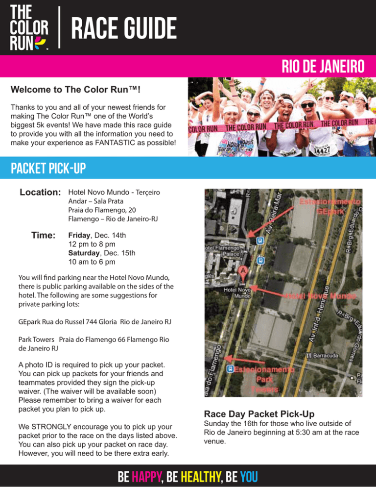 Race Guide Rio de Janeiro Welcome to The Color Run™! Thanks to you and all of your newest friends for making The Color Run™ one of the World’s biggest 5k events! We have made this race guide to provide you with all the information you need to make your experience as FANTASTIC as possible! Packet Pick-Up Location: Time: Hotel Novo Mundo - Terçeiro Andar – Sala Prata Praia do Flamengo, 20 Flamengo – Rio de Janeiro-RJ Friday, Dec. 14th 12 pm to 8 pm Saturday, Dec. 15th 10 am to 6 pm You will find parking near the Hotel Novo Mundo, there is public parking available on the sides of the hotel. The following are some suggestions for private parking lots: GEpark Rua do Russel 744 Gloria Rio de Janeiro RJ Park Towers Praia do Flamengo 66 Flamengo Rio de Janeiro RJ A photo ID is required to pick up your packet. You can pick up packets for your friends and teammates provided they sign the pick-up waiver. (The waiver will be available soon) Please remember to bring a waiver for each packet you plan to pick up. We STRONGLY encourage you to pick up your packet prior to the race on the days listed above. You can also pick up your packet on race day. However, you will need to be there extra early. Race Day Packet Pick-Up Sunday the 16th for those who live outside of Rio de Janeiro beginning at 5:30 am at the race venue. Be Happy, Be Healthy, Be You Race Day - Sunday, December 16th Location: Monumento dos Pracinhas Monument to the Dead of World War II Av. Infante D. Henrique, 75 Glória. Rio de Janeiro RJ / 20021-140 Time: Race begins at 8:00 am Parking Because of the acessibility, we won't be providing parking. If you do drive, be sure to carpool to keep the neighborhood cleaner and less crowded!!! As you would with any large event allow plenty of time to get to the race. Traffic may be considerable both before and after the event. Remember, these are your fellow Color Runners out to have a great experience with their friends and family. Plan your schedule accordingly and be patient. Additionally, please be on the watch for pedestrians, especially children. The Color Run is a popular event for families who will be returning to their cars as motorists are tyring to exit. Please drive carefully and be alert. Reminders Safety First ● Runners please keep to the left; walkers and participants with strollers, etc. please keep to the right. ● No alcohol is allowed at The Color Run™ ● If running with a stroller, please stay to the right on the course. ● If running with small children, please watch and direct them through the race. ● If you are concerned at all with any part of the run, feel free to wear safety glasses, a bandana, or dust mask. ● Please follow any directions provided by race officials, volunteers, and law enforcement. ● No glass bottles, containers etc. allowed at the outdoor venue (parking lots, sidewalks, streets, course, etc.) ● Above all, please be courteous and respectful to everyone around you. ● Please make sure to attach your bib number so it is visible on your shirt and that your wristband is worn on race day. This is how you will be identified as a Color Runner at the start/finish line. ● Teams may run in a group or separately, it is completely up to you. ● Friends and family are welcome to meet up with participants in the general festival areas. Only Color Runners will be allowed in the finish chute area. If Life Hands You Color, Run With It. Additional Information Thank You Last but not least we want to thank everyone who has helped to bring The Color Run™ to Rio de Janeiro. Thank you to the city of Rio de Janeiro, city officials, law enforcement, the hundreds of volunteers at packet pick-up and at the event, and last but certainly not least YOU, our fearless Color runners! Until next time! Be happy, Be Healthy, and Be Safe! - From all of us at The Color Run™ Additional Information Additional information can be found online at www.TheColorRun.com Check out our Frequently Asked Questions page for answers to some of the most common questions we’ve been asked. You will also find some helpful tips and tricks on how to clean up after the race. You can even join our VIP list and get updates via email when we announce new races or open registration, or stay in touch with us via Facebook! Don’t feel like running but want to get in on the fun? Consider volunteering and be part of The Happiest 5k on the Planet! The Happiest 5k on the Planet! AUTORIZAÇÃO DE RETIRADA DE KIT POR TERCEIROS Rio de Janeiro, _____ de Dezembro de 2012. Uso da organização Eu, _________________________________________________________________________, AUTORIZO o Sr.(a) ____________________________________________________, a retirar o KIT de participação do evento esportivo THE COLOR RUN RIO DE JANEIRO, que será realizada em 16 de dezembro de 2012, no Aterro do Flamengo. ______________________________________________________RG____________________ Assinatura do solicitante (dono do KIT) _____________________________________________________ RG ____________________ Assinatura de quem retirar o KIT AUTORIZAÇÃO PARA MENOR Rio de janeiro ___ de dezembro de 2012. Eu, _________________________________________________________________________, residente ____________________________________________________________________, na condição de responsável do (a) menor ___________________________________________, AUTORIZO a participação do mesmo no evento esportivo THE COLOR RUN RIO DE JANEIRO, que será realizada em 16 de dezembro de 2012, no Aterro do Flamengo, com início ás 08 horas. Declaro que estou ciente das regras do evento. Identidade (RG) do responsável. _______________________________________________ CPF do Responsável ____________________________________________________________ __________________________________________________________________________ Assinatura do Responsável