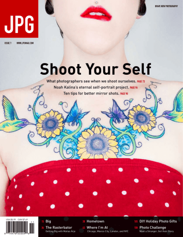 brave new photography issue 7 www.jpgmag.com Shoot Your Self What photographers see when we shoot ourselves. PAGE 73 Noah Kalina’s eternal self-portrait project. PAGE 96 Ten tips for better mirror shots. PAGE 98 USA $5.99 CAN $7.49 15 Big 38 Hometown 105 DIY Holiday Photo Gifts 36 The Rasterbator 63 Where I’m At 108 Photo Challenge Getting Big with Matias Ärje Chicago, Mexico City, London, and NYC Meet a Stranger, Get their Story SXSW INTERACTIVE FESTIVAL: CONNECT, DISCOVER, INSPIRE Attracting digital creatives as well as new media entrepreneurs, the 14th annual South by Southwest (SXSW) Interactive Festival gives you both practical how-to information as well as unparalleled career inspiration. Attend this legendary gathering of the tribes to renew your link to the cutting edge. Opening Remarks by Kathy Sierra of the "Creating Passionate Users" blog on Saturday, March 10 at 2:00 pm Keynote Conversation with award-winning television personality Dan Rather on Monday, March 12 at 2:00 pm Keynote Speech by Will Wright, creator of "SimCity" and "Spore," on Tuesday, March 13 at 2:00 pm Enter the 2007 Web Awards Competition online at sxsw.com/web_awards. Final deadline is December 15 Visit sxsw.com/interactive to register to attend and to get conference updates. JPG Magazine is made by you. Join us at jpgmag.com. JPG SIGHTING READ ME What you’re holding in your hands was created by thousands of people. Bunny checks out the photo of herself in JPG Magazine Issue 4. Purely Postmodern by Jamie Goodridge Shoot your JPG! Take this magazine someplace nice and shoot it: jpgmag.com/themes/2 JPG is not a normal magazine. Normal magazines are put together by an elite cadre of people who think they know more than you do. They’re riddled by payola and run by personal agendas. Everyone talks about the death of the magazine business. We say, if magazines are dying, it’s their own damn fault. Hubris has felled larger things. We’re something different. Instead of talking to so-called experts, we talked to you – the everyday photographers with authentic experience in the trenches. Instead of running yet another “Top Digital SLRs” article written by someone who’s spent a few days in a lab with some cameras, we found photographers with first-hand experience and asked them to write about the tools they love in a new section called “My Precious.” And instead of pretending we’re the know-it-all experts, we gave you the tools to help determine what goes in each issue. Here’s how it works: We announce the issue’s themes on our website (jpgmag.com) two months in advance. Anyone can submit one photo per theme. Then the JPG community reviews the submissions. Everyone gets one up or down vote per submission. Finally, at the very end, the JPG editors review the submissions, as organized by you, and assemble the issue based on a combination of community voice and editorial vision. Photographers who get published get free subscriptions and $100. You’re holding the result in your hands. And here’s the best part: At this very moment, next issue’s themes are open on the JPG website, just waiting for your submissions and voting. You’ll also see lots of calls to participate in the pages of this magazine. The message is clear: JPG Magazine is made by you. Where We’ve Been JPG Magazine started two years ago. Founded by myself and my wife, Heather Champ, we wanted JPG to be a salute to a new generation of photographers. People who, like us, love photography and have found themselves sharing photos online. We wanted to take the best of that work and honor it in print. So we named the magazine JPG after the file format most digital cameras used. (RAW had more grotesque implications, and besides, there’s already a Raw Magazine.) JPG produced six issues in its first two years. We were like a digital hermit crab, using all the free online services we could find – Gmail.com for mail, Flickr.com for discussions, Lulu.com for print-on-demand – all in our spare time. In 2006, we grew up fast. My longtime friend Paul Cloutier and I founded 8020 Publishing, and made JPG our first magazine. This issue marks JPG’s rebirth. Instead of being a small, expensive, occasional, boutique book, JPG is now a magazine-sized book, professionally printed and distributed six times a year. Subscriptions are now available and cost just a few bucks more than a single issue used to. But the biggest change is the website. On jpgmag.com, you can submit photos and articles to the magazine, see all the contributions by your fellow photographers, and help choose what goes in each issue. We’re on our way to being the first truly community-driven magazine. But we’re not there yet. Where We’re Going Look for new tools and more fun ways to get involved in the coming months and years. We’re also planning gallery shows and books. We want to give as much back as possible to the awesomely talented photographers who make JPG what it is. In This Issue For this special relaunch issue, we picked three themes: Big (because we’re embiggening the magazine), Hometown (it’s where the heart is), and Self-Portraiture (since this magazine is all about you, we wanted to see what you looked like). The response just blew us away. We recieved thousands of submissions in just a few weeks. Huge thanks to everyone who submitted, voted, and helped. This issue also showcases our first sponsored theme. Special thanks also to Metroblogging.com for sponsoring the Hometown theme. Join Us So here’s us, on the raggedy edge. Thanks for picking up this issue. We hope you like it. And if you don’t, then make the next one better! Join us at jpgmag.com. What it is, is up to you. Thanks for coming on this crazy ride with us. – Derek Powazek ISSUE 7 STATS 2,378 photos submitted by 1,434 people. 123,559 votes cast by 3,141 people. 70 photos published in issue 7 themes. Top ten countries of issue 7 photographers: USA, Canada, Australia, Germany,