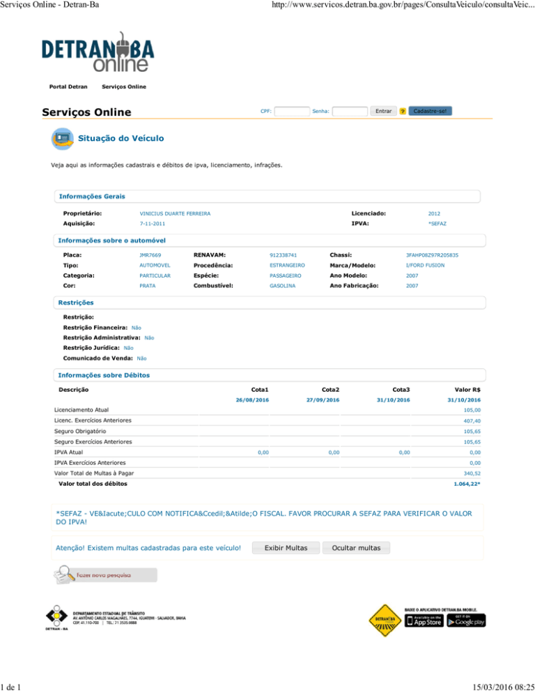 Serviços Online - Detran-Ba 1 de 1 Portal Detran http://www.servicos.detran.ba.gov.br/pages/ConsultaVeiculo/consultaVeic... Serviços Online Serviços Online CPF: Entrar Senha: Cadastre-se! Situação do Veículo Veja aqui as informações cadastrais e débitos de ipva, licenciamento, infrações. Informações Gerais Proprietário: VINICIUS DUARTE FERREIRA Licenciado: 2012 Aquisição: 7-11-2011 IPVA: *SEFAZ Informações sobre o automóvel Placa: JMR7669 RENAVAM: 912338741 Chassi: 3FAHP08Z97R205835 Tipo: AUTOMOVEL Procedência: ESTRANGEIRO Marca/Modelo: I/FORD FUSION Categoria: PARTICULAR Espécie: PASSAGEIRO Ano Modelo: 2007 Cor: PRATA Combustível: GASOLINA Ano Fabricação: 2007 Restrições Restrição: Restrição Financeira: Não Restrição Administrativa: Não Restrição Jurídica: Não Comunicado de Venda: Não Informações sobre Débitos Descrição Cota1 Cota2 Cota3 Valor R$ 26/08/2016 27/09/2016 31/10/2016 31/10/2016 Licenciamento Atual 105,00 Licenc. Exercícios Anteriores 407,40 Seguro Obrigatório 105,65 Seguro Exercícios Anteriores IPVA Atual 105,65 0,00 0,00 IPVA Exercícios Anteriores 0,00 0,00 0,00 Valor Total de Multas à Pagar 340,52 Valor total dos débitos 1.064,22* *SEFAZ - VEÍCULO COM NOTIFICAÇÃO FISCAL. FAVOR PROCURAR A SEFAZ PARA VERIFICAR O VALOR DO IPVA! Atenção! Existem multas cadastradas para este veículo! Exibir Multas Ocultar multas 15/03/2016 08:25