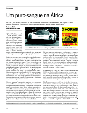 Rearview Um puro-sangue na África Em 1972, Jan Balder participou de uma corrida em Nova Lisboa (atual Huambo), em Angola — então colônia portuguesa. Ele relembra sua atuação na única vez em que pilotou um Porsche. Texto: Jan Balder Fotos: arquivo Jan Balder E m 1972, fui convidado para disputar, em dupla com Norman Casari, a segunda edição da Seis Horas de Nova Lisboa, em Angola, na África portuguesa. Havíamos estado lá no ano anterior, mas problemas mecânicos em nossa Lola O Porsche 907 de Jan Balder/Norman Casari: quinto lugar no grid. À direita, o cartaz promocional da 6 Horas de Nova Lisboa. T70 não permitiram alinhar na corrida. Semanas Na volta de apresentação, o pneu traseiro vazou e a equipe o depois, em Interlagos, ela foi destruída pelo fogo na curva 3 encheu com um produto de vedação, novidade na época. de Interlagos, quando era pilotada pelo próprio Norman. Norman largou muito bem, mantendo a quinta posição e sendo o melhor Porsche na corrida. Depois, assumi o volanEstávamos sem carro, mas os simpáticos organizadores porte e, com quase metade da prova, começou a jorrar óleo no tugueses em Angola alugaram um Porsche 907 de uma equipára-brisa. A luz de pressão começou a acender e parei no pe suíça. Fiquei entusiasmado: eu nunca havia sentado em box. O reparo foi feito com uma cola no radiador, e era difíum Porsche de corrida. A equipe, Wicky Racing Team, era cil acreditar que vedasse em dia de forte calor. Mas o robusparticular e tinha três Porsche – exatamente os modelos de to motor resistia bravamente e continuei na corrida, corrida da marca que existiam no Brasil: 908, 910 (iguais aos tentando recuperar a quinta posição. utilizados pela equipe Hollywood) e 907 (de Angi Munhoz e Freddy Giorgi). Depois de recepcionados pelo proprietário da O suave ruído do motor de 2 litros e 4 comandos girando a equipe, André Wicky, fomos à oficina para ajustar pedais, 8.000 rpm (limite estabelecido pela equipe) era muito agrabanco e outros detalhes do Porsche 907. O carro havia pardável. O câmbio de 5 marchas era de engate curto e rápido, ticipado da 24 Horas de Le Mans e de lá, segundo Wicky, foi e os freios eram ótimos para aquele circuito de baixa velocipara Stuttgart para uma revisão geral. O carro estava imundade que exigia muitas freadas. Não acreditava que estava do e aproveitamos para limpá-lo. Seguimos para o circuito de sentado em um Porsche puro-sangue de corridas. rua, o mesmo traçado do ano anterior. Norman saiu para “pegar a mão” da pista e, para espanto de todos, estabeleceu um incrível recorde de volta – os cronometristas erraram nosso tempo em 10 segundos. Girão pediu para ficarmos calados e André Wicky pediu uma reunião conosco. Ele se entusiasmou tanto que queria mudar as cláusulas do nosso contrato para ficar com o prêmio de chegada, caso houvesse. Neguei e disse-lhe que o direito do prêmio era do Automóvel Clube de Huambo, que havia alugado o carro. No segundo treino, encurtamos a relação de câmbio e melhoramos o nosso tempo real, ficando em quinto lugar no grid, em meio a alguns veículos de maior cilindrada. Lá pelas tantas, na curva mais lenta do circuito, feita em primeira marcha, o carro deu uma ligeira atravessada, apontou com o pneu de dentro para a ponta da guia e bati. Resultado: pneu murcho, barra da direção quebrada e, pior, o volante de direção girou na minha mão e meu dedo virou uma bola. Doía bastante e me arrastei até o box, onde constatei que o pneu traseiro (o mesmo que murchara na largada) também estava “no chão”. Isso explicava a saída de trajetória naquela curva. Fiquei chateado porque o Norman havia andado o fino e eu joguei a corrida fora. Ficou a enorme satisfação – e a saudade – de pilotar o Porsche 907. Jan Balder foi piloto, construtor de carros de corrida, chefe de equipe e jornalista. É autor do livro “Nos bastidores do automobilismo – Por que tantas vezes campeão?”. 78 Clubnews 20
