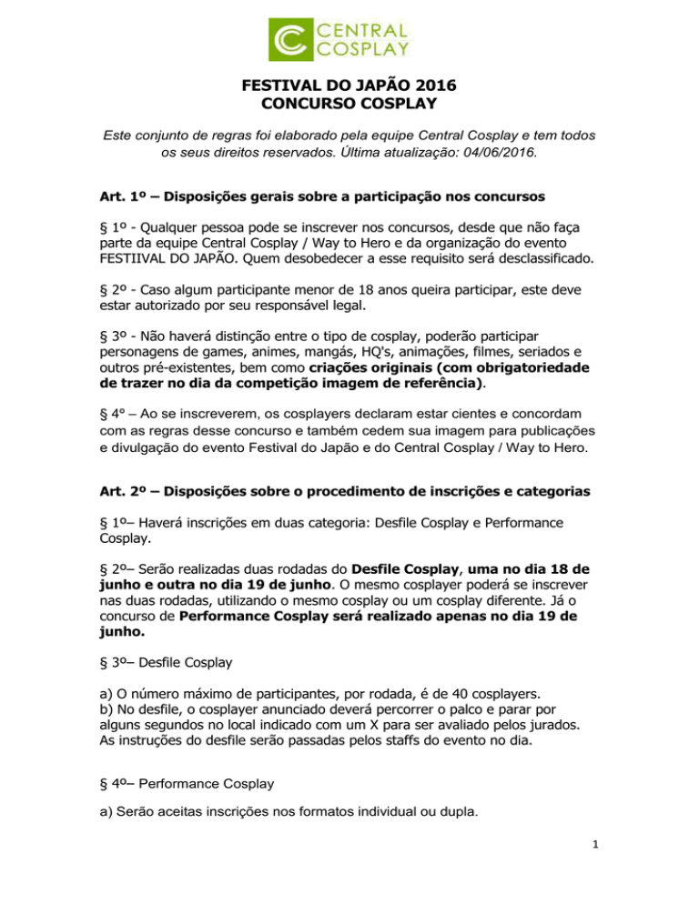 FESTIVAL DO JAPÃO 2016 CONCURSO COSPLAY Este conjunto de regras foi elaborado pela equipe Central Cosplay e tem todos os seus direitos reservados. Última atualização: 04/06/2016. Art. 1º – Disposições gerais sobre a participação nos concursos § 1º - Qualquer pessoa pode se inscrever nos concursos, desde que não faça parte da equipe Central Cosplay / Way to Hero e da organização do evento FESTIIVAL DO JAPÃO. Quem desobedecer a esse requisito será desclassificado. § 2º - Caso algum participante menor de 18 anos queira participar, este deve estar autorizado por seu responsável legal. § 3º - Não haverá distinção entre o tipo de cosplay, poderão participar personagens de games, animes, mangás, HQ's, animações, filmes, seriados e outros pré-existentes, bem como criações originais (com obrigatoriedade de trazer no dia da competição imagem de referência). § 4º – Ao se inscreverem, os cosplayers declaram estar cientes e concordam com as regras desse concurso e também cedem sua imagem para publicações e divulgação do evento Festival do Japão e do Central Cosplay / Way to Hero. Art. 2º – Disposições sobre o procedimento de inscrições e categorias § 1º– Haverá inscrições em duas categoria: Desfile Cosplay e Performance Cosplay. § 2º– Serão realizadas duas rodadas do Desfile Cosplay, uma no dia 18 de junho e outra no dia 19 de junho. O mesmo cosplayer poderá se inscrever nas duas rodadas, utilizando o mesmo cosplay ou um cosplay diferente. Já o concurso de Performance Cosplay será realizado apenas no dia 19 de junho. § 3º– Desfile Cosplay a) O número máximo de participantes, por rodada, é de 40 cosplayers. b) No desfile, o cosplayer anunciado deverá percorrer o palco e parar por alguns segundos no local indicado com um X para ser avaliado pelos jurados. As instruções do desfile serão passadas pelos staffs do evento no dia. § 4º– Performance Cosplay a) Serão aceitas inscrições nos formatos individual ou dupla. 1 b) O número máximo de inscrições será de 20 cosplayers (individuais ou duplas). c) Os participantes, caso desejem, podem se apresentar com até dois staffs, vestido dos pés à cabeça com roupas pretas e sem qualquer estampa, durante toda performance. d) As performances podem seguir o modelo tradicional, que segue o roteiro original da história de origem do personagem, ou o modelo livre, cuja história não precisa necessariamente estar atrelada à narrativa da obra original. § 5º - Os cosplayers podem realizar sua pré-inscrição online no link: http://goo.gl/forms/bZRVwHcq5rXNmoL63. A pré-inscrição não é obrigatória, é apenas um meio do participante garantir sua vaga no concurso com antecedência. Aquele que optar por fazê-la deverá efetivar sua inscrição no local do concurso com no máximo 1 (uma) hora de atencedência ao início do mesmo, caso contrário a vaga será liberada para eventuais outros participantes. § 6º - Os cosplayers também poderão se inscrever no concurso nos dias 18 e 19 de junho de 2016, no FESTIVAL DO JAPÃO. As inscrições serão encerradas 30 (trinta) minutos antes da realização do concurso. Não serão aceitas inscrições que ultrapassarem esse limite de tempo. § 7º - O horário previsto para início dos concursos serão disponibilizados na programação do evento. § 8º - O participante, ao preencher a ficha de inscrição, concorda com todas as regras do concurso. Art.3º - Disposições acerca das penalidades e das proibições § 1º - É terminantemente proibida a utilização de materiais perigosos e nocivos à saúde ou vida dos presentes. O cosplayer não poderá utilizar os tipos de materiais listados a seguir: pólvora, munição, armas com fio de corte, ácidos e outros materiais tóxicos ou inflamáveis. A utilização de qualquer tipo de material julgado perigoso pela coordenação do concurso acarretará na desclassificação do participante. § 2º - Não será permitido o uso de materiais que prejudiquem a limpeza do palco. Qualquer tipo de substância pegajosa, grudenta e/ou líquida, não poderá ser utilizada. Caso contrário, o ato acarretará na desclassificação imediata do cosplayer. § 3º - É vetado ao cosplayer, sob pena de desclassificação, jogar qualquer tipo de material ou objeto de qualquer natureza em direção ao público, mesmo que este não seja aparentemente perigoso. Esse critério é necessário para manter a segurança do público e a limpeza do espaço. 2 § 4º - Caso o cosplayer use POCs, papel picado ou outro artifício que suje o palco, deverá avisar previamente aos staffs, para que tomem as devidas precauções. Vale lembrar que o uso de POC com pólvora viola o parágrafo primeiro desse artigo e acarreta em desclassificação. § 5º - Não será permitida nenhuma forma de nudez, insinuante ou obscena, assim como comportamentos da mesma natureza. Qualquer tipo de comportamento que infrinja essa regra acarretará em desclassificação. Caso esteja em dúvida se o seu cosplay está insinuante demais ou não, entre em contato com os staffs para avaliação do seu caso. § 6º - O cosplayer que não estiver na beira do palco quando chamado será desclassificado por ausência e não terá de forma alguma direito a apresentação posterior. Para evitar problemas, sugerimos que todos os participantes estejam ao lado do palco no mínimo 30 (trinta) minutos antes do concurso. § 7º - Os participantes que deixarem a ficha de inscrição incompleta ou com dados inválidos serão desclassificados. § 8º - A falta de respeito aos staffs, organizadores e juízes acarretará na desclassificação do cosplayer. Art. 4º – Disposições acerca dos julgamentos e resultados do DESFILE COSPLAY § 1º - Serão 3 (três) os juízes para o DESFILE COSPLAY. § 2º - Para cada critério avaliado será dada uma nota entre 0 e 10. Os critérios de julgamento ficaram decididos da seguinte forma: Desfile Cosplay: COS (peso 2