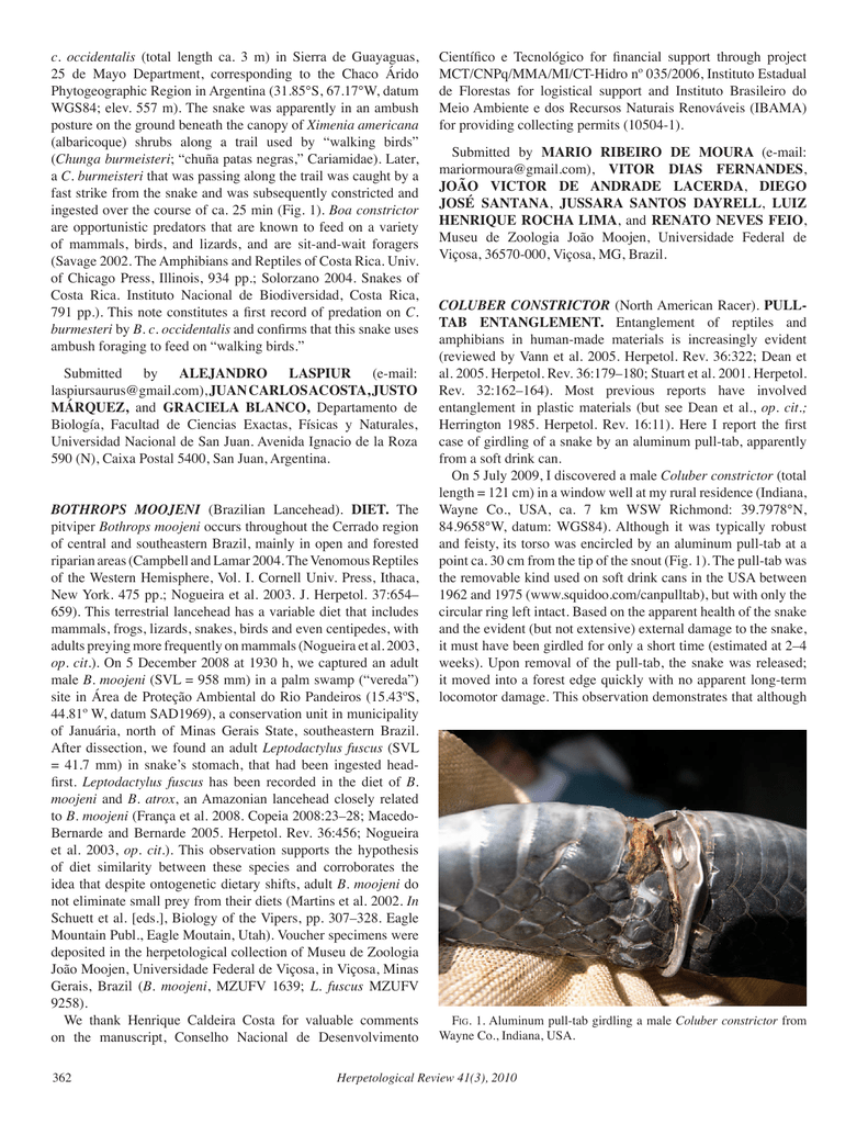 c. occidentalis (total length ca. 3 m) in Sierra de Guayaguas, 25 de Mayo Department, corresponding to the Chaco Árido Phytogeographic Region in Argentina (31.85°S, 67.17°W, datum WGS84; elev. 557 m). The snake was apparently in an ambush posture on the ground beneath the canopy of Ximenia americana (albaricoque) shrubs along a trail used by “walking birds” (Chunga burmeisteri; “chuña patas negras,” Cariamidae). Later, a C. burmeisteri that was passing along the trail was caught by a fast strike from the snake and was subsequently constricted and ingested over the course of ca. 25 min (Fig. 1). Boa constrictor are opportunistic predators that are known to feed on a variety of mammals, birds, and lizards, and are sit-and-wait foragers (Savage 2002. The Amphibians and Reptiles of Costa Rica. Univ. of Chicago Press, Illinois, 934 pp.; Solorzano 2004. Snakes of Costa Rica. Instituto Nacional de Biodiversidad, Costa Rica, 791 pp.). This note constitutes a first record of predation on C. burmesteri by B. c. occidentalis and confirms that this snake uses ambush foraging to feed on “walking birds.” Submitted by ALEJANDRO LASPIUR (e-mail: [email protected]), JUAN CARLOS ACOSTA, JUSTO MÁRQUEZ, and GRACIELA BLANCO, Departamento de Biología, Facultad de Ciencias Exactas, Físicas y Naturales, Universidad Nacional de San Juan. Avenida Ignacio de la Roza 590 (N), Caixa Postal 5400, San Juan, Argentina. BOTHROPS MOOJENI (Brazilian Lancehead). DIET. The pitviper Bothrops moojeni occurs throughout the Cerrado region of central and southeastern Brazil, mainly in open and forested riparian areas (Campbell and Lamar 2004. The Venomous Reptiles of the Western Hemisphere, Vol. I. Cornell Univ. Press, Ithaca, New York. 475 pp.; Nogueira et al. 2003. J. Herpetol. 37:654– 659). This terrestrial lancehead has a variable diet that includes mammals, frogs, lizards, snakes, birds and even centipedes, with adults preying more frequently on mammals (Nogueira et al. 2003, op. cit.). On 5 December 2008 at 1930 h, we captured an adult male B. moojeni (SVL = 958 mm) in a palm swamp (“vereda”) site in Área de Proteção Ambiental do Rio Pandeiros (15.43ºS, 44.81º W, datum SAD1969), a conservation unit in municipality of Januária, north of Minas Gerais State, southeastern Brazil. After dissection, we found an adult Leptodactylus fuscus (SVL = 41.7 mm) in snake’s stomach, that had been ingested headfirst. Leptodactylus fuscus has been recorded in the diet of B. moojeni and B. atrox, an Amazonian lancehead closely related to B. moojeni (França et al. 2008. Copeia 2008:23–28; MacedoBernarde and Bernarde 2005. Herpetol. Rev. 36:456; Nogueira et al. 2003, op. cit.). This observation supports the hypothesis of diet similarity between these species and corroborates the idea that despite ontogenetic dietary shifts, adult B. moojeni do not eliminate small prey from their diets (Martins et al. 2002. In Schuett et al. [eds.], Biology of the Vipers, pp. 307–328. Eagle Mountain Publ., Eagle Moutain, Utah). Voucher specimens were deposited in the herpetological collection of Museu de Zoologia João Moojen, Universidade Federal de Viçosa, in Viçosa, Minas Gerais, Brazil (B. moojeni, MZUFV 1639; L. fuscus MZUFV 9258). We thank Henrique Caldeira Costa for valuable comments on the manuscript, Conselho Nacional de Desenvolvimento 362 Científico e Tecnológico for financial support through project MCT/CNPq/MMA/MI/CT-Hidro nº 035/2006, Instituto Estadual de Florestas for logistical support and Instituto Brasileiro do Meio Ambiente e dos Recursos Naturais Renováveis (IBAMA) for providing collecting permits (10504-1). Submitted by MARIO RIBEIRO DE MOURA (e-mail: [email protected]), VITOR DIAS FERNANDES, JOÃO VICTOR DE ANDRADE LACERDA, DIEGO JOSÉ SANTANA, JUSSARA SANTOS DAYRELL, LUIZ HENRIQUE ROCHA LIMA, and RENATO NEVES FEIO, Museu de Zoologia João Moojen, Universidade Federal de Viçosa, 36570-000, Viçosa, MG, Brazil. Coluber constrictor (North American Racer). PULLtAB entanglement. Entanglement of reptiles and amphibians in human-made materials is increasingly evident (reviewed by Vann et al. 2005. Herpetol. Rev. 36:322; Dean et al. 2005. Herpetol. Rev. 36:179–180; Stuart et al. 2001. Herpetol. Rev. 32:162–164). Most previous reports have involved entanglement in plastic materials (but see Dean et al., op. cit.; Herrington 1985. Herpetol. Rev. 16:11). Here I report the first case of girdling of a snake by an aluminum pull-tab, apparently from a soft drink can. On 5 July 2009, I discovered a male Coluber constrictor (total length = 121 cm) in a window well at my rural residence (Indiana, Wayne Co., USA, ca. 7 km WSW Richmond: 39.7978°N, 84.9658°W, datum: WGS84). Although it was typically robust and feisty, its torso was encircled by an aluminum pull-tab at a point ca. 30 cm from the tip of the snout (Fig. 1). The pull-tab was the removable kind used on soft drink cans in the USA between 1962 and 1975 (www.squidoo.com/canpulltab), but with only the circular ring left intact. Based on the apparent health of the snake and the evident (but not extensive) external damage to the snake, it must have been girdled for only a short time (estimated at 2–4 weeks). Upon removal of the pull-tab, the snake was released; it moved into a forest edge quickly with no apparent long-term locomotor damage. This observation demonstrates that although Fig. 1. Aluminum pull-tab girdling a male Coluber constrictor from Wayne Co., Indiana, USA. Herpetological Review 41(3), 2010