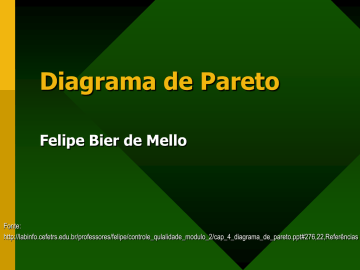 Diagrama de Pareto Felipe Bier de Mello Fonte: http://labinfo.cefetrs.edu.br/professores/felipe/controle_qulalidade_modulo_2/cap_4_diagrama_de_pareto.ppt#276,22,Referências Introdução • Introdução ao princípio de Pareto e conceitos preliminares • Construção de tabelas e do Gráfico de Pareto • Tipos de gráficos e exemplos Conceitos básicos • O gráfico de Pareto dispõe a informação de modo a tornar evidente e visual a priorização de problemas e projetos • O princípio de Pareto estabelece que os problemas relacionados a qualidade de produtos e processos, os quais resultam em perdas, podem ser classificados em duas categorias: – “poucos vitais” – representam poucos problemas que resultam em grandes perdas – “muitos triviais” – representam muitos problemas que resultam em poucas perdas Um problema pode ser atribuído a um pequeno número de causas Exemplo de gráfico de Pareto Gráfico de Pareto Problemas em filme extrudado 100 120 100 Percent 140 Linha do percentual acumulado Eixo da freqüência 80 78 50 60 Eixo percentual Count 40 Gráfico de barras 20 23 12 0 Ponto marrorm 0 Olho de peixe Linha de fluxo Marcas da matriz Sujidade Problemas estratificados Construção do gráfico • O processo de construção do gráfico de Pareto é dividido em duas partes: – Coleta e preparo dos dados; – Construção do gráfico Coleta e preparo dos dados • Defina o tipo de problema a ser estudado • Liste os possíveis fatores de estratificação (categorias) do problema escolhido – Crie a categoria “outros” para agrupar as ocorrências menos freqüentes – Cada ocorrência da categoria “outros” deve ser completamente identificada • Estabeleça o método e o período de coleta de dados • Elabore uma lista de verificação apropriada para coletar os dados Coleta e preparo dos dados • Preencha a lista de verificação e registre o total de vezes que cada categoria foi observada e o número total de observações • Elabore uma planilha de dados para o gráfico de Pareto, com as seguintes colunas: – Categorias – Quantidades (totais individuais) – Totais acumulados – Percentagens do total geral – Percentagens acumuladas • Preencha a planilha de dados, listando as categorias em ordem decrescente de quantidade Planilha genérica de dados Coluna 1 Coluna 2 Coluna 3 Coluna 4 Categoria Quantidade Total Acumulado 1. ZYXW Q1 Q1 Q1/Qtotal x 100 P1 2. YZWX Q2 Q1 + Q2 Q2/Qtotal x 100 P1 + P2 3. WXZY Q3 Q1 + Q2 + Q3 Q3/Qtotal x 100 P1 + P2 + P3 ... ... ... ... ... Porcentagem do Porcentagem total geral (%) acumulada (%) Outros Totais Qtotal Coluna 5 100% Exemplo Causas de paradas constantes de uma linha de revestimento têxtil por transferência Coluna 1 Coluna 2 Coluna 3 Coluna 4 Coluna 5 Causa da parada Quantidade Total Acumulado 1. Arrepentou papel na junta 66 66 53,23% 53,23% 2. Artigo não destacou do papel 21 87 16,94% 70,16% 3. Arrebentou papel na faca 12 99 9,68% 79,84% 4. Enrosco do suporte 12 111 9,68% 89,52% 5. Falta de energia 7 118 5,65% 95,16% 6. Outros 6 124 4,84% 100% Totais 124 Porcentagem do Porcentagem total geral (%) acumulada (%) 100% Construção do Gráfico • Trace dois eixos verticais de mesmo comprimento e um eixo horizontal • Marque o eixo horizontal no lado esquerdo com a escala de zero até o total da coluna Quantidade (Q) da planilha de dados. Identifique o nome da variável representada neste eixo e a unidade de medida utilizada, caso seja necessário • Marque o eixo vertical do lado direito com uma escala de zero até 100% – Identifique este eixo como “Percentagem acumulada (%) • Divida o eixo horizontal em um número de intervalos igual ao número de categorias constantes na planilha de dados Construção do Gráfico • Identifique cada intervalo do eixo horizontal escrevendo os nomes das categorias, na mesma ordem em que eles aparecem na planilha de dados • Construa um gráfico de barras utilizando a escala do eixo vertical do lado esquerdo • Construa a curva de Pareto marcando os valores acumulados (percentagem acumulada), acima e no lado direito (ou no centro) do intervalo de cada categoria, e ligue os pontos por segmentos de reta • Registre outras informações que devam constar no gráfico: – Título – Período de coleta de dados – Número total de itens inspecionados – Objetivo do estudo realizado Exemplo Causas de paradas constantes de uma linha de revestimento têxtil por transferência Gráfico de Pareto 140 100 120 100 80 60 50 66 lta Fa na s ia ro rg ut e O en de rte po su l pe pa ou na ac st de l pe pa do o nã 12 o sc ro En go 12 u to en eb ti Ar u to en ep 0 21 r Ar 20 r Ar Count 40 0 Exemplo programa Excel Gráfico de Pareto para estratificação e priorização das causas de paradas de m áquina em um a linha de revestim ento têxtil por transferência 120,00% Freqüencia 140 120 100,00% 100 80,00% 80 60,00% 60 40,00% 40 20,00% 20 0 0,00% 1. Arrepentou 2. Artigo não 3. Arrebentou 4. Enrosco do papel na junta destacou do papel na faca suporte papel Causas 5. Falta de energia 6. Outros Gráfico de Pareto para Efeitos • Qualidade: – Percentual de produtos defeituosos, número de reclamações de clientes, número de devoluções de produtos • Custo: – Perdas de produção, gastos com reparos de produtos dentro do prazo de garantia, custos de manutenção de equipamentos • Entrega: – Índices de atraso de entrega, índices de entrega em quantidade e local errados, falta de matéria-prima em estoque • Moral: – Índices de reclamações trabalhistas, índices de demissões, absenteísmo • Segurança: – Número de acidentes de trabalho, índices de gravidade dos acidentes, número de acidentes sofridos por usuários do produto Gráfico de Pareto para Causas • Máquinas: – Desgaste, manutenção, modo de operação, tipo de ferramenta utilizada • Matérias-primas: – Fornecedor, lote, tipo, armazenamento, transporte • Medições: – Calibraç