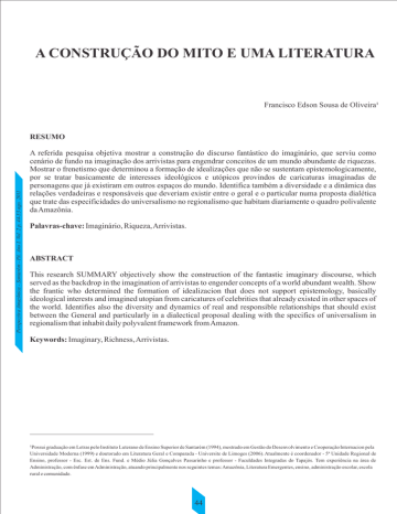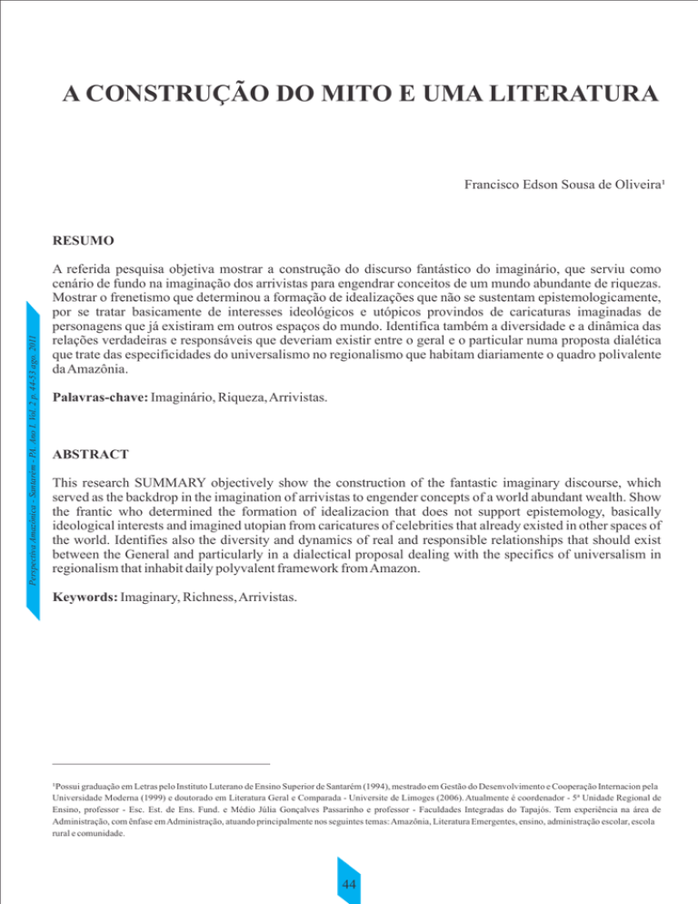 A CONSTRUÇÃO DO MITO E UMA LITERATURA Francisco Edson Sousa de Oliveira¹ Perspectiva Amazônica - Santarém - PA. Ano I. Vol. 2 p. 44-53 ago. 2011 RESUMO A referida pesquisa objetiva mostrar a construção do discurso fantástico do imaginário, que serviu como cenário de fundo na imaginação dos arrivistas para engendrar conceitos de um mundo abundante de riquezas. Mostrar o frenetismo que determinou a formação de idealizações que não se sustentam epistemologicamente, por se tratar basicamente de interesses ideológicos e utópicos provindos de caricaturas imaginadas de personagens que já existiram em outros espaços do mundo. Identifica também a diversidade e a dinâmica das relações verdadeiras e responsáveis que deveriam existir entre o geral e o particular numa proposta dialética que trate das especificidades do universalismo no regionalismo que habitam diariamente o quadro polivalente daAmazônia. Palavras-chave: Imaginário, Riqueza,Arrivistas. ABSTRACT This research SUMMARY objectively show the construction of the fantastic imaginary discourse, which served as the backdrop in the imagination of arrivistas to engender concepts of a world abundant wealth. Show the frantic who determined the formation of idealizacion that does not support epistemology, basically ideological interests and imagined utopian from caricatures of celebrities that already existed in other spaces of the world. Identifies also the diversity and dynamics of real and responsible relationships that should exist between the General and particularly in a dialectical proposal dealing with the specifics of universalism in regionalism that inhabit daily polyvalent framework from Amazon. Keywords: Imaginary, Richness,Arrivistas. ¹Possui graduação em Letras pelo Instituto Luterano de Ensino Superior de Santarém (1994), mestrado em Gestão do Desenvolvimento e Cooperação Internacion pela Universidade Moderna (1999) e doutorado em Literatura Geral e Comparada - Universite de Limoges (2006). Atualmente é coordenador - 5ª Unidade Regional de Ensino, professor - Esc. Est. de Ens. Fund. e Médio Júlia Gonçalves Passarinho e professor - Faculdades Integradas do Tapajós. Tem experiência na área de Administração, com ênfase em Administração, atuando principalmente nos seguintes temas:Amazônia, Literatura Emergentes, ensino, administração escolar, escola rural e comunidade. 44 O desenvolvimento da Amazônia nas últimas décadas tem sido objeto de debates e interesses dos primeiros arrivistas, desde o início do processo de colonização. Porém, os discursos que tratam sobre o tipo de desenvolvimento apropriado para essa espacialidade apresentam contornos diferentes, principalmente, quando a referência são os aspectos: antropológicos, políticos, culturais e históricos. São apresentados os sonhos do fantástico que a Amazônia sempre representou na imaginação dos colonizadores ao longo da história, idealizavam-se riquezas na superfície da terra, animais monstruosos no seio da selva e adamitas intrépidos que habitavam o fundo dos rios e as densas florestas. O construto medieval servia de referencial para consubstanciar as ideias inusitadas projetadas durante o período das grandes navegações, principalmente para alimentar o misticismo que pairava sobre a possibilidade de explicar o Céu e o Inferno que cobriam tão vasta planície inatura de um mundo, ainda em segredo para a maioria. Nessa pesquisa, busca-se mostrar que a construção do imaginário sobre a Amazônia deu-se basicamente pela idealização e não pelo amalgamento dos elementos em causa, que realmente poderiam ter servido como espírito de construção antropológica para um desenvolvimento nteses publicadas, principalmente, na Europa sobre a invenção daAmazônia. Criticamente, a Amazõnia sofreu grandes involuções ocasionando-lhe o subdesenvolvimento, ilustrando um cenário maravilhoso com visão europeizada e uma visão greco-latina contada por heróis conquistadores. Expondo assim, uma realidade de que a Amazônia não foi descoberta nem inventada, mas sim construída, fabricada sob a égide do imaginário, do engenhoso artífice que lembrava a Índia (HOLANDA, 1985). O referido artigo então, procura num primeiro momento refletir sobre as ideias que foram sendo construídas na imaginação dos arrivistas que “viajavam” em busca de riquezas e novas dimensões territoriais, sem contudo, compreender o mundo real daquela espacialidade. E enfatizar que é esse discurso que ainda se repete quando da implantação de grandes empreendimentos para aAmazônia. Posteriormente, aponta-se para os aspectos vários vivenciados pelo nativismo ameríndio já existente naquelas terras devolutas, porém, delimitadas por limites do ponto de vista antropológico, embora desconhecida do velho mundo, e chama-se a atenção para uma necessidade emergente da construção de um discurso que se sustente na identidade e nos pilares de desenvolvimento que convergem e emergem dessa espacialidade. 2 ACONSTRUÇÃO DO MITO E UMALITERATURA AAmazônia desvenda e esconde a utopia do Novo Mundo. Desde o século XVI até o fim do século XX, quando já se anuncia o XXI, há muito de utopia no que se pensar e dizer sobra aAmazônia. São muitos, em todo o mundo, que ainda sonham com a ilusão de que ali se escondem exotismos, deslumbramentos, maravilhas. Muito do que se diz sobre a Amazônia, em prosa e verso, nas mais diversas línguas, expressa a ilusão do outro mundo. Ocorre que aAmazônia tornou-se o emblema de uma utopia situada na natureza. 2 Holanda, Sérgio Buarque de Visão do Paraíso. Os motivos edênicos no descobrimento e colonização do Brasil, 4 ed. São Paulo, Nacional, 1985, p. 62 45 Perspectiva Amazônica - Santarém - PA. Ano I. Vol. 2 p. 44-53 ago. 2011 1 INTRODUÇÃO Perspectiva Amazônica - Santarém - PA. Ano I. Vol. 2 p. 44-53 ago. 2011 Para os povos que viviam na outra metade do mundo, significou o contato com uma n