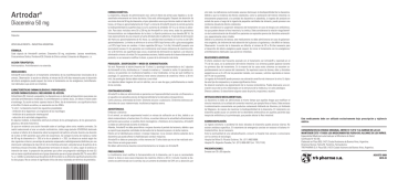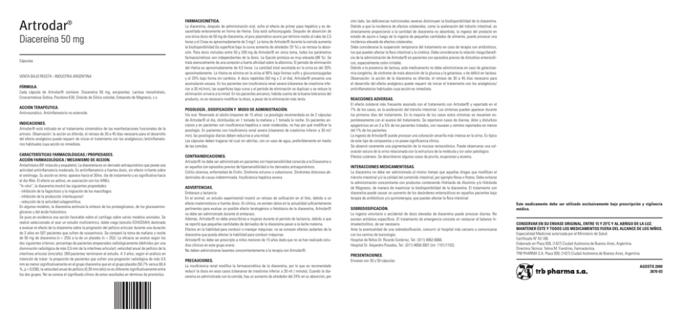 Artrodar® Diacereína 50 mg Cápsulas VENTA BAJO RECETA - INDUSTRIA ARGENTINA FÓRMULA. Cada cápsula de Artrodar® contiene: Diacereína 50 mg, excipientes: Lactosa monohidrato, Croscarmelosa Sódica, Povidona K30, Dióxido de Silicio coloidal, Estearato de Magnesio, c.s. ACCIÓN TERAPÉUTICA. Antirreumático. Antiinflamatorio no esteroide. INDICACIONES. Artrodar® está indicado en el tratamiento sintomático de las manifestaciones funcionales de la artrosis. Observación: la acción es diferida; el retraso de 30 a 45 días necesario para el desarrollo del efecto analgésico puede requerir de iniciar el tratamiento con los analgésicos /antiinflamatorios habituales cuya acción es inmediata. CARACTERÍSTICAS FARMACOLÓGICAS / PROPIEDADES. ACCIÓN FARMACOLÓGICA / MECANISMO DE ACCION. Antiartrósico (M: músculo y esqueleto). La diacereína es un derivado antraquinónico que posee una actividad antiinflamatoria moderada. Es antiinflamatorio a fuertes dosis, sin efecto irritante sobre el estómago. Su acción es lenta: aparece hacia el 30mo. día de tratamiento y es significativa hacia el día 45to. El efecto es aditivo, en asociación con los AINEs. “In vitro”, la diacereína mostró las siguientes propiedades: - inhibición de la fagocitosis y la migración de los macrófagos - inhibición de la producción interleuquina1 - reducción de la actividad colagenolítica. En algunos modelos, la diacereína estimula la síntesis de los proteoglicanos, de los glucosaminoglicanos y del ácido hialurónico. Se puso en evidencia una acción favorable sobre el cartílago sobre varios modelos animales. Se realizó seleccionado al azar un estudio multicéntrico, doble ciego (estudio ECHODIAH) destinado a evaluar el efecto de la diacereína sobre la progresión del pellizco articular durante una duración de 3 años en 507 pacientes que sufren de coxoartrosis. Se comparó la toma de mañana y noche de 50 mg de diacereína (n = 255) a la de un placebo (n = 252). La eficacia se evaluó según los dos siguientes criterios: porcentaje de pacientes empeorados radiológicamente (definidos por una disminución radiológica de más 0,5 mm de la interlínea articular); velocidad anual de pellizco de la interlínea articular (mm/año). 269 pacientes terminaron el estudio. A 3 años, según el análisis en intención de tratar: la proporción de pacientes que sufren una progresión radiológica de más 0,5 mm es menor significativamente en el grupo diacereína que en el grupo placebo (50,7% versus 60,4 %, p = 0,036); la velocidad anual de pellizco (0,39 mm/año) no es diferente significativamente entre los dos grupos. No se conoce el significado clínico de estos resultados en términos de pronóstico. FARMACOCINÉTICA. La diacereína, después de administración oral, sufre el efecto de primer paso hepático y es desacetilada enteramente en forma de rheína. Ésta está sulfoconjugada. Después de absorción de una única dosis de 50 mg de diacereína, el pico plasmático ocurre por término medio al cabo de 2,5 horas y el Cmax es aproximadamente de 3 mg/l. La toma de Artrodar® durante la comida aumenta la biodisponibilidad (la superficie bajo la curva aumenta de alrededor 25 %) y se retrasa la absorción. Para dosis incluidas entre 50 y 200 mg de Artrodar® en única toma, todos los parámetros farmacocinéticos son independientes de la dosis. La fijación proteica es muy elevada (99 %). Se trata esencialmente de una conexión a fuerte afinidad sobre la albúmina. El período de eliminación del rheína es aproximadamente de 4,5 horas. La cantidad total excretada en la orina es del 30% aproximadamente. La rheína se elimina en la orina al 80% bajo formas sulfo y glucuroconjugadas y al 20% bajo forma sin cambios. A dosis repetidas (50 mg x 2 al día), Artrodar® presenta una acumulación escasa. En los pacientes con insuficiencia renal severa (clearence de creatinina inferior a 30 ml/min), las superficies bajo curva y el período de eliminación se duplican y se reduce la eliminación urinaria a la mitad. En los pacientes ancianos, habida cuenta de la buena tolerancia del producto, no es necesario modificar la dosis, a pesar de la eliminación más lenta. POSOLOGÍA , DOSIFICACIÓN Y MODO DE ADMINISTRACIÓN. Vía oral. Reservado al adulto (mayores de 15 años). La posología recomendada es de 2 cápsulas de Artrodar® al día, distribuidas en 1 tomada la mañana y 1 tomada la noche. En pacientes ancianos y en pacientes con insuficiencia hepática o renal moderadas, no hay por qué modificar la posología. En pacientes con insuficiencia renal severa (clearence de creatinina inferior a 30 ml/ min), las posologías diarias deben reducirse a una mitad. Las cápsulas deben tragarse tal cual sin abrirlas, con un vaso de agua, preferiblemente en medio de las comidas. CONTRAINDICACIONES. Artrodar® no debe ser administrado en pacientes con hipersensibilidad conocida a la Diacereína o en aquellos con episodios previos de hipersensibilidad a los derivados antraquinónicos. Colitis ulcerosa, enfermedad de Crohn. Síndrome oclusivo o suboclusivo. Síndromes dolorosos abdominales de causa indeterminada. Insuficiencia hepática severa. ADVERTENCIAS. Embarazo y lactancia: En el animal, un estudio experimental mostró un retraso de osificación en el feto, debido a un efecto maternotóxico a fuertes dosis. En clínica, no existen datos en la actualidad suficientemente pertinentes para evaluar un posible efecto teratogénico o fetotóxico de la diacereína, Artrodar® no debe ser administrado durante el embarazo. Además, Artrodar® no debe prescribirse a mujeres durante el período de lactancia, debido a que se reportó que pequeñas cantidades de derivados de la diacereína pasan a la leche materna. Efectos en la habilidad para conducir o manejar máquinas: no se conocen efectos sedantes de la diacereína que pueda afectar la habilidad para conducir máquinas. Artrodar® no debe ser prescripto a niños menores de 15 