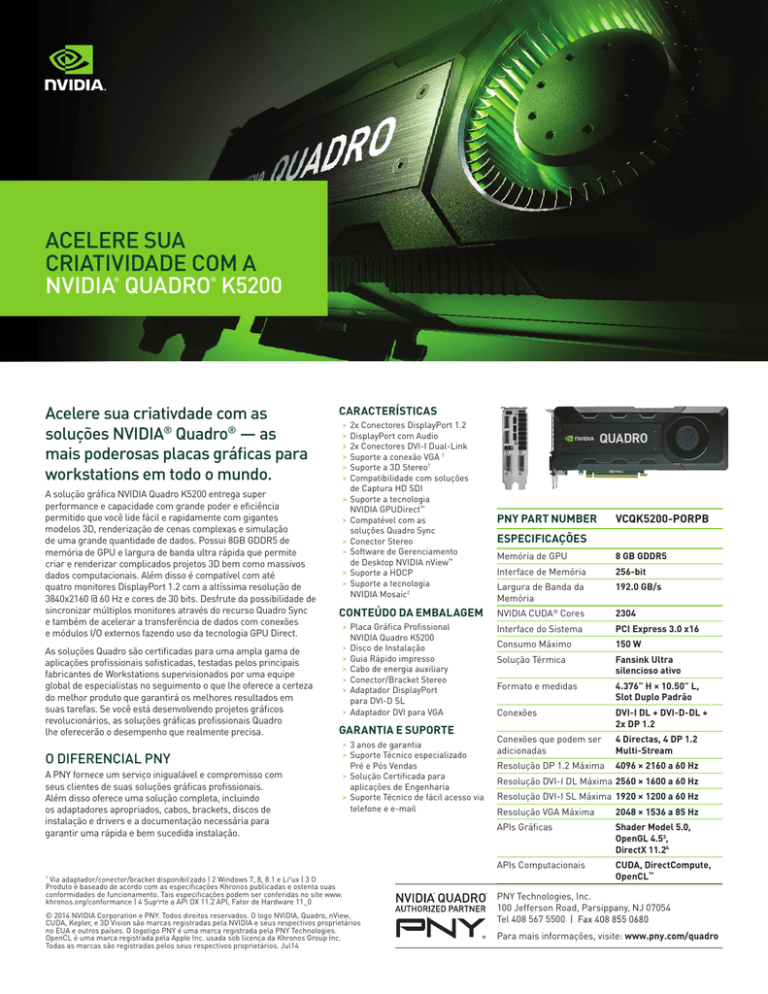 ACELERE SUA CRIATIVIDADE COM A NVIDIA QUADRO K5200 ® ® Acelere sua criativdade com as soluções NVIDIA® Quadro® — as mais poderosas placas gráficas para workstations em todo o mundo. A solução gráfica NVIDIA Quadro K5200 entrega super performance e capacidade com grande poder e eficiência permitido que você lide fácil e rapidamente com gigantes modelos 3D, renderização de cenas complexas e simulação de uma grande quantidade de dados. Possui 8GB GDDR5 de memória de GPU e largura de banda ultra rápida que permite criar e renderizar complicados projetos 3D bem como massivos dados computacionais. Além disso é compatível com até quatro monitores DisplayPort 1.2 com a altíssima resolução de 3840x2160 @ 60 Hz e cores de 30 bits. Desfrute da possibilidade de sincronizar múltiplos monitores através do recurso Quadro Sync e também de acelerar a transferência de dados com conexões e módulos I/O externos fazendo uso da tecnologia GPU Direct. As soluções Quadro são certificadas para uma ampla gama de aplicações profissionais sofisticadas, testadas pelos principais fabricantes de Workstations supervisionados por uma equipe global de especialistas no seguimento o que lhe oferece a certeza do melhor produto que garantirá os melhores resultados em suas tarefas. Se você está desenvolvendo projetos gráficos revolucionários, as soluções gráficas profissionais Quadro lhe oferecerão o desempenho que realmente precisa. O DIFERENCIAL PNY A PNY fornece um serviço inigualável e compromisso com seus clientes de suas soluções gráficas profissionais. Além disso oferece uma solução completa, incluindo os adaptadores apropriados, cabos, brackets, discos de instalação e drivers e a documentação necessária para garantir uma rápida e bem sucedida instalação. CARACTERÍSTICAS > > > > > > > > > > > > 2x Conectores DisplayPort 1.2 DisplayPort com Audio 2x Conectores DVI-I Dual-Link Suporte a conexão VGA 1 Suporte a 3D Stereo1 Compatibilidade com soluções de Captura HD SDI Suporte a tecnologia NVIDIA GPUDirect™ Compatével com as soluções Quadro Sync Conector Stereo Software de Gerenciamento de Desktop NVIDIA nView™ Suporte a HDCP Suporte a tecnologia NVIDIA Mosaic2 CONTEÚDO DA EMBALAGEM PNY PART NUMBER VCQK5200-PORPB ESPECIFICAÇÕES Memória de GPU 8 GB GDDR5 Interface de Memória 256-bit Largura de Banda da Memória 192.0 GB/s NVIDIA CUDA® Cores 2304 > Placa Gráfica Profissional Interface do Sistema PCI Express 3.0 x16 > > > > > Consumo Máximo 150 W Solução Térmica Fansink Ultra silencioso ativo Formato e medidas 4.376” H × 10.50” L, Slot Duplo Padrão Conexões DVI-I DL + DVI-D-DL + 2x DP 1.2 Conexões que podem ser adicionadas 4 Directas, 4 DP 1.2 Multi-Stream Resolução DP 1.2 Máxima 4096 × 2160 a 60 Hz NVIDIA Quadro K5200 Disco de Instalação Guia Rápido impresso Cabo de energia auxiliary Conector/Bracket Stereo Adaptador DisplayPort para DVI-D SL > Adaptador DVI para VGA GARANTIA E SUPORTE > 3 anos de garantia > Suporte Técnico especializado Pré e Pós Vendas > Solução Certificada para aplicações de Engenharia > Suporte Técnico de fácil acesso via telefone e e-mail Via adaptador/conector/bracket disponibilizado | 2 Windows 7, 8, 8.1 e Linux | 3 O Produto é baseado de acordo com as especificações Khronos publicadas e ostenta suas conformidades de funcionamento. Tais especificações podem ser conferidas no site www. khronos.org/conformance | 4 Suporte a API DX 11.2 API, Fator de Hardware 11_0 1 © 2014 NVIDIA Corporation e PNY. Todos direitos reservados. O logo NVIDIA, Quadro, nView, CUDA, Kepler, e 3D Vision são marcas registradas pela NVIDIA e seus respectivos proprietários no EUA e outros países. O logotigo PNY é uma marca registrada pela PNY Technologies. OpenCL é uma marca registrada pela Apple Inc. usada sob licença da Khronos Group Inc. Todas as marcas são registradas pelos seus respectivos proprietários. Jul14 Resolução DVI-I DL Máxima 2560 × 1600 a 60 Hz Resolução DVI-I SL Máxima 1920 × 1200 a 60 Hz Resolução VGA Máxima 2048 × 1536 a 85 Hz APIs Gráficas Shader Model 5.0, OpenGL 4.53, DirectX 11.24 APIs Computacionais CUDA, DirectCompute, OpenCL™ PNY Technologies, Inc. 100 Jefferson Road, Parsippany, NJ 07054 Tel 408 567 5500 | Para mais informações, visite: www.pny.com/quadro