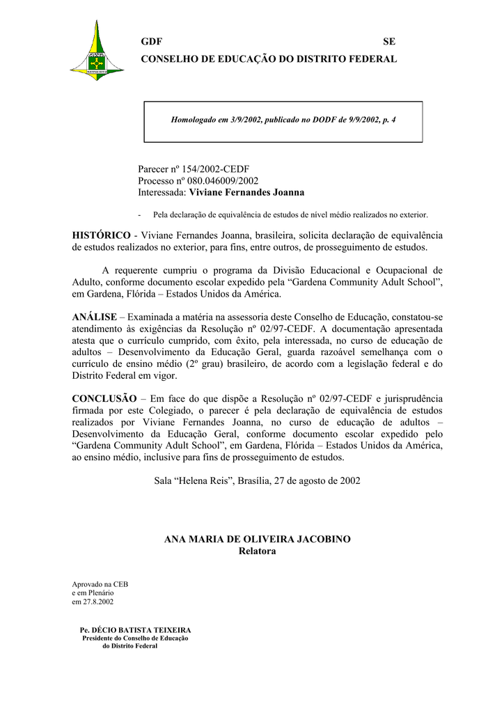 GDF SE CONSELHO DE EDUCAÇÃO DO DISTRITO FEDERAL Homologado em 3/9/2002, publicado no DODF de 9/9/2002, p. 4 Parecer nº 154/2002-CEDF Processo nº 080.046009/2002 Interessada: Viviane Fernandes Joanna - Pela declaração de equivalência de estudos de nível médio realizados no exterior. HISTÓRICO - Viviane Fernandes Joanna, brasileira, solicita declaração de equivalência de estudos realizados no exterior, para fins, entre outros, de prosseguimento de estudos. A requerente cumpriu o programa da Divisão Educacional e Ocupacional de Adulto, conforme documento escolar expedido pela “Gardena Community Adult School”, em Gardena, Flórida – Estados Unidos da América. ANÁLISE – Examinada a matéria na assessoria deste Conselho de Educação, constatou-se atendimento às exigências da Resolução nº 02/97-CEDF. A documentação apresentada atesta que o currículo cumprido, com êxito, pela interessada, no curso de educação de adultos – Desenvolvimento da Educação Geral, guarda razoável semelhança com o currículo de ensino médio (2º grau) brasileiro, de acordo com a legislação federal e do Distrito Federal em vigor. CONCLUSÃO – Em face do que dispõe a Resolução nº 02/97-CEDF e jurisprudência firmada por este Colegiado, o parecer é pela declaração de equivalência de estudos realizados por Viviane Fernandes Joanna, no curso de educação de adultos – Desenvolvimento da Educação Geral, conforme documento escolar expedido pelo “Gardena Community Adult School”, em Gardena, Flórida – Estados Unidos da América, ao ensino médio, inclusive para fins de prosseguimento de estudos. Sala “Helena Reis”, Brasília, 27 de agosto de 2002 ANA MARIA DE OLIVEIRA JACOBINO Relatora Aprovado na CEB e em Plenário em 27.8.2002 Pe. DÉCIO BATISTA TEIXEIRA Presidente do Conselho de Educação do Distrito Federal