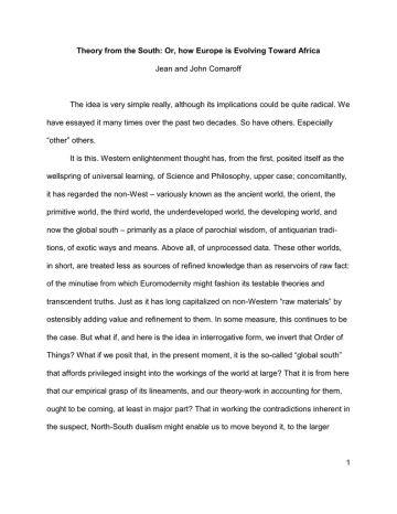 Theory from the South: Or, how Europe is Evolving Toward Africa Jean and John Comaroff The idea is very simple really, although its implications could be quite radical. We have essayed it many times over the past two decades. So have others. Especially “other” others. It is this. Western enlightenment thought has, from the first, posited itself as the wellspring of universal learning, of Science and Philosophy, upper case; concomitantly, it has regarded the non-West – variously known as the ancient world, the orient, the primitive world, the third world, the underdeveloped world, the developing world, and now the global south – primarily as a place of parochial wisdom, of antiquarian traditions, of exotic ways and means. Above all, of unprocessed data. These other worlds, in short, are treated less as sources of refined knowledge than as reservoirs of raw fact: of the minutiae from which Euromodernity might fashion its testable theories and transcendent truths. Just as it has long capitalized on non-Western “raw materials” by ostensibly adding value and refinement to them. In some measure, this continues to be the case. But what if, and here is the idea in interrogative form, we invert that Order of Things? What if we posit that, in the present moment, it is the so-called “global south” that affords privileged insight into the workings of the world at large? That it is from here that our empirical grasp of its lineaments, and our theory-work in accounting for them, ought to be coming, at least in major part? That in working the contradictions inherent in the suspect, North-South dualism might enable us to move beyond it, to the larger 1 dialectic processes of which it is a product. What follows is a reflection on the contemporary Order of Things approached from a primarily African vantage, one which invites us to see familiar things in unfamiliar ways. Euro-American social theory, as writers from the South have observed, has tended to treat modernity as though it were inseparable from the rise of Enlightenment reason. Not only is each taken to be a condition of the other‟s possibility. Together, they are assumed to have animated a distinctively European mission to emancipate humankind from a prehistory of bare necessity, enchantment and entropy. Whether the Enlightenment is seen as an epoch or an “attitude,” as vested in Kantian critique or positivist science, in self-possessed subjectivity or civic democracy, in Arendt‟s “laboring society” or Marx‟s capitalist mode of production, in the free market or liberal humanism – or in various ensembles of these things – the modern has its fons et origo in the West; this notwithstanding the fact in the West itself, the term has always been an object of contestation and ambivalence. Pace Cheikh Anta Diop, the Senegalese polymath for whom civilization arose in Egypt thence to make its way northward, other “modernities” are taken to be either transplants or simulacra, their very mention marked by ironic scare quotes. The accomplishment of anything like the real thing, the Euro-original, is presumed, at best, to be deferred into a distant, almost unimaginable future – to which, as Fanon put it, if the colonized ever do arrive, it is “[t]oo late. Everything is [already] anticipated, thought out, demonstrated, made the most of.” To the degree that, from a Western perspective, the global south is embraced by modernity at all, then, it is as an outside that requires translation, conversion, catch up. 2 Take two diverse instances, both involving north-south representation. One is literary. It is J.M. Coetzee‟s story, “The Novel in Africa,” set on a cruise ship called, not coincidentally, Northern Lights. The narrative hinges on a conversation between a Nigerian writer and Elizabeth Costello, the Australian novelist who serves as Coetzee‟s alter ego. “[H]ow can you explore a world in all its depth,” Costello asks the man, “if at the same time you are having to explain it to outsiders?” To Europeans, that is. From the standpoint of enlightenment, African prose is taken to be a performance of otherness, not an act of “self-writing” (Mbembe 2002). As Žižek (n.d.) observes, the universality presumed by Western liberalism “does not reside in the fact that its values (human rights, etc.) are [treated as ]universal in the sense of holding for ALL cultures, but in a much more radical sense: it lies in the fact that individuals relate to themselves as `universal;‟ it is as if they participate in the universal dimension directly, by-passing any particular social position.” But the African author is foreclosed from writing in the cosmopolitan voice taken for granted by literati in Euro-America. If s/he speaks Out of Africa, it requires “explanation,” conversion into the lexicon of liberal universalism and the humanist episteme on which it is based. My other example comes from the social sciences. For Dipesh Chakrabarty, European historicism allows only one trajectory to non-Western societies if they are to be recognized as part of the grand human story: they must undergo a visible metamorphosis – fast or slow, effective or otherwise – to western capitalist modernity. Their diverse, variously animated life-worlds have to be translated into the “universal and disenchanted language of sociology” whose telos decrees: “First in Europe, then elsewhere” (p.7). Coetzee and Chakrabarty echo a long, slowly rising tide of critique. To be sure, 3 the object of much postcolonial theory has been to disrupt the Western telos of modernity, to trouble the histories it presumes, to “provincialize Europe,” to “renarrate” empire (Makdisi 1992) – all the better, Homi Bhabha (1994a:6) insists, to move the project of theory-making to an “ex-centric site,” thus to capture the restless, re-visionary energy that comes from the vast reaches of the planetary population whose genealogies do not 