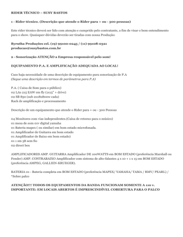 RIDER TÉCNICO – SUSY BASTOS 1 - Rider técnico. (Descrição que atende o Rider para + ou - 300 pessoas) Este ríder técnico deverá ser lido com atenção e cumprido pelo contratante, a fim de visar o bom entendimento para o show. Quaisquer dúvidas deverão ser tiradas com nossa Produção: Byrutha Produções cel. (19) 99100-0245 / (11) 99108-0321 [email protected] 2 - Sonorização ATENÇÃO a Empresa responsável pelo som! EQUIPAMENTO P.A. E AMPLIFICAÇÃO ADEQUADA AO LOCAL! Caso haja necessidade de uma descrição de equipamento para sonorização de P.A (Segue uma descrição em termos de parâmetros para P.A) P.A. ( Caixa de Som para o público) 02 LAs 215 EAW em fly (1x15" + drive) 02 SB 850 (sub 2x18x800w cada) Rack de amplificação e processamento Descrição de um equipamento que atende o Rider para + ou - 300 Pessoas 04 Monitores com vias independentes.(Caixa de retorno para o músico) 01 mesa de som 01v digital yamaha 01 Bateria mapex ( ou similar) em bom estado microfonada. 01 Amplificador de Guitarra em bom estado 01 Amplificador de Baixo em bom estado) 01 1 sm 58 sem fio 02 direct box AMPLIFICADORES AMP. GUITARRA Amplificador DE 100WATTS em BOM ESTADO (preferência Marshall ou Fender) AMP. CONTRABAIXO Amplificador com sistema de alto-falantes 4 x 10 + 1 x 15 em BOM ESTADO (preferência AMPEG, GALLIEN-KRUEGER). BATERIA 01 - Bateria completa em BOM ESTADO (preferência MAPEX/ YAMAHA/ TAMA / RMV/ PEARL) / *Sobre palco ATENÇÃO!!! TODOS OS EQUIPAMENTOS DA BANDA FUNCIONAM SOMENTE A 110 v. IMPORTANTE: EM LOCAIS ABERTOS É IMPRESCINDÍVEL COBERTURA PARA O PALCO O MAPA DE PALCO É OPCIONAL DEPENDENDO DO TAMANHO DO EVENTO! PARA PALCO GRANDE - opção 1 ( Mapa de Palco 1) OPCÃO 1 Mapa de Palco 1 ( Montagem mais completa com sistema Side Way) PARA PALCO PEQUENO E MÉDIO OPÇÃO 2 Mapa de Palco 2 (Montagem mais simples só com monitores, sem Side Way)