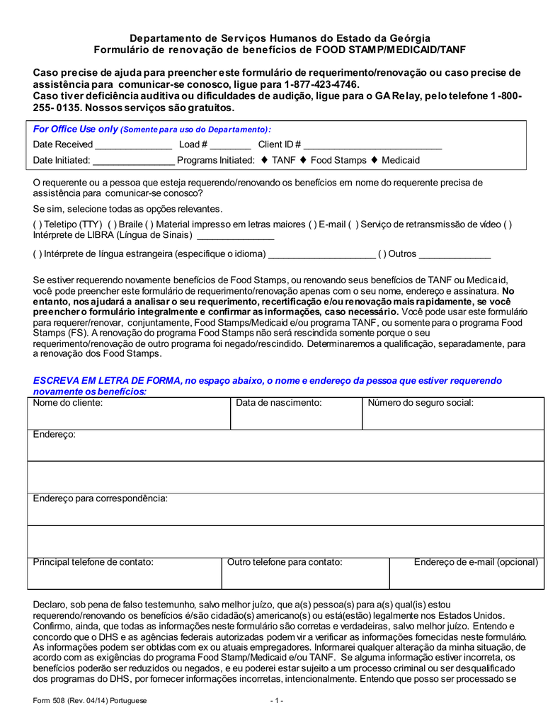 Departamento de Serviços Humanos do Estado da Geórgia Formulário de renovação de benefícios de FOOD STAMP/MEDICAID/TANF Caso precise de ajuda para preencher este formulário de requerimento/renovação ou caso precise de assistência para comunicar-se conosco, ligue para 1-877-423-4746. Caso tiver deficiência auditiva ou dificuldades de audição, ligue para o GA Relay, pelo telefone 1 -800255- 0135. Nossos serviços são gratuitos. For Office Use only (Somente para uso do Departamento): Date Received _______________ Load # ________ Client ID # ___________________________ Date Initiated: ________________ Programs Initiated: TANF Food Stamps Medicaid O requerente ou a pessoa que esteja requerendo/renovando os benefícios em nome do requerente precisa de assistência para comunicar-se conosco? Se sim, selecione todas as opções relevantes. ( ) Teletipo (TTY) ( ) Braile ( ) Material impresso em letras maiores ( ) E-mail ( ) Serviço de retransmissão de vídeo ( ) Intérprete de LIBRA (Língua de Sinais) _______________ ( ) Intérprete de língua estrangeira (especifique o idioma) _____________________ ( ) Outros ______________ Se estiver requerendo novamente benefícios de Food Stamps, ou renovando seus benefícios de TANF ou Medicaid, você pode preencher este formulário de requerimento/renovação apenas com o seu nome, endereço e assinatura. No entanto, nos ajudará a analisar o seu requerimento, recertificação e/ou renovação mais rapidamente, se você preencher o formulário integralmente e confirmar as informações, caso necessário. Você pode usar este formulário para requerer/renovar, conjuntamente, Food Stamps/Medicaid e/ou programa TANF, ou somente para o programa Food Stamps (FS). A renovação do programa Food Stamps não será rescindida somente porque o seu requerimento/renovação de outro programa foi negado/rescindido. Determinaremos a qualificação, separadamente, para a renovação dos Food Stamps. ESCREVA EM LETRA DE FORMA, no espaço abaixo, o nome e endereço da pessoa que estiver requerendo novamente os benefícios: Nome do cliente: Data de nascimento: Número do seguro social: Endereço: Endereço para correspondência: Principal telefone de contato: Outro telefone para contato: Endereço de e-mail (opcional) Declaro, sob pena de falso testemunho, salvo melhor juízo, que a(s) pessoa(s) para a(s) qual(is) estou requerendo/renovando os benefícios é/são cidadão(s) americano(s) ou está(estão) legalmente nos Estados Unidos. Confirmo, ainda, que todas as informações neste formulário são corretas e verdadeiras, salvo melhor juízo. Entendo e concordo que o DHS e as agências federais autorizadas podem vir a verificar as informações fornecidas neste formulário. As informações podem ser obtidas com ex ou atuais empregadores. Informarei qualquer alteração da minha situação, de acordo com as exigências do programa Food Stamp/Medicaid e/ou TANF. Se alguma informação estiver incorreta, os benefícios poderão ser reduzidos ou negados, e eu poderei estar sujeito a um processo criminal ou ser desqualificado dos programas do DHS, por fornecer informações incorretas, intencionalmente. Entendo que posso ser processado se Form 508 (Rev. 04/14) Portuguese -1- fornecer informações falsas ou se omitir informações. Entendo que, se eu deixar de informar o DHS sobre alguma despesa no requerimento ou renovação, tal despesa não será incluída no cálculo do valor do meu benefício de food stamps. Assinatura Data Assinatura da testemunha, se assinado por ‘X’ Data Representante autorizado: Somente preencha esta seção se você desejar que alguém preencha seu formulário de requerimento/renovação, compareça à entrevista para a obtenção de Food Stamps ou TANF, e/ou use seu cartão de EBT Food Stamps para comprar alimentos, nos casos em que você não puder ir ao supermercado. Se estiver requerendo o Medicaid, você pode escolher mais de uma pessoa para requerer a assistência médica em seu nome. Nome: __________________________________________ Telefone: ________________________________ Endereço: __________________________________________ Apto.: Cidade: __________________________________________ Estado: ________ Código postal: _____________ Nome: __________________________________________ Telefone: ________________________________ Endereço: __________________________________________ Apto.: Cidade ________________________________________ Estado: ________ Código postal: _______________ _________________________________ _________________________________ Para o Medicaid, você deseja que esse indivíduo tenha uma cópia do seu cartão de Medicaid? Sim Não SOMENTE PARA O MEDICAID Você espera declarar imposto de renda federal no PRÓXIMO ANO? (Você ainda pode requerer assistência médica, ainda que não declare imposto de renda federal.) SIM Se sim, responda as perguntas a, b, e c NÃO Se não, responda a pergunta c. a. Você fará declaração conjunta com seu cônjuge? Yes Se sim, nome do cônjuge: _______________________ b. Você declarará dependentes no imposto de renda? Sim Não Se sim, liste o(s) nome(s) do(s) dependente(s): _________________________________________________________ c. Você será declarado como dependente no imposto de renda de alguém? Sim Não Se sim, liste o nome da pessoa que declarará: ________________________________ Form 508 (Rev. 04/14) Portuguese -2- Caso precise de ajuda para preencher este formulário de requerimento/renovação ou caso precise de assistência para comunicar-se conosco, ligue para 1-877-423-4746. Caso tiver deficiência auditiva ou dificuldades de audição, ligue para o GA Relay, pelo telefone 1-800-255- 0135. Nossos serviços são gratuitos. SERVIÇOS COMUNITÁRIOS: para obter mais informações sobre outros serviços do DHS, por favor, visite nosso website: www.dfcs.dhr.georgia.gov ou ligue para 1-877-423-4746. Responda a todas as perguntas e apresente comprovantes de toda sua r
