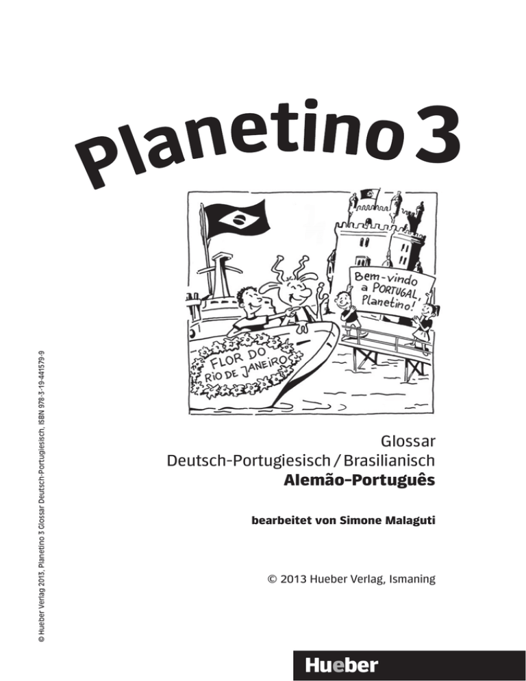 © Hueber Verlag 2013, Planetino 3 Glossar Deutsch-Portugiesisch, ISBN 978-3-19-441579-9 3 Glossar Deutsch-Portugiesisch / Brasilianisch Alemão-Português bearbeitet von Simone Malaguti © 2013 Hueber Verlag, Ismaning Hueber Wortliste Lista de palavras Die chronologische Wortliste enthält die Wörter des Kursbuches mit Angabe der Seiten, auf denen sie zum ersten Mal genannt werden. Nomen mit der Angabe (Sg.) verwendet man nur oder meistens im Singular. Nomen mit der Angabe (Pl.) verwendet man nur oder meistens im Plural. Passiver Wortschatz ist kursiv gedruckt. A lista de palavras é cronológica e contém as palavras do livro de textos com a indicação da página, na qual são citadas pela primeira vez. Os substantivos com a abreviação (Sg.) são usados somente ou muitas vezes no singular. Os substantivos com a abreviação (Pl.) são usados somente ou muitas vezes no plural. O vocabulário passivo é marcado em itálico. © Hueber Verlag 2013, Planetino 3 Glossar Deutsch-Portugiesisch, ISBN 978-3-19-441579-9 As palavras ou expressões seguidas da abreviação (PE) são termos geralmente utilizados no português europeu e estranhas aos falantes brasileiros. A abreviação foi suprimida quando se trata de termo usual no português do Brasil. Themenkreis Freizeit Campo temático Tempo livre, horas vagas Seite 5 auf sein (= offen sein) doch Problem, das, -e Kein Problem. blöd Página 5 estar aberto(a) mas, entretanto, contudo problema Sem problema. bobo, idiota, parvo Lektion 41: Das Preisausschreiben Lição 41: Premiação Seite 6 Preisausschreiben, das, Preis, der, -e abbilden Wort, das, -̈er angeben (= nennen) Buchstabe, der, -n Reihenfolge, die, -n Lösungswort, das, -̈er zu tun haben schicken Postkarte, die, -n Postfach, das, -̈er Heimspiel, das, -e Lieblingsmannschaft, die, -en Página 6 premiação, concurso prêmio copiar palavra nomear letra ordem resposta ter algo a ver com enviar cartão-postal, bilhete-postal CEP, código de endereçamento postal partida de futebol na cidade do time time de futebol preferido 2 © Hueber Verlag 2013, Planetino 3 Glossar Deutsch-Portugiesisch, ISBN 978-3-19-441579-9 Besuch, der, -e Spielerkabine, die, -n weitere Autogramm, das, -e Spielertrikot, das, -s über Bundesliga, die (Sg.) Wohin? Spielplatz, der, -̈e Skatepark, der, -s visita vestiário dos jogadores outros autógrafo camisa do time sobre, a respeito primeira divisão Para onde? parque, parquinho, playground parque ou pistas para andar de skate Seite 7 Schwimmbad, das, -̈er Turnhalle, die, -n Kino, das, -s Ballettschule, die, -n Eiscafé, das, -s Musikschule, die, -n Tennisplatz, der, -̈e Stadion, das, Stadien Reithalle, die, -n Sportplatz, der, -̈e Popkonzert, das, -e Página 7 piscina ginásio de esportes e ginástica cinema escola de balé sorvete cremoso de café escola de música, conservatório musical quadra de tênis estádio saguão de equitação quadra de esporte show Seite 8 auf Was gibt’s? gewinnen zum Training Página 8 no(a) O que foi?, E aí? ganhar para o treino Seite 9 Scheibenspiel, das, -e schneiden Scheibe, die, -n Karton, der, -s Linie, die, -n aufeinanderlegen Loch, das, -̈er Mitte, die (Sg.) durchstecken Briefklammer, die, -n drehen Página 9 jogo dos discos cortar disco papelão linha colocar um sobre o outro buraco, furo meio colocar no furo clipe para prender papel girar Lektion 42: Fußball Lição 42: Futebol Seite 10 glücklich letzter/es/e Reporter, der, beide die beiden Página 10 feliz no(a)s último(a)s repórter ambos os dois, ambos 3 © Hueber Verlag 2013, Planetino 3 Glossar Deutsch-Portugiesisch, ISBN 978-3-19-441579-9 Hotdog, der, -s Hurra! unterschreiben Platz, der, -̈e (= Sitzplatz) genau zum Schluss Interview, das, -s Trikot, das, -s Torwart, der, -e Trainer, der, - cachorro-quente Eba!, Viva! assinar lugar, sítio, cadeira (ver) bem, com nitidez no final entrevista camisa (do time) goleiro técnico (do time) Seite 11 passieren abholen bezahlen nachher Página 11 acontecer pegar pagar depois Lektion 43: Meine Hobbys Lição 43: Meus passatempos favoritos Seite 12 Anzeige, die, -n Eis, das (Sg.) (hier: gefrorenes Wasser) Eishockey, das (Sg.) Eiszeit, die, -en ob Anmeldung, die, -en Jugendleitung, die (Sg.) Eissportverein, der, -e Computerklub, der, -s Kurs, der, -e täglich multimedial Welt, die (Sg.) Internet, das (Sg.) Spielprogramm, das, -e Lernprogramm, das, -e testen Webseite, die, -n gestalten erproben Klavier, das, -e Klavierunterricht, der (Sg.) kostenlos Probestunde, die, -n Schachakademie, die, -n Schach, das (Sg.) schlau Ferien, die (Pl.) Info, die, -s Radio, das, -s sammeln Página 12 anúncio gelo hóquei no gelo época do gelo, estação do gelo se registro, matrícula diretoria clube de esportes de inverno clube de computador curso diariamente multimedial mundo internet jogo programa educativo testar página da internet, site, sítio (PE) da internet diagramar testar piano aula de piano gratuitamente aula-teste academia de xadrez xadrez esperto, inteligente férias informação rádio colecionar 4 © Hueber Verlag 2013, Planetino 3 Glossar Deutsch-Portugiesisch, ISBN 978-3-19-441579-9 deutsch Briefmarke, die, -n tauschen Kultursommer, der (Sg.) Angebot, das, -e Jugendliche, der/die, -n Umgebung, die (Sg.) Wiese, die, -n Zirkuszeltstadt, die, -̈e Kultur, die (Sg.) zuschauen zahlreich Auftritt, der, -e Workshop, der, -s Musical, das, -s Graffiti, das, -s Batik, die, -en Papierwerkstatt, die, -̈en Holzschnitzwerkstatt, die, -̈en Steinbildhauerei, die (Sg.) vieles mehr alemão selo trocar verão cultural oferta adolescência redondeza gramado barraca de circo, acampamento do circo cultura olhar muitos, variados apresentação (artística) seminário musical grafite batique (= técnica artística para tingir) oficina de papéis oficina de escultura ou gravura em madeira oficina de escultura em pedra muito mais Seite 13 probieren alles Mögliche und so weiter (usw.) vielleicht Kinderprogramm, das, -e fotografieren im I
