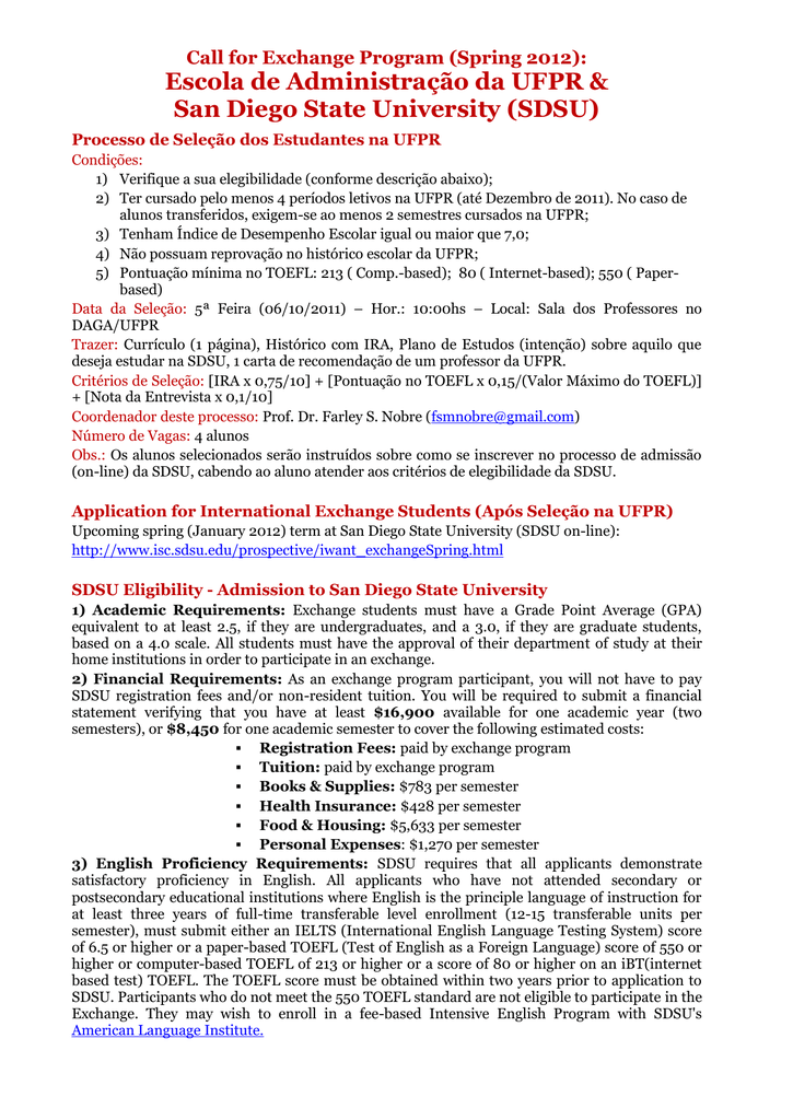 Call for Exchange Program (Spring 2012): Escola de Administração da UFPR & San Diego State University (SDSU) Processo de Seleção dos Estudantes na UFPR Condições: 1) Verifique a sua elegibilidade (conforme descrição abaixo); 2) Ter cursado pelo menos 4 períodos letivos na UFPR (até Dezembro de 2011). No caso de alunos transferidos, exigem-se ao menos 2 semestres cursados na UFPR; 3) Tenham Índice de Desempenho Escolar igual ou maior que 7,0; 4) Não possuam reprovação no histórico escolar da UFPR; 5) Pontuação mínima no TOEFL: 213 ( Comp.-based); 80 ( Internet-based); 550 ( Paperbased) Data da Seleção: 5ª Feira (06/10/2011) – Hor.: 10:00hs – Local: Sala dos Professores no DAGA/UFPR Trazer: Currículo (1 página), Histórico com IRA, Plano de Estudos (intenção) sobre aquilo que deseja estudar na SDSU, 1 carta de recomendação de um professor da UFPR. Critérios de Seleção: [IRA x 0,75/10] + [Pontuação no TOEFL x 0,15/(Valor Máximo do TOEFL)] + [Nota da Entrevista x 0,1/10] Coordenador deste processo: Prof. Dr. Farley S. Nobre ([email protected]) Número de Vagas: 4 alunos Obs.: Os alunos selecionados serão instruídos sobre como se inscrever no processo de admissão (on-line) da SDSU, cabendo ao aluno atender aos critérios de elegibilidade da SDSU. Application for International Exchange Students (Após Seleção na UFPR) Upcoming spring (January 2012) term at San Diego State University (SDSU on-line): http://www.isc.sdsu.edu/prospective/iwant_exchangeSpring.html SDSU Eligibility - Admission to San Diego State University 1) Academic Requirements: Exchange students must have a Grade Point Average (GPA) equivalent to at least 2.5, if they are undergraduates, and a 3.0, if they are graduate students, based on a 4.0 scale. All students must have the approval of their department of study at their home institutions in order to participate in an exchange. 2) Financial Requirements: As an exchange program participant, you will not have to pay SDSU registration fees and/or non-resident tuition. You will be required to submit a financial statement verifying that you have at least $16,900 available for one academic year (two semesters), or $8,450 for one academic semester to cover the following estimated costs: Registration Fees: paid by exchange program Tuition: paid by exchange program Books & Supplies: $783 per semester Health Insurance: $428 per semester Food & Housing: $5,633 per semester Personal Expenses: $1,270 per semester 3) English Proficiency Requirements: SDSU requires that all applicants demonstrate satisfactory proficiency in English. All applicants who have not attended secondary or postsecondary educational institutions where English is the principle language of instruction for at least three years of full-time transferable level enrollment (12-15 transferable units per semester), must submit either an IELTS (International English Language Testing System) score of 6.5 or higher or a paper-based TOEFL (Test of English as a Foreign Language) score of 550 or higher or computer-based TOEFL of 213 or higher or a score of 80 or higher on an iBT(internet based test) TOEFL. The TOEFL score must be obtained within two years prior to application to SDSU. Participants who do not meet the 550 TOEFL standard are not eligible to participate in the Exchange. They may wish to enroll in a fee-based Intensive English Program with SDSU's American Language Institute.
