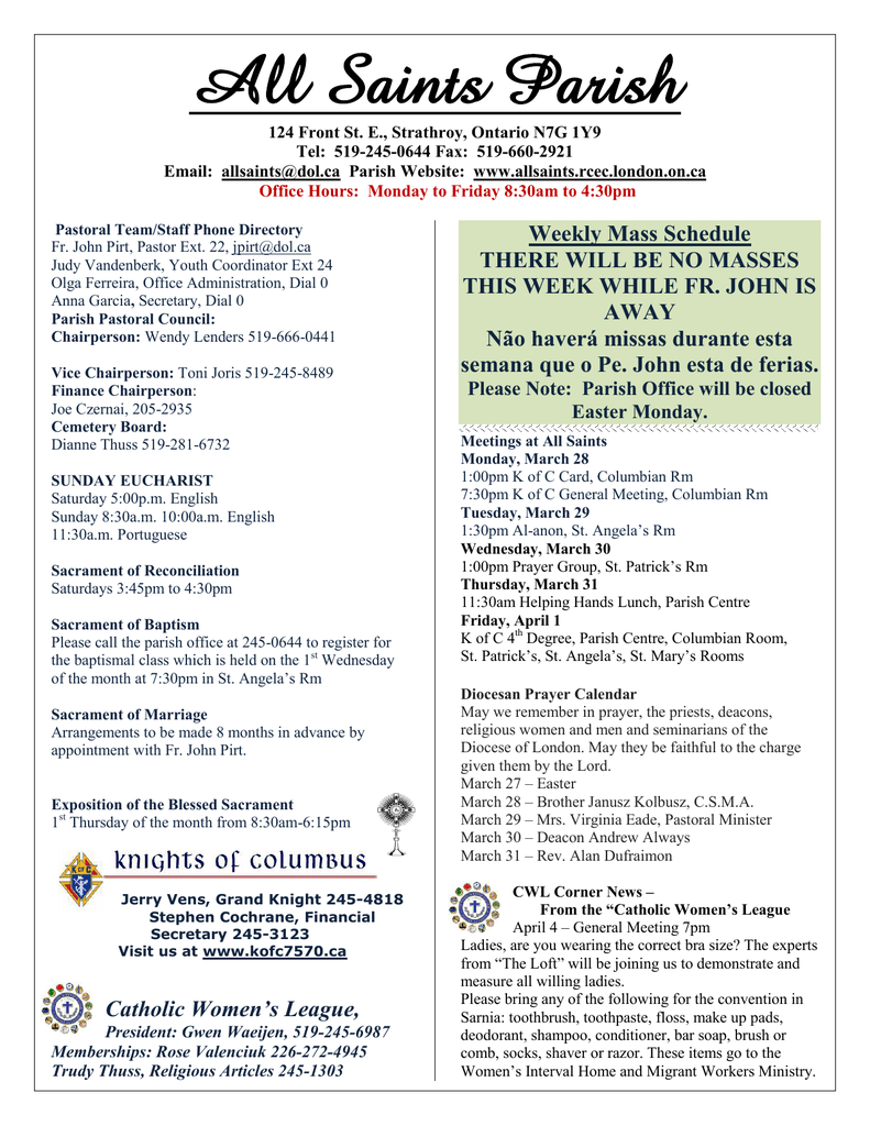 All Saints Parish 124 Front St. E., Strathroy, Ontario N7G 1Y9 Tel: 519-245-0644 Fax: 519-660-2921 Email: [email protected] Parish Website: www.allsaints.rcec.london.on.ca Office Hours: Monday to Friday 8:30am to 4:30pm Pastoral Team/Staff Phone Directory Fr. John Pirt, Pastor Ext. 22, [email protected] Judy Vandenberk, Youth Coordinator Ext 24 Olga Ferreira, Office Administration, Dial 0 Anna Garcia, Secretary, Dial 0 Parish Pastoral Council: Chairperson: Wendy Lenders 519-666-0441 Vice Chairperson: Toni Joris 519-245-8489 Finance Chairperson: Joe Czernai, 205-2935 Cemetery Board: Dianne Thuss 519-281-6732 SUNDAY EUCHARIST Saturday 5:00p.m. English Sunday 8:30a.m. 10:00a.m. English 11:30a.m. Portuguese Sacrament of Reconciliation Saturdays 3:45pm to 4:30pm Sacrament of Baptism Please call the parish office at 245-0644 to register for the baptismal class which is held on the 1st Wednesday of the month at 7:30pm in St. Angela’s Rm Sacrament of Marriage Arrangements to be made 8 months in advance by appointment with Fr. John Pirt. Exposition of the Blessed Sacrament 1st Thursday of the month from 8:30am-6:15pm Jerry Vens, Grand Knight 245-4818 Stephen Cochrane, Financial Secretary 245-3123 Visit us at www.kofc7570.ca Catholic Women’s League, President: Gwen Waeijen, 519-245-6987 Memberships: Rose Valenciuk 226-272-4945 Trudy Thuss, Religious Articles 245-1303 Weekly Mass Schedule THERE WILL BE NO MASSES THIS WEEK WHILE FR. JOHN IS AWAY Não haverá missas durante esta semana que o Pe. John esta de ferias. Please Note: Parish Office will be closed Easter Monday. Meetings at All Saints Monday, March 28 1:00pm K of C Card, Columbian Rm 7:30pm K of C General Meeting, Columbian Rm Tuesday, March 29 1:30pm Al-anon, St. Angela’s Rm Wednesday, March 30 1:00pm Prayer Group, St. Patrick’s Rm Thursday, March 31 11:30am Helping Hands Lunch, Parish Centre Friday, April 1 K of C 4th Degree, Parish Centre, Columbian Room, St. Patrick’s, St. Angela’s, St. Mary’s Rooms Diocesan Prayer Calendar May we remember in prayer, the priests, deacons, religious women and men and seminarians of the Diocese of London. May they be faithful to the charge given them by the Lord. March 27 – Easter March 28 – Brother Janusz Kolbusz, C.S.M.A. March 29 – Mrs. Virginia Eade, Pastoral Minister March 30 – Deacon Andrew Always March 31 – Rev. Alan Dufraimon CWL Corner News – From the “Catholic Women’s League April 4 – General Meeting 7pm Ladies, are you wearing the correct bra size? The experts from “The Loft” will be joining us to demonstrate and measure all willing ladies. Please bring any of the following for the convention in Sarnia: toothbrush, toothpaste, floss, make up pads, deodorant, shampoo, conditioner, bar soap, brush or comb, socks, shaver or razor. These items go to the Women’s Interval Home and Migrant Workers Ministry. 93 DATE (do not change anything here, we’ll put a correct header each week) Wedding Anniversary Mass The Wedding Anniversary Mass honoring all married couples in southwestern Ontario will be held Sunday, May 1, 2016 at 2:30 pm, at Visitation Parish in Comber, Ontario. Bishop Fabbro will preside at the Mass. All married couples are invited to attend. Please call the parish office or use the sign up forms in the back of Church to register. Please have your registration forms back to the parish office by April 25, 2016. Missa do Aniversário de Casamento 2016 A Missa do Aniversário de Casamento para honrar todos os casais em Ontário do sudoeste será realizada Domingo, 1 de Maio, 2016 às 2:30 da tarde, na Paróquia Visitation em Comber, Ontario. Bishop Fabbro presidirá a missa. Todos os casais são convidados a participar. Por favor, ligue para o escritório da Igreja ou usam o folheto para se registar de que está na tapa vente. Por favor, trazem de volta para o escritório da paróquia o seu folheto de registro antes do dia 25 de Abril de 2016. New Evangelization Summit 2016: Live Streaming in St. Thomas, Amherstburg, and Sarnia St. Anne’s Centre, St. Thomas (20 Morrison Dr.), St. John the Baptist, Amherstburg (225 Brock St.), and Our Lady of Mercy Parish Hall, Sarnia (390 Christina St. N.) will be host sites for the upcoming broadcast of the New Evangelization Summit 2016 (NES2016). The Summit will take place Friday, April 15 from 7 - 9:30 pm and Saturday, April 16 from 8:45 am - 4:30 pm. To order tickets, or view a promotional video, visit www.newevangelization.ca. St. Anne’s Centre, St. Thomas: Tickets are $60.00 and lunch is provided on Saturday. For questions contact Pat at [email protected] or call the parish office at 519 631-3052. Click here for an event poster. St. John the Baptist, Amherstburg: Tickets are $30.00 and lunch is not provided on Saturday. For questions, contact [email protected] or 519-736-5418. Our Lady of Mercy Parish Hall, Sarnia: Tickets are $40.00 and lunch will be provided on Saturday. For questions, contact [email protected] or 519-336-2653 x16. Foundations in Parish Nursing Program Are you a registered nurse who would like to integrate your spirituality with your nursing practice and also learn more about the exciting field of parish nursing? Join us from July 8 – 14 at Holy Family Retreat House, Oxley (121 Victoria St., Harrow). For more information visit www.stpetersseminary.ca or contact Catherine Leach at 519-432-1824 x281. For a program poster to post in your parish, click here. Dear Parishioners The first glorious mystery of the Rosary is a joy to recite. One thinks of the joy and exultation that the disciples felt as they realized that Jesus was truly risen indeed. This is what we celebrate today! The resurrection of Jesus changed everything for the disciples. With the resurrection, the words and actions of Jesus began to make sense. The disciples grew in faith and, inspired by the gift of the Holy Spirit, began their public ministry, carrying on the work and mission of Jesus. That is exactly what Easter should b