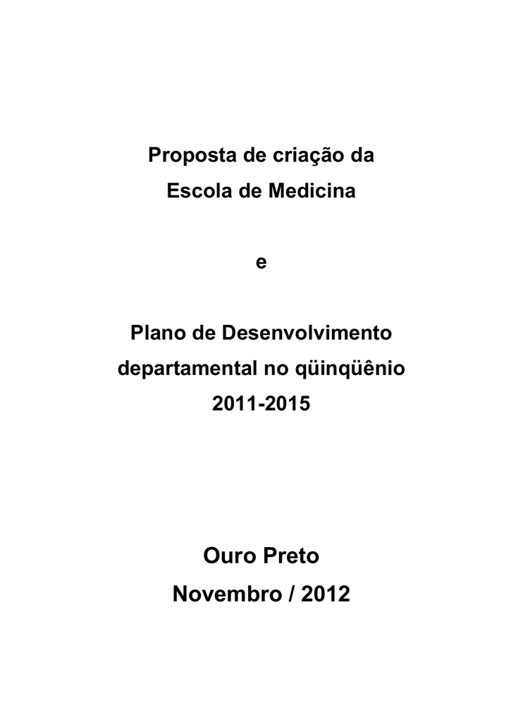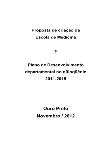 Proposta de criação da Escola de Medicina e Plano de Desenvolvimento departamental no qüinqüênio 2011-2015 Ouro Preto Novembro / 2012 Sumário I. Princípios norteadores da presente proposta.......................................................................................4 II. Adequação do DECME à Legislação Vigente .........................................................................................4 III. A Escola de Medicina.........................................................................................................................5 IV. Eixos norteadores ..............................................................................................................................7 V. Apresentação.........................................................................................................................................9 1. Quadro Pessoal..................................................................................................................................9 2. Área Física....................................................................................................................................... 11 3. Área física utilizada em outros setores da UFOP ........................................................................... 12 4. Área física utilizada na rede pública de saúde do SUS ................................................................... 13 5. Disciplinas de graduação oferecidas pelo DECME ......................................................................... 13 6. Convênios com Instituições de Saúde ............................................................................................ 13 7. Ações de formação continuada ...................................................................................................... 14 a) Programa de educação permanente (PEP) – UFOP / Secretaria de Estado da Saúde de Minas Gerais.................................................................................................................................................. 14 b) Programa Nacional de Reorientação da Formação Profissional em Saúde (Pró-Saúde) e Programa de Educação pelo Trabalho para a Saúde - PET-Saúde, firmado entre a UFOP e SMS de Mariana e SMS de Ouro Preto............................................................................................................ 14 8. VI. Atividades de extensão e pesquisa ................................................................................................ 16 a) Atividades de Ensino e de Extensão: .......................................................................................... 16 b) Atividades de Pesquisa: .............................................................................................................. 17 Plano de metas globais do Departamento de Ciências Médicas ................................................... 20 1. No quadriênio 2007-2010 as seguintes metas foram alcançadas:................................................. 20 2. Metas de curto prazo (2011-2012): ............................................................................................... 21 3. Metas de médio prazo (2013-2014): .............................................................................................. 22 4. Metas de longo prazo (2014-2015): ............................................................................................... 22 VII. Anexos: ........................................................................................................................................... 24 Anexo I: Relatório da avaliação do curso de medicina elaborado pela comissão do MEC – Novembro de 2011 ................................................................................................................................................... 25 2 Anexo II: Organograma da Escola de Medicina da UFOP ....................................................................... 26 Anexo III: Organograma do Departamento de Ciências Médicas da Escola de Farmácia da UFOP ....... 27 Anexo IV: Relação dos professores, regime de trabalho, vínculo, formação acadêmica e titulação. ... 28 Anexo V: Descrição das atividades e inserção dos professores e técnico administrativos (*) nas áreas de pesquisa e extensão dentro e fora da UFOP ..................................................................................... 29 Anexo VI: Relação dos técnico-administrativos, vínculo com a UFOP, formação acadêmica e titulação ................................................................................................................................................................ 31 Anexo VII: Salas de aula.......................................................................................................................... 32 Anexo VIII: Distribuição das disciplinas nos consultórios do centro de saúde da UFOP, com capacidade para três estudantes por sala. ................................................................................................................ 37 Anexo IX: Distribuição das disciplinas na rede pública de saúde municipal .......................................... 38 Anexo X: Relação dos hospitais conveniados para realização dos internatos hospitalares. ................. 38 Anexo XI: Municípios para estabelecimento de convênios para oferecimento do internato de saúde coletiva. .................................................................................................................................................. 39 Anexo XII: Relação das disciplinas obrigatórias e eletivas oferecidas pelo DECME na matriz curricular do curso de medicina (2012/2) .............................................................................................................. 40 Anexo XIII: Carga horária dos professores do departamento de Ciências Médicas e respect