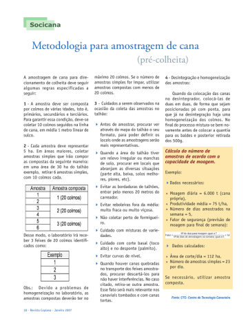 Socicana Metodologia para amostragem de cana (pré-colheita) A amostragem de cana para direcionamento de colheita deve seguir algumas regras especificadas a seguir: máximo 20 colmos. Se o número de amostras simples for ímpar, utilizar amostras compostas com menos de 20 colmos. 1 -A amostra deve ser composta por colmos de várias idades, isto é, primários, secundários e terciários. Para garantir essa condição, deve-se coletar 10 colmos seguidos na linha de cana, em média 1 metro linear de sulco. 3 -Cuidados a serem observados na ocasião da coleta das amostras no talhão: 2 -Cada amostra deve representar 5 ha. Em áreas maiores, coletar amostras simples que irão compor as compostas da seguinte maneira: em uma área de 30 ha do talhão exemplo, retirar 6 amostras simples, com 10 colmos cada. Antes de amostrar, procurar ver através do mapa do talhão o seu formato, para poder definir os locais onde as amostragens serão mais representativas. Quando a área do talhão tiver um relevo irregular ou manchas de solo, procurar em locais que abranjam as diversas situações (parte alta, baixa, solos melhores, piores, etc). Evitar as bordaduras de talhões, entrar pelo menos 20 metros do carreador. Evitar reboleiras fora da média: muito fraca ou muito viçosa. Não coletar perto de formigueiro. Desse modo, o laboratório irá receber 3 feixes de 20 colmos identificados como: Obs.: Devido a problemas de homogeneização no laboratório, as amostras compostas deverão ter no 18 - Revista Coplana - Janeiro 2007 4 - Desintegração e homogeneização das amostras: Quando da colocação das canas no desintegrador, colocá-las de duas em duas, de forma que sejam posicionadas pé com ponta, para que já na desintegração haja uma homogeneização dos colmos. No final do processo mistura-se bem novamente antes de colocar a quantia para os baldes e posterior retirada dos 500g. Cálculo do número de amostras de acordo com a capacidade de moagem. Exemplo: Dados necessários: Moagem diária = 6.000 t (cana própria), Produtividade média = 75 t/ha, Número de dias amostrados na semana = 5, Fator de segurança (previsão de moagem para final de semana): Cuidado com misturas de variedades. Cuidado com corte basal (toco alto) e no desponte (palmito). Dados calculados: Evitar curvas de nível. Área Quando houver canas quebradas no transporte dos feixes amostrados, procurar descartá-los para não haver interferências. No caso citado, retira-se outra amostra. Esse fato será mais relevante nos canaviais tombados e com canas tortas. de corte/dia = 112 ha, de amostras simples = 23 por dia. Número Se necessário, utilizar amostra composta. Fonte: CTC- Centro de Tecnologia Canavieira