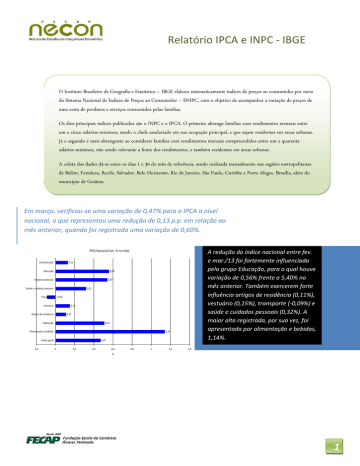 Relatório IPCA e INPC - IBGE O Instituto Brasileiro de Geografia e Estatística – IBGE elabora sistematicamente índices de preços ao consumidor por meio do Sistema Nacional de Índices de Preços ao Consumidor – SNIPC, com o objetivo de acompanhar a variação de preços de uma cesta de produtos e serviços consumidos pelas famílias. Os dois principais índices publicados são o INPC e o IPCA. O primeiro abrange famílias com rendimentos mensais entre um e cinco salários-mínimos, sendo o chefe assalariado em sua ocupação principal, e que sejam residentes em áreas urbanas. Já o segundo é mais abrangente ao considerar famílias com rendimentos mensais compreendidos entre um e quarenta salários-mínimos, não sendo relevante a fonte dos rendimentos, e também residentes em áreas urbanas. A coleta dos dados dá-se entre os dias 1 e 30 do mês de referência, sendo realizada mensalmente nas regiões metropolitanas de Belém, Fortaleza, Recife, Salvador, Belo Horizonte, Rio de Janeiro, São Paulo, Curitiba e Porto Alegre, Brasília, além do município de Goiânia. Em março, verificou-se uma variação de 0,47% para o IPCA a nível nacional, o que representou uma redução de 0,13 p.p. em relação ao mês anterior, quando foi registrada uma variação de 0,60%. IPCA Nacional (var. % no mês) Comunicação 0,13 Educação 0,56 Despesas pessoais 0,54 Saúde e cuidados pessoais 0,32 Transportes -0,09 Vestuário 0,15 Artigos de residência 0,11 Habitação 0,51 Alimentação e bebidas 1,14 Índice geral -0,2 A redução do índice nacional entre fev. e mar./13 foi fortemente influenciada pelo grupo Educação, para o qual houve variação de 0,56% frente a 5,40% no mês anterior. Também exercerem forte influência artigos de residência (0,11%), vestuário (0,15%), transporte (-0,09%) e saúde e cuidados pessoais (0,32%). A maior alta registrada, por sua vez, foi apresentada por alimentação e bebidas, 1,14%. 0,47 0 0,2 0,4 0,6 0,8 1 1,2 1,4 % 1 Relatório IPCA e INPC - IBGE IPCA Nacional (var. % em 12 meses) 1,00 0,90 0,86 0,80 0,79 Entretanto, o índice acumulado em 12 meses apresentou elevação, passando de 6,31% em fevereiro para 6,59%, em março. 0,70 0,64 0,60 0,59 0,60 0,60 % 0,50 0,47 0,57 0,43 0,40 0,41 0,36 0,30 0,20 0,10 0,08 0,00 abr/12 mai/12 jun/12 jul/12 ago/12 set/12 out/12 nov/12 dez/12 jan/13 fev/13 mar/13 IPCA - Alimentação e Bebidas (var. % no mês) 0,79 Doces Outras bebidas alcoólicas -0,16 Cerveja 0,57 Cafezinho -0,22 Refrigerante e água mineral 1,4 0,61 Café da manhã 0,25 Lanche Refeição 0,89 Sal e condimentos 2,35 Enlatados e conservas 1,59 0,86 Bebidas e infusões Óleos e gorduras -0,62 Panificados 1,4 Leites e derivados 1,34 1,42 Aves e ovos 0,75 Carnes e peixes industrializados Pescados 1,78 Carnes -1,63 Frutas 2,46 Hortaliças e verduras Açúcares e derivados -0,94 Tubérculos, raízes e legumes Farinhas, féculas e massas 3,04 Cereais, leguminosas e oleaginosas 1,86 Dentro do grupo alimentação e bebidas, que apresentou a maior variação mensal (1,14%), destacaram-se os tubérculos, raízes e legumes, cuja variação mensal foi de 8,97%. Destacaram-se também as elevações apresentadas pelas fruta (4,51%) e farinhas, féculas e massas (3,04%) e retração pelas carnes (-1,63%). -4 -2 0 2 4,51 8,97 4 6 8 % O INPC, por sua vez, apresentou comportamento contrário ao IPCA, tendo registrado uma variação de 0,60% em março, frente a 0,52% em fevereiro, aumento de 0,08p.p. No acumulado em 12 meses, passou de 6,77% para 7,22%. INPC Nacional (var. % no mês) Comunicação -0,01 Educação A maior elevação foi apresentada pelo grupo alimentação e bebidas (1,16%). Também apresentou expressiva elevação no grupo Educação (0,82%). 0,82 Despesas pessoais 0,59 Saúde e cuidados pessoais 0,32 Transportes 0,29 Vestuário 0,17 Artigos de residência 0,13 Habitação 0,54 Alimentação e bebidas 1,16 Índice geral -0,2 0,6 0 0,2 0,4 0,6 0,8 1 1,2 1,4 % 2 Relatório IPCA e INPC - IBGE O IPCA – São Paulo no mês de março apresentou alta de 0,48% com relação a fevereiro, que havia apresentado, por sua vez, alta de 0,66%, queda de 0,18p.p. O INPC – São Paulo registrou alta de 0,45%, ante a 0,46% no mês anterior, recuo de 0,1p.p. Análise de Grupos - São Paulo Alimentação e Bebidas 0,85 0,41 -0,7 Artigos de residência 0,19 Transportes 0,34 0,45 Despesas Pessoais 0,89 0,47 Comunicação -1 -0,5 Os grupos que apresentaram maior alta foram Alimentação e Bebidas (0,85%) e Despesas Pessoais (0,89%). Vestuário e Comunicação apresentaram as menores variações, já o grupo Artigos de Residência apresentou queda nos preços. 0,48 0,02 0 0,5 1 Desagregação por Grupos – São Paulo IPCA - Habitação (var. % no mês) Energia elétrica residencial 0,55 Combustíveis (domésticos) O grupo Habitação apresentou expressiva elevação no subgrupo de limpeza (1,36%). Também apresentaram elevação Energia Elétrica (0,55%), Aluguel e Taxas (0,47%). 0,27 Artigos de limpeza 1,36 Reparos 0,39 Aluguel e taxas 0,47 0 0,2 0,4 0,6 0,8 1 1,2 1,4 1,6 % 3 Relatório IPCA e INPC - IBGE IPCA - Artigos de residência (var. % no mês) Consertos e manutenção Já para o grupo Artigos de Residência destacaram-se a elevação no subgrupo consertos e manutenção (0,57%) e a expressiva retração nos eletrodomésticos e equipamentos (-0,60%). 0,57 TV, som e informática 0,13 Eletrodomésticos e equipamentos -0,6 Cama, mesa e banho -0,3 Utensílios e enfeites 0,48 Mobiliário -0,8 -0,6 -0,4 -0,2 0,46 0 0,2 0,4 0,6 0,8 % Variação (%) - Vestuário Tecidos e Armarinho No grupo Vestuário destacam-se Calçados e Acessórios (1,25%), seguido de Jóias e Bijuterias (0,95%) e Roupa Infantil (0,76%). Apresentou retração os subgrupos Roupa Masculina (1,26%) e Roupa Feminina (0,90%). 0,6 Joias e Bijuterias 0,95 Calçados e Acessórios 1,25 Roupa Infantil 0,76 Roupa Feminina -0,09 -1,26 Roupa Masculina Variação (%) - Transportes No grupo Transportes destacam-s