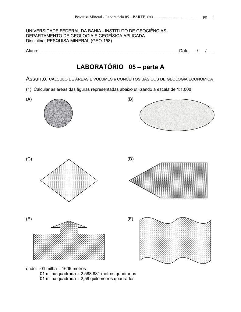 Pesquisa Mineral - Laboratório 05 – PARTE (A) ..................................................pg. 1 UNIVERSIDADE FEDERAL DA BAHIA - INSTITUTO DE GEOCIÊNCIAS DEPARTAMENTO DE GEOLOGIA E GEOFÍSICA APLICADA Disciplina: PESQUISA MINERAL (GEO-158) Aluno:__________________________________________________________ Data:___/___/___ LABORATÓRIO 05 – parte A Assunto: CÁLCULO DE ÁREAS E VOLUMES e CONCEITOS BÁSICOS DE GEOLOGIA ECONÔMICA (1) Calcular as áreas das figuras representadas abaixo utilizando a escala de 1:1.000 (A) (B) (C) (D) (E) (F) onde: 01 milha = 1609 metros 01 milha quadrada = 2.588.881 metros quadrados 01 milha quadrada = 2,59 quilômetros quadrados Pesquisa Mineral - Laboratório 05 – PARTE (A) ..................................................pg. FIGURA Área em metros quadrados (m2) Área em quilômetros quadrados (Km2) Àrea em milhas quadradas (ml2) (A) (B) (C) (D) (E) (F) Fontes para consulta: http://www.webcalc.com.br/ (2) Calcular o volume dos sólidos representados a seguir utilizando a escala de 1:10.000 (A) (B) (C) (D) 2 Pesquisa Mineral - Laboratório 05 – PARTE (A) ..................................................pg. (E) (F) (G) Preencha a seguinte tabela: FIGURA Volume em metros cúbicos (m3) Volume em centímetros cúbicos (cm3) (A) (B) (C) (D) (E) (F) (G) Onde: 01metro cúbico = 35,3147 pés cúbicos Volume em pés cúbicos (p3) 3 Pesquisa Mineral - Laboratório 05 – PARTE (A) ..................................................pg. 4 (3) Defina e ilustre com 2 exemplos numéricos diferentes as noções de: (a) teor médio (b) teor limite (c) teor de corte, numa jazida mineral Estabeleça as relações entre: (a) teor médio e teor de corte (b) teor limite e teor de corte (4) Calcule o clarke de concentração dos seguintes elementos, a partir dos dados fornecidos abaixo: CLARKE TEOR MÍNIMO DE EXPLOTABILIDADE Fe 5600 ppm Mn 1000 ppm Pb 16 ppm Au 0.005 g/ton 45% 40% 3% 4g/ton onde o CLARKE DE CONCENTRAÇÃO = teor mínimo de explotabilidade -------------------------------clarke e 1 g/t = 1 ppm ou 0.1% = 1.000 ppm Teoricamente, de qual dos minérios acima seria mais fácil encontrar jazidas minerais? Responda e comente. A seguir você tem tabelas com os cálculos de áreas das principais figuras geométricas planas e as tabelas com os cálculos da superfície e volume de alguns sólidos, os quais foram retirados das seguintes fontes: http://www.webcalc.com.br/ http://www.sulcom.com.br/index.htm http://pessoal.sercomtel.com.br/matematica/geometria/geometria.htm http://www.matematica.br/igeom/index.html Este material deverá ser trazido para a próxima aula!!!!!! This document was created with Win2PDF available at http://www.win2pdf.com. The unregistered version of Win2PDF is for evaluation or non-commercial use only. This page will not be added after purchasing Win2PDF.