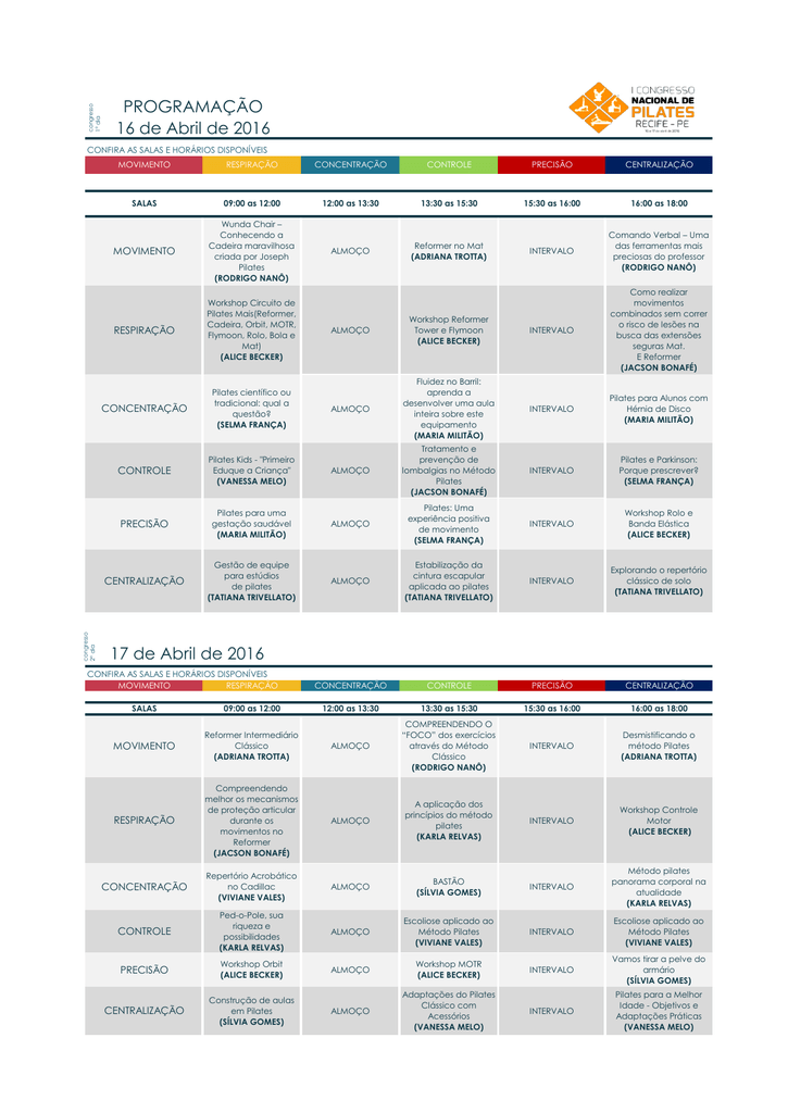congresso 1° dia PROGRAMAÇÃO 16 de Abril de 2016 CONFIRA AS SALAS E HORÁRIOS DISPONÍVEIS congresso 2° dia MOVIMENTO RESPIRAÇÃO CONCENTRAÇÃO CONTROLE PRECISÃO CENTRALIZAÇÃO SALAS 09:00 as 12:00 12:00 as 13:30 13:30 as 15:30 15:30 as 16:00 16:00 as 18:00 MOVIMENTO Wunda Chair – Conhecendo a Cadeira maravilhosa criada por Joseph Pilates (RODRIGO NANÔ) ALMOÇO Reformer no Mat (ADRIANA TROTTA) INTERVALO Comando Verbal – Uma das ferramentas mais preciosas do professor (RODRIGO NANÔ) RESPIRAÇÃO Workshop Circuito de Pilates Mais(Reformer, Cadeira, Orbit, MOTR, Flymoon, Rolo, Bola e Mat) (ALICE BECKER) CONCENTRAÇÃO Pilates científico ou tradicional: qual a questão? (SELMA FRANÇA) ALMOÇO Workshop Reformer Tower e Flymoon (ALICE BECKER) INTERVALO Como realizar movimentos combinados sem correr o risco de lesões na busca das extensões seguras Mat. E Reformer (JACSON BONAFÉ) ALMOÇO Fluidez no Barril: aprenda a desenvolver uma aula inteira sobre este equipamento (MARIA MILITÃO) INTERVALO Pilates para Alunos com Hérnia de Disco (MARIA MILITÃO) CONTROLE Pilates Kids - "Primeiro Eduque a Criança" (VANESSA MELO) ALMOÇO Tratamento e prevenção de lombalgias no Método Pilates (JACSON BONAFÉ) INTERVALO Pilates e Parkinson: Porque prescrever? (SELMA FRANÇA) PRECISÃO Pilates para uma gestação saudável (MARIA MILITÃO) ALMOÇO Pilates: Uma experiência positiva de movimento (SELMA FRANÇA) INTERVALO Workshop Rolo e Banda Elástica (ALICE BECKER) CENTRALIZAÇÃO Gestão de equipe para estúdios de pilates (TATIANA TRIVELLATO) ALMOÇO Estabilização da cintura escapular aplicada ao pilates (TATIANA TRIVELLATO) INTERVALO Explorando o repertório clássico de solo (TATIANA TRIVELLATO) CONCENTRAÇÃO CONTROLE PRECISÃO CENTRALIZAÇÃO 12:00 as 13:30 13:30 as 15:30 15:30 as 16:00 16:00 as 18:00 INTERVALO Desmistificando o método Pilates (ADRIANA TROTTA) 17 de Abril de 2016 CONFIRA AS SALAS E HORÁRIOS DISPONÍVEIS MOVIMENTO RESPIRAÇÃO SALAS 09:00 as 12:00 MOVIMENTO Reformer Intermediário Clássico (ADRIANA TROTTA) ALMOÇO COMPREENDENDO O “FOCO” dos exercícios através do Método Clássico (RODRIGO NANÔ) RESPIRAÇÃO Compreendendo melhor os mecanismos de proteção articular durante os movimentos no Reformer (JACSON BONAFÉ) ALMOÇO A aplicação dos princípios do método pilates (KARLA RELVAS) INTERVALO Workshop Controle Motor (ALICE BECKER) CONCENTRAÇÃO Repertório Acrobático no Cadillac (VIVIANE VALES) ALMOÇO BASTÃO (SÍLVIA GOMES) INTERVALO Método pilates panorama corporal na atualidade (KARLA RELVAS) CONTROLE Ped-o-Pole, sua riqueza e possibilidades (KARLA RELVAS) ALMOÇO Escoliose aplicado ao Método Pilates (VIVIANE VALES) INTERVALO Escoliose aplicado ao Método Pilates (VIVIANE VALES) PRECISÃO Workshop Orbit (ALICE BECKER) ALMOÇO Workshop MOTR (ALICE BECKER) INTERVALO Vamos tirar a pelve do armário (SÍLVIA GOMES) CENTRALIZAÇÃO Construção de aulas em Pilates (SÍLVIA GOMES) ALMOÇO Adaptações do Pilates Clássico com Acessórios (VANESSA MELO) INTERVALO Pilates para a Melhor Idade - Objetivos e Adaptações Práticas (VANESSA MELO)