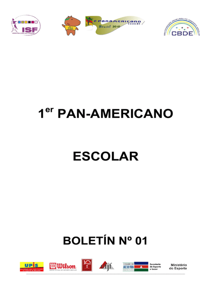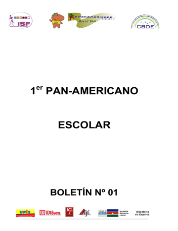 er 1 PAN-AMERICANO ESCOLAR BOLETÍN Nº 01 _________________________________________________________________________________________________________________ BOLETÍN OFICIAL GENERAL Nº 01 – 23/08/2010 COMITÉ DE HONOR MINISTRO DEL ESTADO DEL DEPORTE Orlando Silva de Jesus Junior PREFECTO MUNICIPAL DE JUIZ DE FORA Custódio Mattos PRESIDENTE DE LA “INTERNATIONAL SCHOOL SPORT FEDERATION” - ISF Andrea Delpin SECRETÁRIO GENERAL DE LA “INTERNATIONAL SCHOOL SPORT FEDERATION” - ISF Jan Coolen VICE PRESIDENTE DE LA “INTERNATIONAL SCHOOL SPORT FEDERATION” PARA LAS AMERICAS – ISF Freddie Sanchez PRESIDENTE DE LA “CONFEDERAÇÃO BRASILEIRA DO DESPORTO ESCOLAR” – CBDE Carlos Sérgio Rufino Moreira PRESIDENTE DE LA “FEDERAÇÃO DE ESPORTE ESTUDANTIL” DE MINAS GERAIS Everson Ciccarini SECRETÁRIO DE DEPORTE Y OCIO DE JUIZ DE FORA Renato Miranda _________________________________________________________________________________________________________________ DIRECTORIA DE LA CBDE PRESIDENTE Carlos Sérgio Rufino Moreira VICEPRESIDENTE Antonio Hora Filho DIRECTOR DE RELACIONES INTERNACIONALES José Medalha DIRECTOR DE RELACIONES NACIONALES André Coutinho SECRETÁRIO GENERAL Robson Aguiar DIRECTOR FINANCIERO Jean Pierre Dummar DIRECTOR DEL DEPARTAMENTO TÉCNICO Rafael Serour _________________________________________________________________________________________________________________ COMITÉ ORGANIZADOR LOCALIDAD: VICTORY BUSINESS HOTEL DIRECCIÓN: Avenida Independência, 1850 - Centro DIRECCIÓN GENERAL Antonio Hora Filho Renato Miranda DIRECCIÓN GENERAL ADJUNTA Heglison Toledo Éverson Ciccarini DIRECCIÓN DE FINANZAS Robson Aguiar Jean Pierre Dummar DIRECCIÓN DE RELACIONES INTERNACIONALES José Medalha ASESORÍA DE PRENSA Marcus Vinicius Ciccarini Secretário de Comunicação – Rodrigo Barbosa Aline Pernambuco DIRECTORIA TÉCNICA GENERAL Professor Rafael Serour SOPORTE TÉCNICO Professor Marcelo Salgado de Oliveira Robson Fonseca ASESORÍA TÉCNICA Y ARBITRAJE Federação de Esportes Estudantis de Minas Gerais SECRETARÍA GENERAL Robson Aguiar _________________________________________________________________________________________________________________ COORDINACIÓN DE CONTROL Y CREDENCIAMIENTO Pedro Aglaílton Guilherme Ciccarini Alexander Braga GERENCIA OPERACIONAL Federação de Esportes Estudantis de Minas Gerais ASESORÍA OPERACIONAL Bernardo Noel Gonçalves COORDINACIÓN DE INFRAESTRUCTURA Claudio Esteves COORDINACIÓN DE VOLUNTARIOS Jaqueline Miranda Fam COORDINACIÓN DE TRANSPORTES Leonardo Beire Orlando Benício COORDINACIÓN DE CONTROLO DE MATERIALES Y EQUIPO Federação de Esportes Estudantis de Minas Gerais COORDINACIÓN DE FINANZAS Jean Pierre Dummar Lúcio Fortes COORDINACIÓN DE COMUNICACIÓN Y MARKETING CBDE FEEMG Secretaria de Comunicação COORDINACIÓN DE SERVICIOS MÉDICOS Secretaria de Saúde de Juiz de Fora COORDINACIÓN MUNICIPAL DE CONVENIOS Jackson Antunes _________________________________________________________________________________________________________________ COORDINACIÓN MUNICIPAL DE ALOJAMIENTO Danielle Feyo COORDINACIÓN CIENTÍFICA Y CONFERENCIAS TÉCNICAS Heglison Toledo GERENCIA DE ACTIVIDADES SOCIOCULTURALES Y EDUCATIVAS Eleuza Barbosa Toninho Dutra Irie Salomão COORDINACIÓN DE CERIMONIALES DE APERTURA Y PREMIOS Maria Luíza Barbosa Pinto Sérgio Evangelista do Santos PRESIDENTE DEL TRIBUNAL DE JUSTICIA Convênio com a OAB Municipal VICEPRESIDENTE Convênio com a OAB Municipal PROCURADOR Convênio com a OAB Municipal DEFENSOR DEL PUEBLO Convênio com a OAB Municipal AUDITORES Convênio com a OAB Municipal SECRETARIA GENERAL Convênio com a OAB Municipal _________________________________________________________________________________________________________________ CREDENCIAL El uso de la credencial (insignia) es obligatorio. Ella es esencial para su identificación y seguridad. Solamente con el uso de la credencial será permitido el aceso y la permanencia em las locaciones de alojamiento, alimentación y competición, en el transporte y, cuando necesario, para atendimiento médicohospitalar (acompañado del Documento Nacional de Identidad - DNI). LA CREDENCIAL ES EL DOCUMENTO QUE DÁ CONDICIÓN A LOS PARTICIPANTES DE COMPETIR. LISTA FECHA LOCAL Gimnasio 1 FAEFID 24/08 Martes Campo FAEFID Sport Club MODALIDAD HORARIO PARTIDO JUEGO Voleibol Femenino 09:00 Guatemala X Brasil 1 1 Voleibol Masculino 10:30 Guatemala X Brasil 2 2 Balonmano Masculino 12:00 Brasil 1 X Brasil 2 Balonmano Masculino 13:30 Paraguay X Guatemala Balonmano Femenino 15:00 Brasil 1 X Brasil 2 Balonmano Femenino 16:30 Guatemala X Paraguay Fútbol 09:00 Brasil 1 X Paraguai Baloncesto Femenino 09:00 Brasil 1 X Brasil 2 Baloncesto Masculino 10:30 Brasil 1 X Brasil 2 _________________________________________________________________________________________________________________ 1 FECHA LOCAL MODALIDAD HORARIO Voleibol Femenino 09:00 Brasil 2 X Perdedor Juego 1 Voleibol Masculino 10:30 Brasil 1 X Perdedor Juego 2 Balonmano Masculino 12:00 Brasil 1 X Guatemala Balonmano Masculino 13:30 Paraguay X Brasil 2 Balonmano Femenino 15:00 Brasil 1 X Paraguay Balonmano Femenino 16:30 Guatemala X Brasil 2 Pista Atletismo 15:00 Calentamento y Competición Piscina Natación 14:30 Calentamento y Competición Campo FAEFID Fútbol 09:00 Brasil 2 X Perdedor Juego 1 Baloncesto Femenino 09:00 Brasil 1 X Brasil 2 Baloncesto Masculino 10:30 Brasil 1 X Brasil 2 Gimnasio 1 FAEFID 25/08 Miércoles Sport Club FECHA LOCAL JUEGO MODALIDAD HORARIO Voleibol Femenino 09:00 Brasil 2 X Ganador Juego 1 Voleibol Masculino 10:30 Brasil 1 X Ganador Juego 2 Balonmano Masculino 12:00 Guatemala X Brasil 2 Balonmano Masculino 13:30 Brasil 1 X Paraguay Balonmano Femenino 15:00 Paraguay X Brasil 2 Balonmano Femenino 16:30 Brasil 1 X Guatemala Piscina Natación 09:30 Calentamento y Competición Piscina Natación 14:30 Calentamento y Competición Atletismo 09:00 Calentamento y Competición Atletismo 15