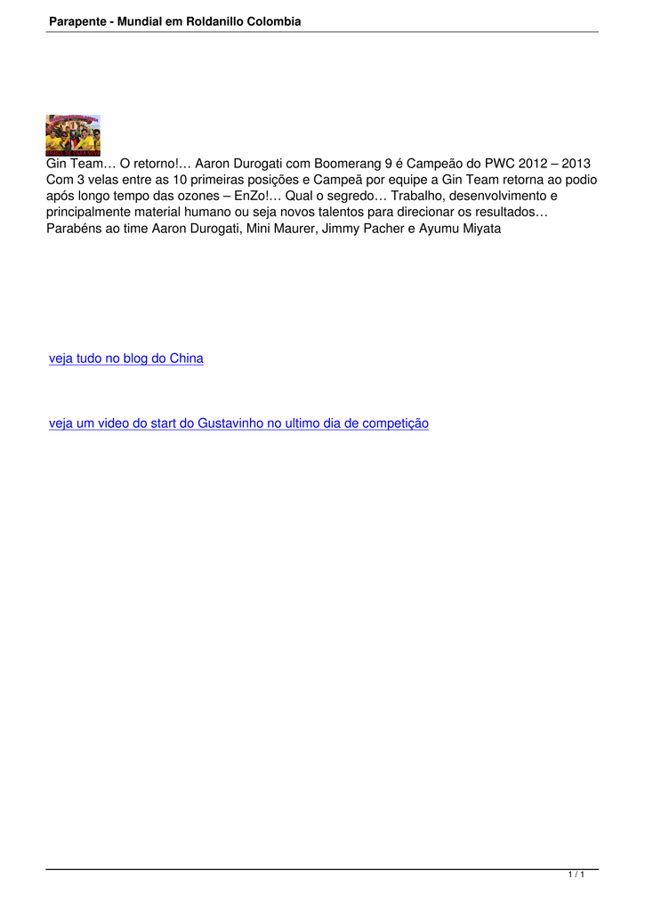 Parapente - Mundial em Roldanillo Colombia Gin Team… O retorno!… Aaron Durogati com Boomerang 9 é Campeão do PWC 2012 – 2013 Com 3 velas entre as 10 primeiras posições e Campeã por equipe a Gin Team retorna ao podio após longo tempo das ozones – EnZo!… Qual o segredo… Trabalho, desenvolvimento e principalmente material humano ou seja novos talentos para direcionar os resultados… Parabéns ao time Aaron Durogati, Mini Maurer, Jimmy Pacher e Ayumu Miyata veja tudo no blog do China veja um video do start do Gustavinho no ultimo dia de competição 1/1