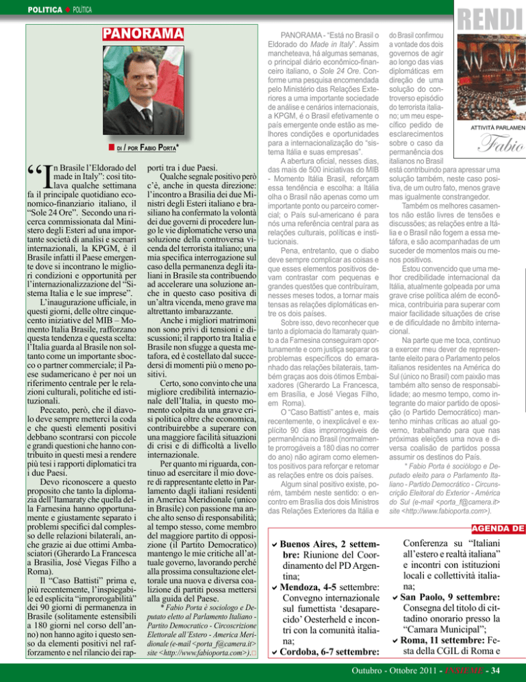 POLITICA u POLÍTICA PANORAMA “I ¢ di / por Fabio Porta* n Brasile l’Eldorado del made in Italy”: così titolava qualche settimana fa il principale quotidiano economico-finanziario italiano, il “Sole 24 Ore”. Secondo una ricerca commissionata dal Ministero degli Esteri ad una importante società di analisi e scenari internazionali, la KPGM, è il Brasile infatti il Paese emergente dove si incontrano le migliori condizioni e opportunità per l’internazionalizzazione del “Sistema Italia e le sue imprese”. L’inaugurazione ufficiale, in questi giorni, delle oltre cinquecento iniziative del MIB – Momento Italia Brasile, rafforzano questa tendenza e questa scelta: l’Italia guarda al Brasile non soltanto come un importante sbocco o partner commerciale; il Paese sudamericano è per noi un riferimento centrale per le relazioni culturali, politiche ed istituzionali. Peccato, però, che il diavolo deve sempre metterci la coda e che questi elementi positivi debbano scontrarsi con piccole e grandi questioni che hanno contribuito in questi mesi a rendere più tesi i rapporti diplomatici tra i due Paesi. Devo riconoscere a questo proposito che tanto la diplomazia dell’Itamaraty che quella della Farnesina hanno opportunamente e giustamente separato i problemi specifici dal complesso delle relazioni bilaterali, anche grazie ai due ottimi Ambasciatori (Gherardo La Francesca a Brasilia, Josè Viegas Filho a Roma). Il “Caso Battisti” prima e, più recentemente, l’inspiegabile ed esplicita “improrogabilità” dei 90 giorni di permanenza in Brasile (solitamente estensibili a 180 giorni nel corso dell’anno) non hanno agito i questo senso da elementi positivi nel rafforzamento e nel rilancio dei rap- porti tra i due Paesi. Qualche segnale positivo però c’è, anche in questa direzione: l’incontro a Brasilia dei due Ministri degli Esteri italiano e brasiliano ha confermato la volontà dei due governi di procedere lungo le vie diplomatiche verso una soluzione della controversa vicenda del terrorista italiano; una mia specifica interrogazione sul caso della permanenza degli italiani in Brasile sta contribuendo ad accelerare una soluzione anche in questo caso positiva di un’altra vicenda, meno grave ma altrettanto imbarazzante. Anche i migliori matrimoni non sono privi di tensioni e discussioni; il rapporto tra Italia e Brasile non sfugge a questa metafora, ed è costellato dal succedersi di momenti più o meno positivi. Certo, sono convinto che una migliore credibilità internazionale dell’Italia, in questo momento colpita da una grave crisi politica oltre che economica, contribuirebbe a superare con una maggiore facilità situazioni di crisi e di difficoltà a livello internazionale. Per quanto mi riguarda, continuo ad esercitare il mio dovere di rappresentante eletto in Parlamento dagli italiani residenti in America Meridionale (unico in Brasile) con passione ma anche alto senso di responsabilità; al tempo stesso, come membro del maggiore partito di opposizione (il Partito Democratico) mantengo le mie critiche all’attuale governo, lavorando perché alla prossima consultazione elettorale una nuova e diversa coalizione di partiti possa mettersi alla guida del Paese. * Fabio Porta è sociologo e Deputato eletto al Parlamento Italiano Partito Democratico - Circoscrizione Elettorale all’Estero - America Meridionale (e-mail <[email protected]> site <http://www.fabioporta.com>).* PANORAMA - “Está no Brasil o Eldorado do Made in Italy”. Assim mancheteava, há algumas semanas, o principal diário econômico-financeiro italiano, o Sole 24 Ore. Conforme uma pesquisa encomendada pelo Ministério das Relações Exteriores a uma importante sociedade de análise e cenários internacionais, a KPGM, é o Brasil efetivamente o país emergente onde estão as melhores condições e oportunidades para a internacionalização do “sistema Itália e suas empresas”. A abertura oficial, nesses dias, das mais de 500 iniciativas do MIB - Momento Itália Brasil, reforçam essa tendência e escolha: a Itália olha o Brasil não apenas como um importante ponto ou parceiro comercial; o País sul-americano é para nós uma referência central para as relações culturais, políticas e institucionais. Pena, entretanto, que o diabo deve sempre complicar as coisas e que esses elementos positivos devam contrastar com pequenas e grandes questões que contribuíram, nesses meses todos, a tornar mais tensas as relações diplomáticas entre os dois países. Sobre isso, devo reconhecer que tanto a diplomacia do Itamaraty quanto a da Farnesina conseguiram oportunamente e com justiça separar os problemas específicos do emaranhado das relações bilaterais, também graças aos dois ótimos Embaixadores (Gherardo La Francesca, em Brasília, e José Viegas Filho, em Roma). O “Caso Battisti” antes e, mais recentemente, o inexplicável e explícito 90 dias improrrogáveis de permanência no Brasil (normalmente prorrogáveis a 180 dias no correr do ano) não agiram como elementos positivos para reforçar e retomar as relações entre os dois países. Algum sinal positivo existe, porém, também neste sentido: o encontro em Brasília dos dois Ministros das Relações Exteriores da Itália e RENDI do Brasil confirmou a vontade dos dois governos de agir ao longo das vias diplomáticas em direção de uma solução do controverso episódio do terrorista italiano; um meu específico pedido de attività parlamen esclarecimentos sobre o caso da permanência dos italianos no Brasil está contribuindo para apressar uma solução também, neste caso positiva, de um outro fato, menos grave mas igualmente constrangedor. Também os melhores casamentos não estão livres de tensões e discussões; as relações entre a Itália e o Brasil não fogem a essa metáfora, e são acompanhadas de um suceder de momentos mais ou menos positivos. Estou convencido que uma melhor credibilidade internacional da Itália, atua