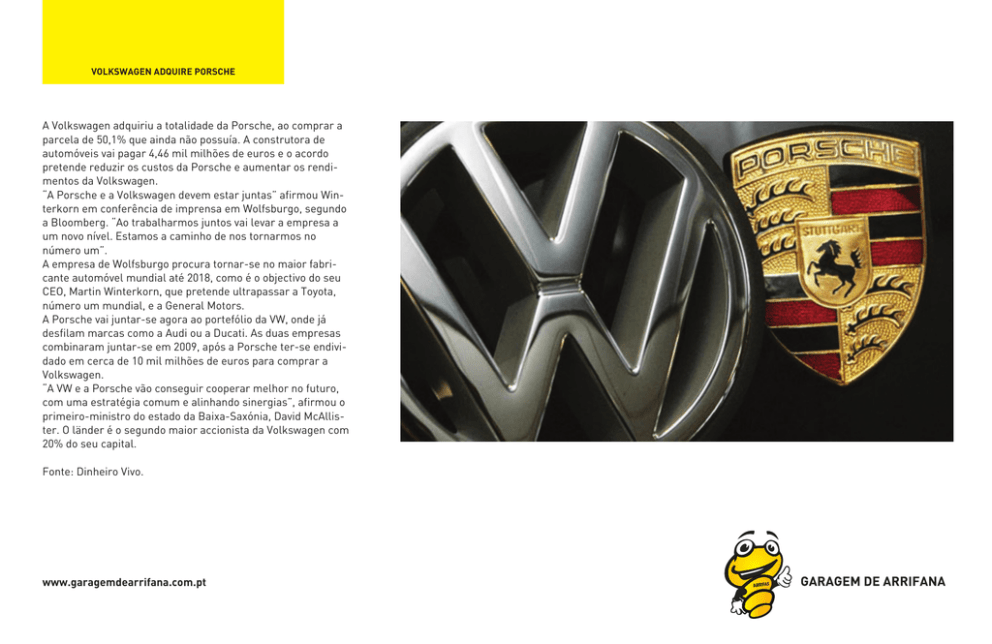 VOLKSWAGEN ADQUIRE PORSCHE A Volkswagen adquiriu a totalidade da Porsche, ao comprar a parcela de 50,1% que ainda não possuía. A construtora de automóveis vai pagar 4,46 mil milhões de euros e o acordo pretende reduzir os custos da Porsche e aumentar os rendimentos da Volkswagen. “A Porsche e a Volkswagen devem estar juntas” afirmou Winterkorn em conferência de imprensa em Wolfsburgo, segundo a Bloomberg. “Ao trabalharmos juntos vai levar a empresa a um novo nível. Estamos a caminho de nos tornarmos no número um”. A empresa de Wolfsburgo procura tornar-se no maior fabricante automóvel mundial até 2018, como é o objectivo do seu CEO, Martin Winterkorn, que pretende ultrapassar a Toyota, número um mundial, e a General Motors. A Porsche vai juntar-se agora ao portefólio da VW, onde já desfilam marcas como a Audi ou a Ducati. As duas empresas combinaram juntar-se em 2009, após a Porsche ter-se endividado em cerca de 10 mil milhões de euros para comprar a Volkswagen. “A VW e a Porsche vão conseguir cooperar melhor no futuro, com uma estratégia comum e alinhando sinergias”, afirmou o primeiro-ministro do estado da Baixa-Saxónia, David McAllister. O länder é o segundo maior accionista da Volkswagen com 20% do seu capital. Fonte: Dinheiro Vivo. www.garagemdearrifana.com.pt