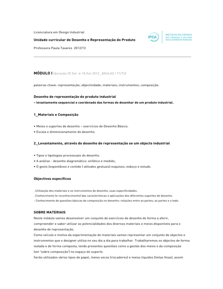 Licenciatura em Design Industrial Unidade curricular de Desenho e Representação do Produto Professora Paula Tavares 2012/13 _______________________________________________________________________________________ MÓDULO I [duração 25 Set > 18 Out 2012 _8AULAS | T1/T2] palavras chave: representação; objectividade; materiais; instrumentos; composição. Desenho de representação do produto industrial – levantamento sequencial e coordenado das formas de desenhar de um produto industrial. 1_Materiais e Composição • Meios e suportes de desenho – exercícios de Desenho Básico. • Escala e dimensionamento do desenho. 2_Levantamento, através do desenho de representação se um objecto industrial • Tipos e tipologias processuais do desenho. • A análise - desenho diagramático: enfático e medido; • O gesto (espontâneo e contido | atitudes gestuais) esquisso; esboço e estudo. Objectivos específicos . Utilização dos materiais e os instrumentos de desenho, suas especificidades. . Conhecimento (e reconhecimento) das características e aplicações dos diferentes suportes de desenho. - Conhecimento de questões básicas de composição no desenho: relações entre as partes; as partes e o todo. SOBRE MATERIAIS Neste módulo vamos desenvolver um conjunto de exercícios de desenho de forma a aferir, compreender e saber utilizar as potencialidades dos diversos materiais e meios disponíveis para o desenho de representação. Como veículo e motivo da experimentação de materiais vamos representar um conjunto de objectos e instrumentos que o designer utiliza no seu dia a dia para trabalhar. Trabalharemos os objectos de forma isolada e de forma composta, tendo presentes questões como a gestão dos meios e da composição (ver ‘sobre composição’) no espaço do suporte. Serão utilizados vários tipos de papel, meios secos (riscadores) e meios líquidos (tintas finas), assim como os instrumentos próprios à correcta execução das diferentes propostas de trabalho (aula a aula). SOBRE COMPOSIÇÃO Compor é “pôr em conjunto”. A composição é a organização de todos os elementos constitutivos de uma obra, de um desenho, estes formam a unidade do suporte (bidimensional) que internamente tem as suas leis ordenadoras. Por elementos da obra, ou do desenho, entendemos as características formais assim como os aspectos temáticos, isto é, forma e conceito. A História das Artes Visuais demonstrou-nos que as regras compósitas são variáveis, em determinados períodos os artistas obedeceram a leis supostamente divinas - a secção áurea ou a divina proporção; noutros privilegiaram as oblíquas e as curvas, como no barroco / maneirismo; e na modernidade, no século vinte, a regra foi a anti regra. E se as questões da composição parecem incontornáveis para o Desenho dito artístico, são também relevantes quando aplicadas à especificidade do desenho do design, seja industrial, de moda, gráfico ou outro. A distribuição dos diversos elementos no espaço, a sua apresentação e “explicação”, deve ser gerida forma coerente e atenta. Respeitando um conjunto de regras básicas universais em qualquer tipo de composição bidimensional. Regras básicas (leis de composição) para representações bidimensionais: A linha e a forma - horizontalidade – expressa calma e descanso; - verticalidade – segurança e força, ascensão, estabilidade (hiperbolizada quando utilizada ortogonalmente – vertical horizontal); - diagonais e obliquas – dinamismo, expressividade e dramatismo. - linhas curvas – implicam movimento; - repetição – transmite ritmo. O espaço - organização de planos, volume. A cor - temperatura da cor; - simbologia da cor. A luz - valores e volume. Sobre o tipos e tipologias processuais do Desenho a utilizar neste módulo: Tipos de abordagem do Desenho Esquissos: esta abordagem é rápida e intuitiva, capta de um modo sintético e sistemático aquilo que se considere como essencial da configuração do nosso objecto de observação. Este desenho deve ser efectuado com materiais de fácil manuseio, como caneta, esferográfica, marcador fino, ou outros; servirá essencialmente para um primeiro reconhecimento de um lugar, de uma pose, ou de uma situação específica. Cada esquisso pode aparecer isolado numa folha de papel, mas preferencial e tendencialmente é pensado como uma sequência organizada de registos inter-relacionáveis (na mesma folha) e que, no seu conjunto, dão uma visão aprofundada e alargada de uma dada situação. Esboços: este tipo de desenho poderá nascer de um modo racional ou intuitivo, isto é, de uma estruturação de tipo diagramática ou de uma abordagem mais orgânica e pessoal. Poderemos pensar o esboço como uma série de registos onde gradualmente se vão sobrepondo “camadas” de informação até se atingir a configuração pretendida. Deste modo, de preferência, o primeiro apontamento deve ser mais leve e transparente até à fase final do esboço, onde a situação visual em causa se revele e se assuma claramente com as diferentes intensidades tonais visíveis pretendidas (peso e massa, proximidade e luz). Neste tipo de desenhos pode utilizar instrumentos em barra, lápis moles, pincéis e penas para as tintas de água. Estudo: nesta abordagem o desenho difere dos outros essencialmente pelo tempo de execução, que, neste caso, é muito mais longo. Pode ser começado de um modo diagramático e racional, ou de um modo orgânico e intuitivo dependendo isso exclusivamente da aptidão e desenvoltura instrumental de quem desenha. No fundo podemos considerar este tipo de desenho como um desenvolvimento de um esboço só que levado muito mais longe no que toca ao levantamento e tratamento de determinados aspectos pretendidos. Deve atender tanto aos pormenores como ao seu relacionamento e articulação no seu todo. Para este tipo de desenho a grafite em lápis ou em barra adequa-se melhor ao seu desenvolviment