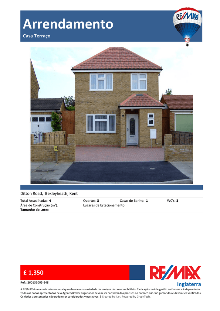 Arrendamento Casa Terraço Ditton Road, Bexleyheath, Kent Total Assoalhadas: 4 Àrea de Construção (m²): Tamanho do Lote:: Quartos: 3 Casas de Banho: 1 Lugares de Estacionamento: WC's: 3 £ 1,350 Ref:: 260131005-248 Inglaterra A RE/MAX é uma rede internacional que oferece uma variedade de serviços do ramo imobiliário. Cada agência é de gestão autónoma e independente. Todos os dados apresentados pelo Agente/Broker angariador devem ser considerados precisos no entanto não são garantidos e devem ser verificados. Os dados apresentados não podem ser considerados vinculativos. | Created by iList. Powered by GryphTech. Arrendamento Casa Terraço Suky Khosa Telefone do Agente 07989 848 595 Telefone Directo 07989 848 595 Fax: [email protected] http://www.remaxselect.co.uk RE/MAX Select 5 Pickford Lane Bexleyheath Kent DA7 4RD England RE/MAX Select are delighted to offer to let this modern detached family home in the sought after location of South Bexleyheath. The accommodation comprises lounge/diner, fitted kitchen, ground floor cloakroom, 3 bedrooms and family bathroom. Further benefits include rear garden, double glazing, gas central heating and off street parking for 2 cars. Viewing highly recommended. Total Internal Area approx: 73 sq m. EPC Rating B82 Divisões Sala Comum 21' 4" x 11' 7" (6.50m x 3.53m) Double glazed window to front, two radiators, double glazed patio doors to garden, carpet as laid, TV point, telephone point. Cozinha 9' 10" x 8' 10" (3.00m x 2.69m) Double glazed window to rear, tiled flooring, range of wall and base units with work surfaces over; space and plumbing for washing machine and dishwasher, space for fridge/freezer, space for cooker; localised tiling. Outros Double glazed window to front, tiled flooring, localised tiling to walls, wash-hand basin, low-level w/c, radiator. Quarto 10' 9" x 11' 6" (3.28m x 3.51m) Double glazed window to front, carpet as laid, radiator. Quarto 11' 6" x 9' 11" (3.51m x 3.02m) Double glazed window to rear, carpet as laid, TV point, radiator. Quarto 7' 2" x 6' 10" (2.18m x 2.08m) Double glazed window to front, carpet as laid, radiator. Casa de Banho 7' 1" x 6' 8" (2.16m x 2.03m) Double glazed frosted window to rear, tiled flooring, white bathroom suite comprising bath with shower over, wash-hand basin, low-level w/c, localised tiling to walls. Jardim £ 1,350 Ref:: 260131005-248 Inglaterra A RE/MAX é uma rede internacional que oferece uma variedade de serviços do ramo imobiliário. Cada agência é de gestão autónoma e independente. Todos os dados apresentados pelo Agente/Broker angariador devem ser considerados precisos no entanto não são garantidos e devem ser verificados. Os dados apresentados não podem ser considerados vinculativos. | Created by iList. Powered by GryphTech. Arrendamento Casa Terraço Approximately 40ft, patio area to immediate rear of property, laid to lawn, side access to front of property. £ 1,350 Ref:: 260131005-248 Inglaterra A RE/MAX é uma rede internacional que oferece uma variedade de serviços do ramo imobiliário. Cada agência é de gestão autónoma e independente. Todos os dados apresentados pelo Agente/Broker angariador devem ser considerados precisos no entanto não são garantidos e devem ser verificados. Os dados apresentados não podem ser considerados vinculativos. | Created by iList. Powered by GryphTech.