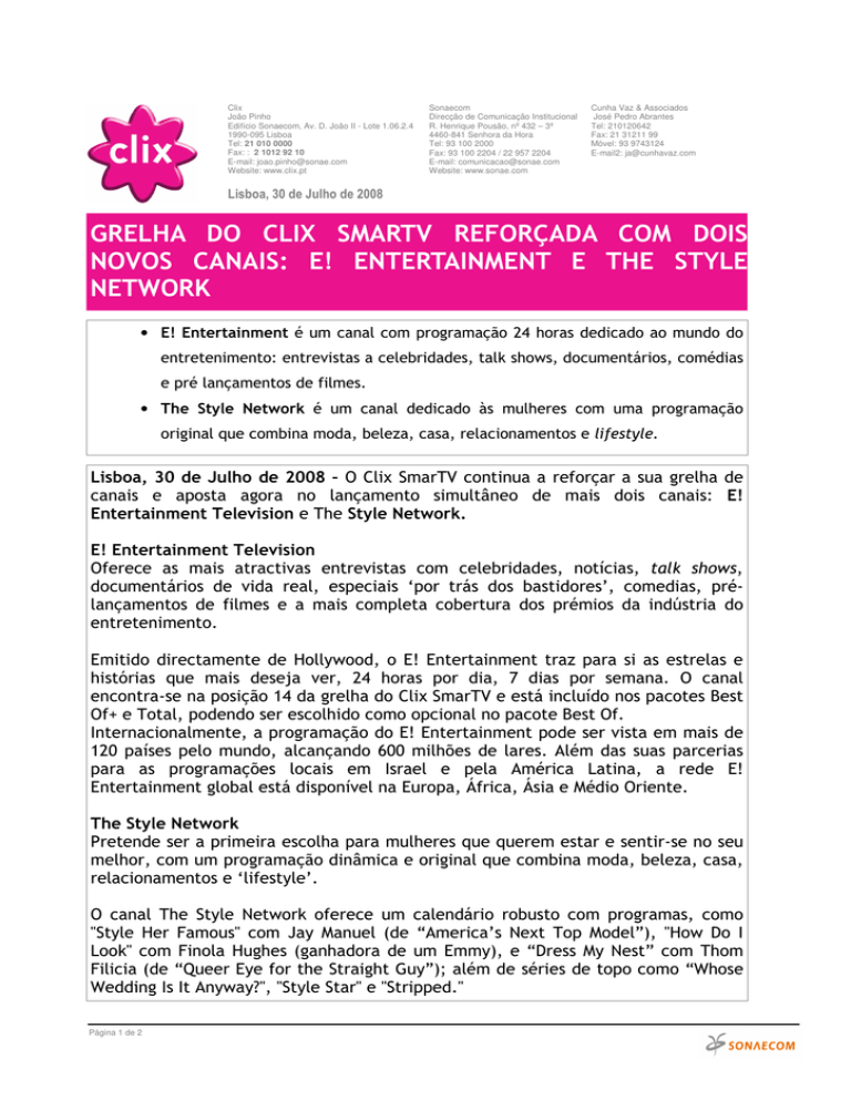 Clix João Pinho Edifício Sonaecom, Av. D. João II - Lote 1.06.2.4 1990-095 Lisboa Tel: 21 010 0000 Fax: : 2 1012 92 10 E-mail: [email protected] Website: www.clix.pt Sonaecom Direcção de Comunicação Institucional R. Henrique Pousão, nº 432 – 3º 4460-841 Senhora da Hora Tel: 93 100 2000 Fax: 93 100 2204 / 22 957 2204 E-mail: [email protected] Website: www.sonae.com Cunha Vaz & Associados José Pedro Abrantes Tel: 210120642 Fax: 21 31211 99 Móvel: 93 9743124 E-mail2: [email protected] Lisboa, 30 de Julho de 2008 GRELHA DO CLIX SMARTV REFORÇADA COM DOIS NOVOS CANAIS: E! ENTERTAINMENT E THE STYLE NETWORK • E! Entertainment é um canal com programação 24 horas dedicado ao mundo do entretenimento: entrevistas a celebridades, talk shows, documentários, comédias e pré lançamentos de filmes. • The Style Network é um canal dedicado às mulheres com uma programação original que combina moda, beleza, casa, relacionamentos e lifestyle. Lisboa, 30 de Julho de 2008 – O Clix SmarTV continua a reforçar a sua grelha de canais e aposta agora no lançamento simultâneo de mais dois canais: E! Entertainment Television e The Style Network. E! Entertainment Television Oferece as mais atractivas entrevistas com celebridades, notícias, talk shows, documentários de vida real, especiais ‘por trás dos bastidores’, comedias, prélançamentos de filmes e a mais completa cobertura dos prémios da indústria do entretenimento. Emitido directamente de Hollywood, o E! Entertainment traz para si as estrelas e histórias que mais deseja ver, 24 horas por dia, 7 dias por semana. O canal encontra-se na posição 14 da grelha do Clix SmarTV e está incluído nos pacotes Best Of+ e Total, podendo ser escolhido como opcional no pacote Best Of. Internacionalmente, a programação do E! Entertainment pode ser vista em mais de 120 países pelo mundo, alcançando 600 milhões de lares. Além das suas parcerias para as programações locais em Israel e pela América Latina, a rede E! Entertainment global está disponível na Europa, África, Ásia e Médio Oriente. The Style Network Pretende ser a primeira escolha para mulheres que querem estar e sentir-se no seu melhor, com um programação dinâmica e original que combina moda, beleza, casa, relacionamentos e ‘lifestyle’. O canal The Style Network oferece um calendário robusto com programas, como "Style Her Famous" com Jay Manuel (de “America’s Next Top Model”), "How Do I Look" com Finola Hughes (ganhadora de um Emmy), e “Dress My Nest” com Thom Filicia (de “Queer Eye for the Straight Guy”); além de séries de topo como “Whose Wedding Is It Anyway?", "Style Star" e "Stripped." Página 1 de 2 Este novo canal está disponível na posição 67 da grelha e incluído nos pacotes Best Of+ e Total, podendo se escolhido como opcional pelos clientes do Best Of. Total de canais por pacote: Free: 25 canais Best Of: 50 canais (45 fixos + 5 opcionais) Best Of+: 76 canais (66 fixos + 10 opcionais) Total: todos os canais (excepto Canais Premium) Sobre o Clix SmarTV Trata-se do primeiro serviço de televisão digital (IPTV) a funcionar no País. Com mais de 100 canais de televisão e mais de 800 títulos no serviço Home Vídeo, nas zonas cobertas pela rede de última geração da Sonaecom, o Clix SmarTV está disponível em 4 pacotes que se adaptam ao perfil de cada Cliente, e que abrangem desde a opção mais completa com acesso a todos os conteúdos até à opção grátis, que o Clix oferece a todos os Clientes do serviço de Voz e Internet. Integralmente assente em tecnologia IP (Internet Protocol), assenta na ligação ADSL ultra-rápida, o Clix oferece um serviço 4 em 1 - Televisão Digital + Home Video + Internet + Telefone. Um Modem Router ADSL 2+, que recebe os dados vindos da Internet, e uma TV Box asseguram a descodificação do sinal dos canais digitais e do serviço Home Video. ## Página 2 de 2
