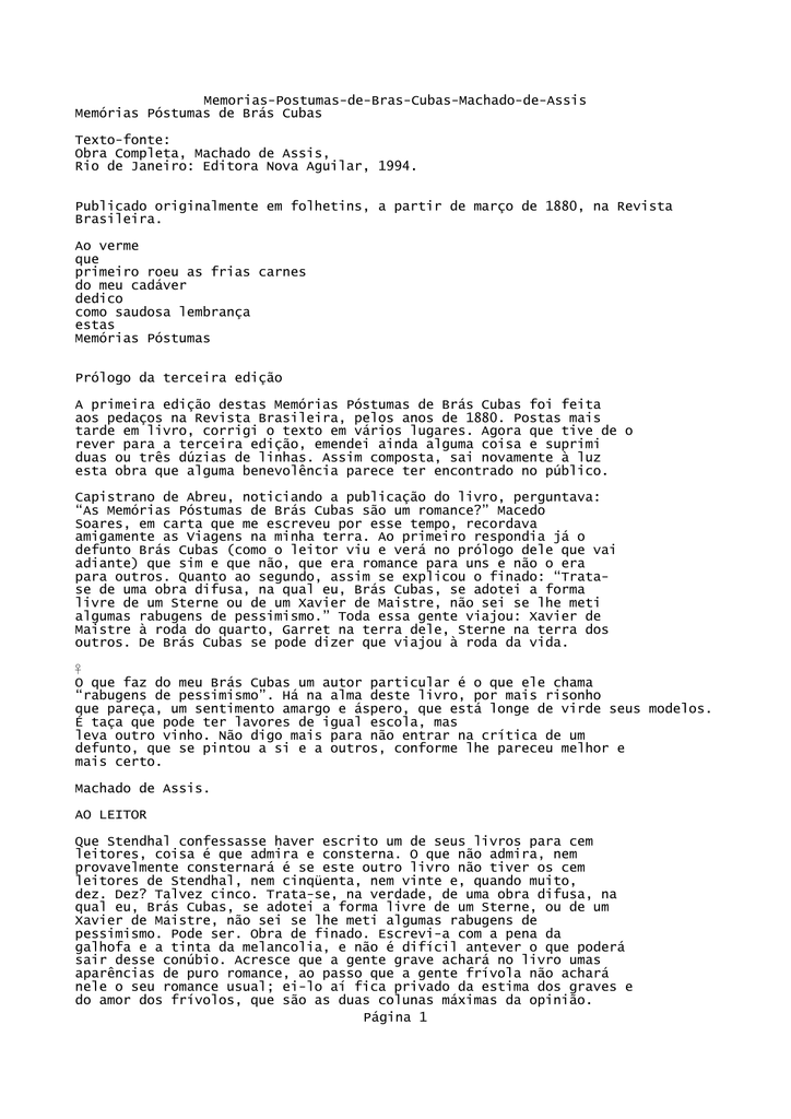 Memorias-Postumas-de-Bras-Cubas-Machado-de-Assis Memórias Póstumas de Brás Cubas Texto-fonte: Obra Completa, Machado de Assis, Rio de Janeiro: Editora Nova Aguilar, 1994. Publicado originalmente em folhetins, a partir de março de 1880, na Revista Brasileira. Ao verme que primeiro roeu as frias carnes do meu cadáver dedico como saudosa lembrança estas Memórias Póstumas Prólogo da terceira edição A primeira edição destas Memórias Póstumas de Brás Cubas foi feita aos pedaços na Revista Brasileira, pelos anos de 1880. Postas mais tarde em livro, corrigi o texto em vários lugares. Agora que tive de o rever para a terceira edição, emendei ainda alguma coisa e suprimi duas ou três dúzias de linhas. Assim composta, sai novamente à luz esta obra que alguma benevolência parece ter encontrado no público. Capistrano de Abreu, noticiando a publicação do livro, perguntava: “As Memórias Póstumas de Brás Cubas são um romance?” Macedo Soares, em carta que me escreveu por esse tempo, recordava amigamente as Viagens na minha terra. Ao primeiro respondia já o defunto Brás Cubas (como o leitor viu e verá no prólogo dele que vai adiante) que sim e que não, que era romance para uns e não o era para outros. Quanto ao segundo, assim se explicou o finado: “Tratase de uma obra difusa, na qual eu, Brás Cubas, se adotei a forma livre de um Sterne ou de um Xavier de Maistre, não sei se lhe meti algumas rabugens de pessimismo.” Toda essa gente viajou: Xavier de Maistre à roda do quarto, Garret na terra dele, Sterne na terra dos outros. De Brás Cubas se pode dizer que viajou à roda da vida. O que faz do meu Brás Cubas um autor particular é o que ele chama “rabugens de pessimismo”. Há na alma deste livro, por mais risonho que pareça, um sentimento amargo e áspero, que está longe de virde seus modelos. É taça que pode ter lavores de igual escola, mas leva outro vinho. Não digo mais para não entrar na crítica de um defunto, que se pintou a si e a outros, conforme lhe pareceu melhor e mais certo. Machado de Assis. AO LEITOR Que Stendhal confessasse haver escrito um de seus livros para cem leitores, coisa é que admira e consterna. O que não admira, nem provavelmente consternará é se este outro livro não tiver os cem leitores de Stendhal, nem cinqüenta, nem vinte e, quando muito, dez. Dez? Talvez cinco. Trata-se, na verdade, de uma obra difusa, na qual eu, Brás Cubas, se adotei a forma livre de um Sterne, ou de um Xavier de Maistre, não sei se lhe meti algumas rabugens de pessimismo. Pode ser. Obra de finado. Escrevi-a com a pena da galhofa e a tinta da melancolia, e não é difícil antever o que poderá sair desse conúbio. Acresce que a gente grave achará no livro umas aparências de puro romance, ao passo que a gente frívola não achará nele o seu romance usual; ei-lo aí fica privado da estima dos graves e do amor dos frívolos, que são as duas colunas máximas da opinião. Página 1 Memorias-Postumas-de-Bras-Cubas-Machado-de-Assis Mas eu ainda espero angariar as simpatias da opinião, e o primeiro remédio é fugir a um prólogo explícito e longo. O melhor prólogo é o que contém menos coisas, ou o que as diz de um jeito obscuro e truncado. Conseguintemente, evito contar o processo extraordinário que empreguei na composição destas Memórias, trabalhadas cá no outro mundo. Seria curioso, mas nimiamente extenso, e aliás desnecessário ao entendimento da obra. A obra em si mesma é tudo: se te agradar, fino leitor, pago-me da tarefa; se te não agradar, pago-te com um piparote, e adeus. Brás Cubas. CAPÍTULO PRIMEIRO / ÓBITO DO AUTOR Algum tempo hesitei se devia abrir estas memórias pelo princípio ou pelo fim, isto é, se poria em primeiro lugar o meu nascimento ou a minha morte. Suposto o uso vulgar seja começar pelo nascimento, duas considerações me levaram a adotar diferente método: a primeira é que eu não sou propriamente um autor defunto, mas um defunto autor, para quem a campa foi outro berço; a segunda é que o escrito ficaria assim mais galante e mais novo. Moisés, que também contou a sua morte, não a pôs no intróito, mas no cabo: diferença radical entre este livro e o Pentateuco. Dito isto, expirei às duas horas da tarde de uma sexta-feira do mês de agosto de 1869, na minha bela chácara de Catumbi. Tinha uns sessenta e quatro anos, rijos e prósperos, era solteiro, possuía cerca de trezentos contos e fui acompanhado ao cemitério por onze amigos. Onze amigos! Verdade é que não houve cartas nem anúncios. Acresce que chovia — peneirava uma chuvinha miúda, triste e constante, tão constante e tão triste, que levou um daqueles fiéis da última hora a intercalar esta engenhosa idéia no discurso que proferiu à beira de minha cova: — “Vós, que o conhecestes, meus senhores, vós podeis dizer comigo que a natureza parece estar chorando a perda irreparável de um dos mais belos caracteres que têm honrado a humanidade. Este ar sombrio, estas gotas do céu, aquelas nuvens escuras que cobrem o azul como um crepe funéreo, tudo isso é a dor crua e má que lhe rói à Natureza as mais íntimas entranhas; tudo isso é um sublime louvor ao nosso ilustre finado.” Bom e fiel amigo! Não, não me arrependo das vinte apólices que lhe deixei. E foi assim que cheguei à cláusula dos meus dias; foi assim que me encaminhei para o undiscovered country de Hamlet, sem as ânsias nem as dúvidas do moço príncipe, mas pausado e trôpego como quem se retira tarde do espetáculo. Tarde e aborrecido. Viramme ir umas nove ou dez pessoas, entre elas três senhoras, minha irmã Sabina, casada com o Cotrim, a filha, — um lírio do vale, — e... Tenham paciência! daqui a pouco lhes direi quem era a terceira senhora. Contentem-se de saber que essa anônima, ainda que não parenta, padeceu mais do que as parentas. É verdade, padeceu mais. Não digo que se carpisse, não digo que se deixasse rolar pelo chão, convulsa. Ne
