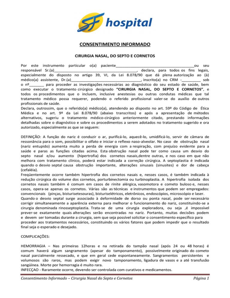 CONSENTIMENTO INFORMADO CIRURGIA NASAL, DO SEPTO E CORNETOS Por este instrumento particular o(a) paciente_____________________________________ou seu responsável Sr.(a)_______________________________________, declara, para todos os fins legais, especialmente do disposto no artigo 39, VI, da Lei 8.078/90 que dá plena autorização ao (à) médico(a) assistente, Dr.(a)_________________________________, inscrito(a) no CRM -_________ sob o nº_______ para proceder as investigações necessárias ao diagnóstico do seu estado de saúde, bem como executar o tratamento cirúrgico designado “CIRURGIA NASAL, DO SEPTO E CORNETOS”, e todos os procedimentos que o incluem, inclusive anestesias ou outras condutas médicas que tal tratamento médico possa requerer, podendo o referido profissional valer-se do auxílio de outros profissionais de saúde. Declara, outrossim, que o referido(a) médico(a), atendendo ao disposto no art. 59º do Código de Ética Médica e no art. 9º da Lei 8.078/90 (abaixo transcritos) e após a apresentação de métodos alternativos, sugeriu o tratamento médico-cirúrgico anteriormente citado, prestando informações detalhadas sobre o diagnóstico e sobre os procedimentos a serem adotados no tratamento sugerido e ora autorizado, especialmente as que se seguem: DEFINIÇÃO: A função do nariz é conduzir o ar, purificá-lo, aquecê-lo, umidificá-lo, servir de câmara de ressonância para o som, possibilitar o olfato e iniciar o reflexo naso-alveolar. No caso de obstrução nasal (nariz entupido) aumenta muito a perda de energia com a respiração, com prejuízo evidente para a saúde e paras as funções citadas acima. Esta obstrução nasal pode ter como causa um desvio do septo nasal e/ou aumento (hipertrofia) dos cornetos nasais,dentre outras, e nos caso em que não melhora com tratamento clínico, poderá estar indicada a correção cirúrgica. A septoplastia é indicada quando o desvio septal causa obstrução importante, alterações sinusais (sinusites) e dor de cabeça (cefaléia). Freqüentemente ocorre também hipertrofia dos cornetos nasais e, nesses casos, é também indicada à redução cirúrgica do volume dos cornetos, porturbinectomia ou turbinoplastia. A hipertrofia isolada dos cornetos nasais também é comum em casos de rinite alérgica, vasomotora e cometo buloso e, nesses casos, opera-se apenas os cornetos. Várias são as técnicas e instrumentos que podem ser empregados: convencionais (pinças, bisturisetesouras), bisturiselétricos, eletrônicos, endoscópios, microscópio e laser. Quando o desvio septal surge associado à deformidade de dorso ou ponta nasal, pode ser necessário corrigir simultaneamente a aparência externa para melhorar o funcionamento do nariz, constituindo-se a cirurgia denominada rinosseptoplastia. Trata-se de uma cirurgia exploradora, ou seja ,é impossível prever-se exatamente quais alterações serão encontradas no nariz. Portanto, muitas decisões podem e devem ser tomadas durante a cirurgia, sem que seja possível solicitar o consentimento específico para proceder aos tratamentos necessários, constituindo os vários fatores que podem impedir que o resultado final seja o esperado e desejado. COMPLICAÇÕES: HEMORRAGIA – Nas primeiras 12horas e na retirada do tampão nasal (após 24 ou 48 horas) é comum haverá algum sangramento (apesar do tamponamento), possivelmente originado do cometo nasal parcialmente ressecado, e que em geral cede espontaneamente. Sangramentos persistentes e volumosos são raros, mas podem exigir novo tamponamento, ligadura de vasos e a até transfusão sangüínea. Morte por hemorragia é muito rara. INFECÇAO - Raramente ocorre, devendo ser controlada com curativos e medicamentos. Consentimento Informado – Cirurgia Nasal do Septo e Cornetos Página 1 ABCESSO SEPTAL E HEMATOMA – Poderá ocorrer em raros casos, exigindo drenagem. PERFURAÇAO SEPTAL – E rara, podendo necessitar de reparo cirúrgico. SINEOUIAS – São aderências que podem ocorrer entre a parede lateral e medial do nariz. São desfeitas com curativos e raramente exigem outra intervenção cirúrgica. Lei 8.078de11/09/1990- Código Brasileiro de Defesa do Consumidor: Art. 90- O fornecedor de produtos ou serviços potencialmente perigosos à saúde ou segurança deverá informar,de maneira ostensiva e adequada, a respeito da sua nocividade ou periculosidade, sem prejuízo da adoção de outras medidas cabíveis em cada caso concreto. Art. 390 - E vedado ao fornecedor de produtos ou serviços dentre outras práticas abusivas: VI- executar serviços sem a prévia elaboração de orçamento e autorização expressa do consumidor, ressalvadas as decorrentes de práticas anteriores entre as partes. RECIDIVA DOS DESVIOS- Em técnicas muito conservadoras, principalmente em crianças,a cartilagem poderá voltar parcialmente à posição ou forma anterior por vezes Necessitando reintervenção. Assim, podem ser necessários retoques cirúrgicos em casos de pacientes operados de septo, do dorsoe/ou da ponta nasal. RECIDIVA DA HIPERTROFIA DOS CORNETOS – Em casos de rinopatia alérgica intensa, a mucosa remanescente poderá sofrer hipertrofia, raramente necessitando reoperação. SINUSITE- E uma complicação pós-operatória possível,(secundária ao tamponamento nasal), cedendo espontaneamente ou com o uso de medicamentos antibióticos. HEMATOMA DEFACE, LÁBIO SUPERIOR E PALATO - Pode ocorrer em cirurgias nasais mais extensas, e cede em alguns dias. CID J34.2 + J34.3 Infecção hospitalar: A portaria nº. 2.616, de 12/05/1998 do Ministério da Saúde estabeleceu as normas do Programa de Controle de Infecção Hospitalar (PCIH), obrigando os hospitais a constituir a CCIH (Comissão de Controle de Infecção Hospitalar). Os índices de infecção hospitalar aceitos são estabelecidos, usando-se como parâmetro o NNIS (National Nosocomial Infectores Surveillance – Vigilância Nacional Nosocomial de Infecção), órgão intern