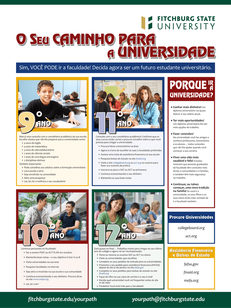 O Seu CAMINHO PARA a UNIVERSIDADE Sim, VOCÊ PODE ir a faculdade! Decida agora ser um futuro estudante universitário. PORQUE IR A UNIVERSIDADE? ° 9 ANO Marca uma consulta com o conselheiro acadêmico da sua escola. Escolhe classes que vão lhe preparar para a universidade como: •4 anos de inglês •4 anos de matemática •3 anos de ciência/laboratório •2 anos de ciências sociais •2 anos de uma língua estrangeira •2 disciplinas eletivas Também importante: •Pede conselhos aos adultos sobre a formação universitária •Leva escola a sério •Seja envolvido na comunidade •Abre uma poupança •Ler, ler, ler e melhora o seu vocabulário! ° 11 •Ganhar mais dinheiro! Um 11 diploma universitário vai quase dobrar o seu salário anual. ANO Consulte com o seu conselheiro acadêmico! Confirme que os seus cursos estão certos e procure conselho sobre o que você precisa para chegar a universidade. •Procura feiras universitários na área •Agora é a hora de escolher as suas 5 faculdades preferidas •Assista uma noite de assistência financeira na sua escola •Pesquisa bolsas de estudo na site finaid.org •Visite a site collegeboard.org ou act.org no outono para fazer uns exames de prática •Inscreva-se para o SAT ou ACT na primavera •Continua economisando o seu dinheiro •Mantenha as suas boas notas •Ter mais oportunidades! Um diploma universitário lhe dar mais opções de trabalho. •Fazer conexões! Na universidade você faz amigos e conhece professores, funcionários e ex-alunos… todos conexões que vão lhe ajudar quando você começar a sua carreira. •Viver uma vida mais saudável e feliz! Estudos mostram que pessoas graduados da faculdade têm conexões mais fortes a comunidades e a famílias, e também têm mais segurança no trabalho. •Continuar, ou talvez começar, uma nova tradição na família! Se você ir a universidade, os seus filhos e os seus netos terão mais vontade de ir a facultade também. ° 10 10 ANO Continua pensando na faculdade! •Faz o exame PSAT ou ACT PLAN em outubro •Mantenha boas notas—o seu objetivo é tirar A ou B •Visita universidades na sua area •Pesquisa faculdades na internet •Seja ativo e involvido na sua escola e sua comunidade •Continua economisando o seu dinheiro. Procura dicas na site www.mefa.org •Ler, ler e ler! ° 12 12 Procure Universidades collegeboard.org ANO Está quase no final… Trabalhou muito para chegar ao seu último ano do colégio e agora vai ser recompensado. •Toma ou retoma os exames SAT ou ACT no otono •Visite as universidades que escolheu •Complete os seus pedidos de entrada para as universidades •Preencha o seu pedido para assistência financeira (FAFSA) depois do dia 01 de janeiro na site fafsa.gov •Complete os seus pedidos para bolsas de estudo na site finaid.org •Fique de olho na sua caixa de correio e o seu e-mail •Decida qual universidad você vai frequenter antes do dia 01 de maio •Parabéns! Vocé está indo para a faculdade! fitchburgstate.edu/yourpath act.org Assistência Financeira e Bolsas de Estudo fafsa.gov finaid.org mefa.org [email protected]
